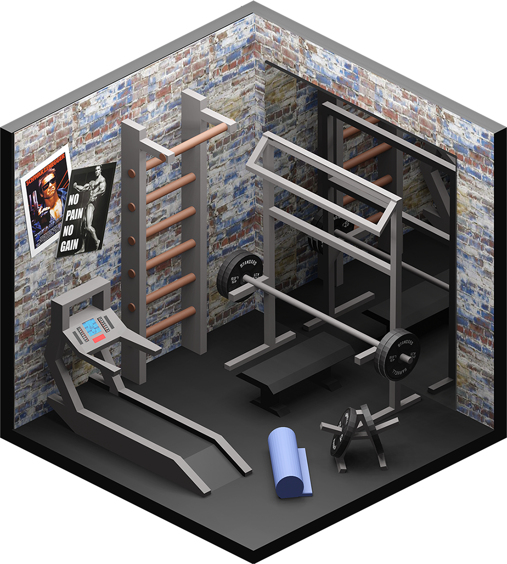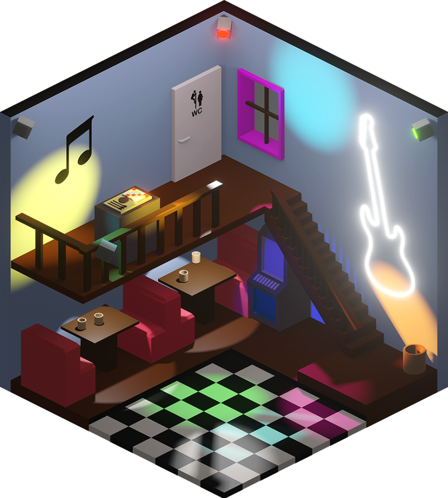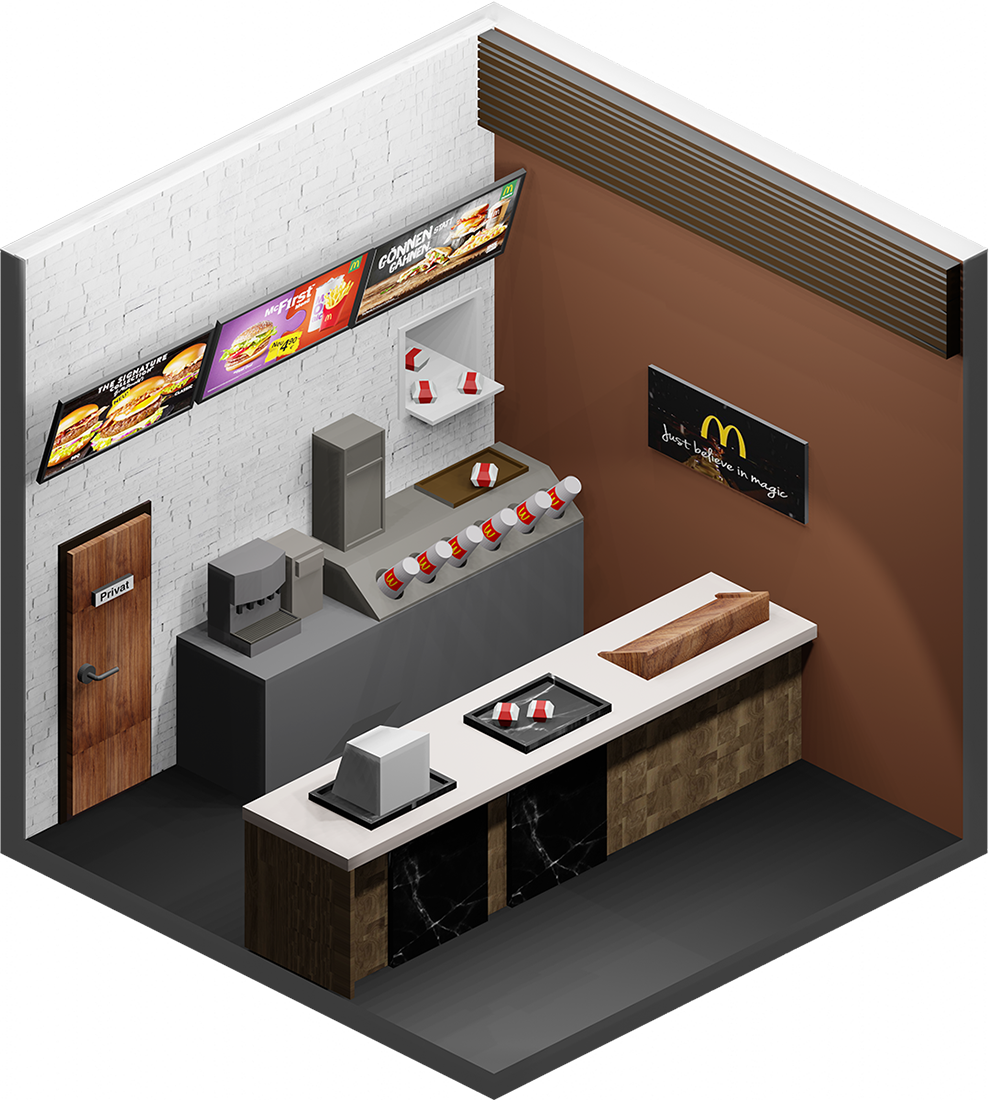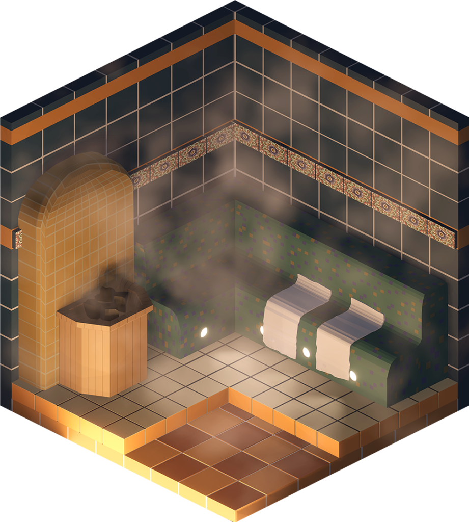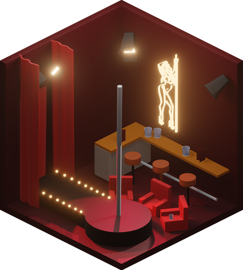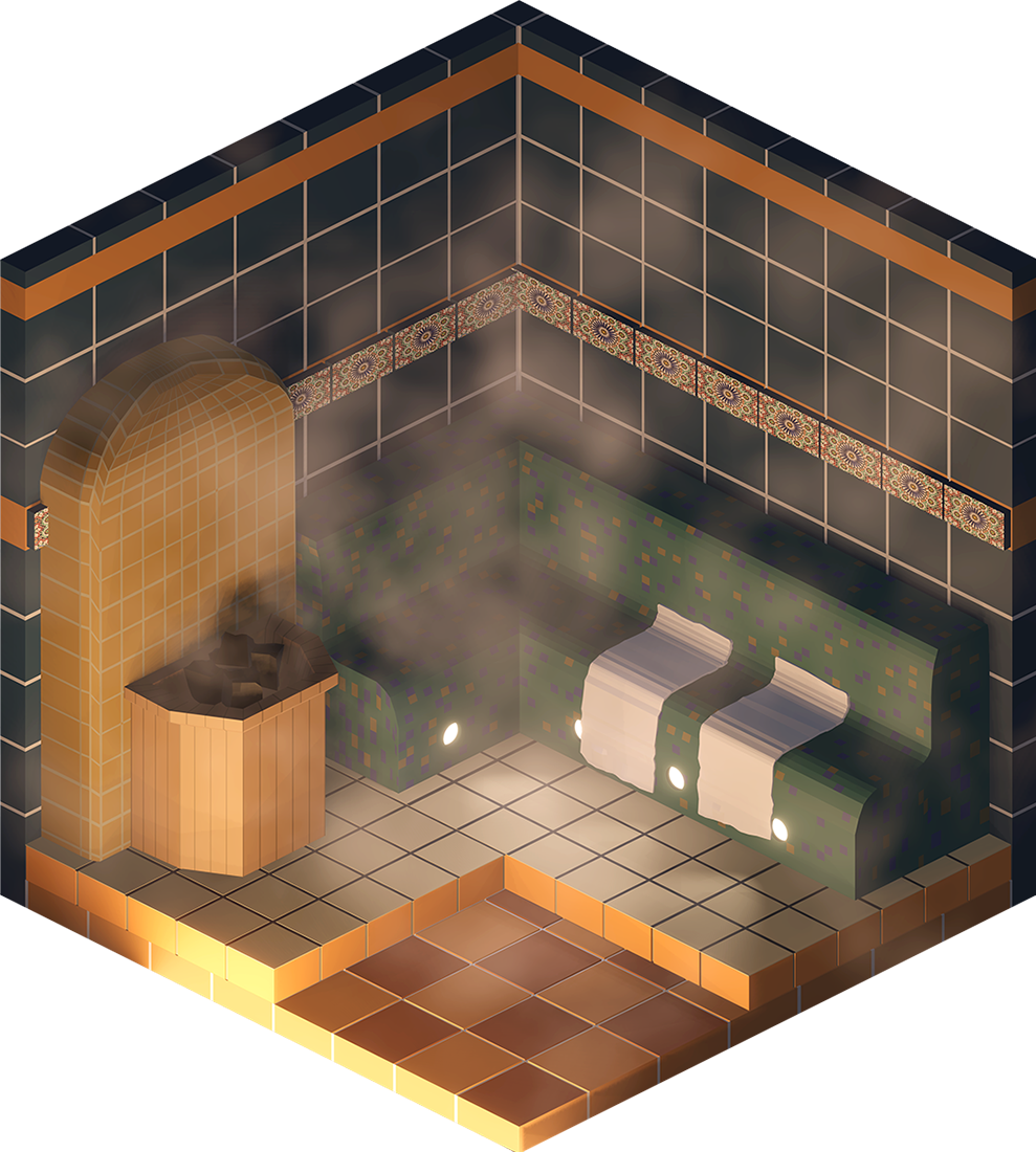 Inhaltlich kamen dabei viele unterschiedliche Ideen zum Vorschein, vom Fitnesscenter, über Bars und Cafés bis hin zur Sauna. Formal renderten wir die Ergebnisse in Parallelperspektive, wodurch einheitliche Hexagone entstanden, die wir wie Bienenwaben an der Wand arrangieren konnten.