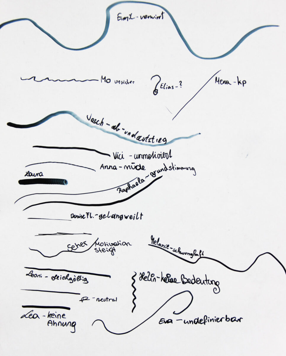 Ausgehend von rhytmisch-linearen Fingerübungen reflektieren die SchülerInnen nicht nur Form und Qualität der Linie an sich, sondern erkennen die Wirksamkeit des entstehenden Weißraums als Element der Gestaltung. Von der Wahrnehmung der Linie in der Bildkomposition bis zu einer linearen Sammlung, die wir das “Psychogramm der Linie“ nennen, tasten wir uns an die vielseitige Aussagekraft des Strichs heran.
