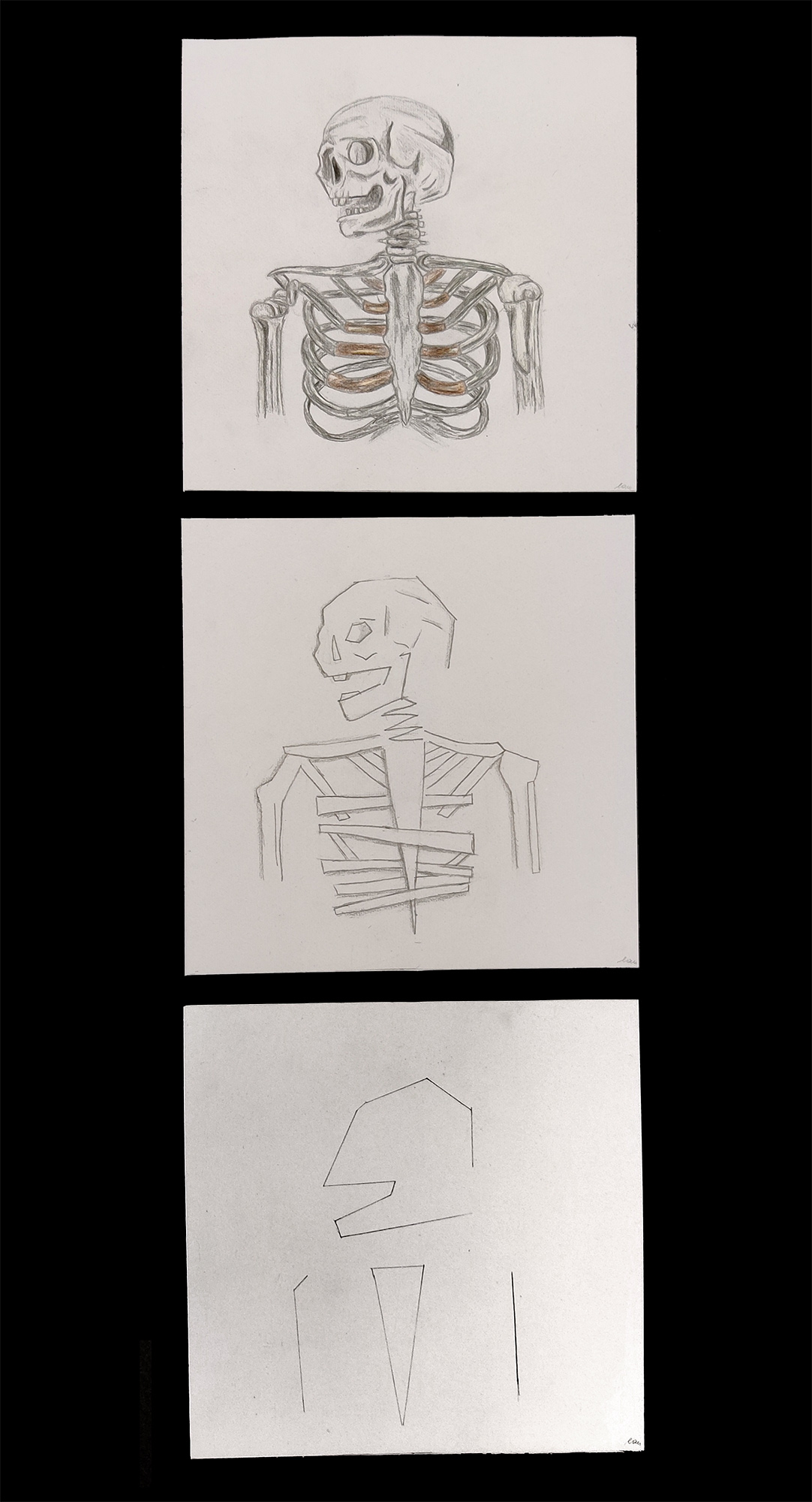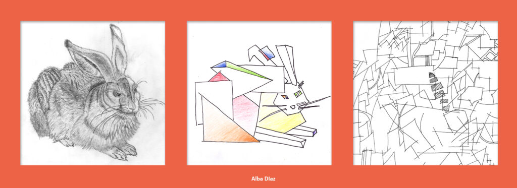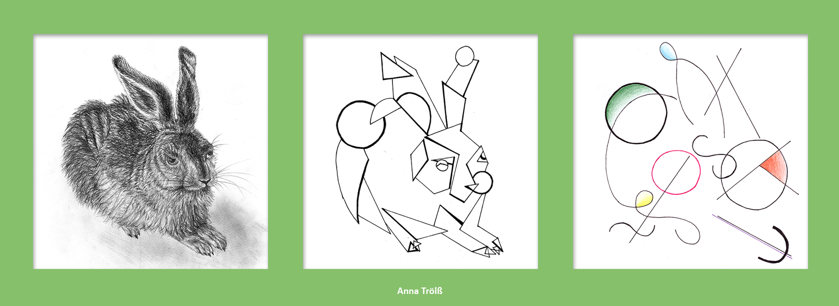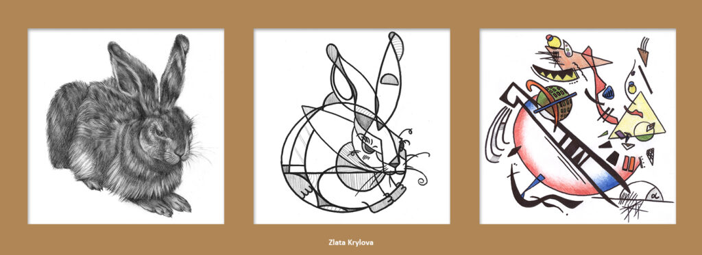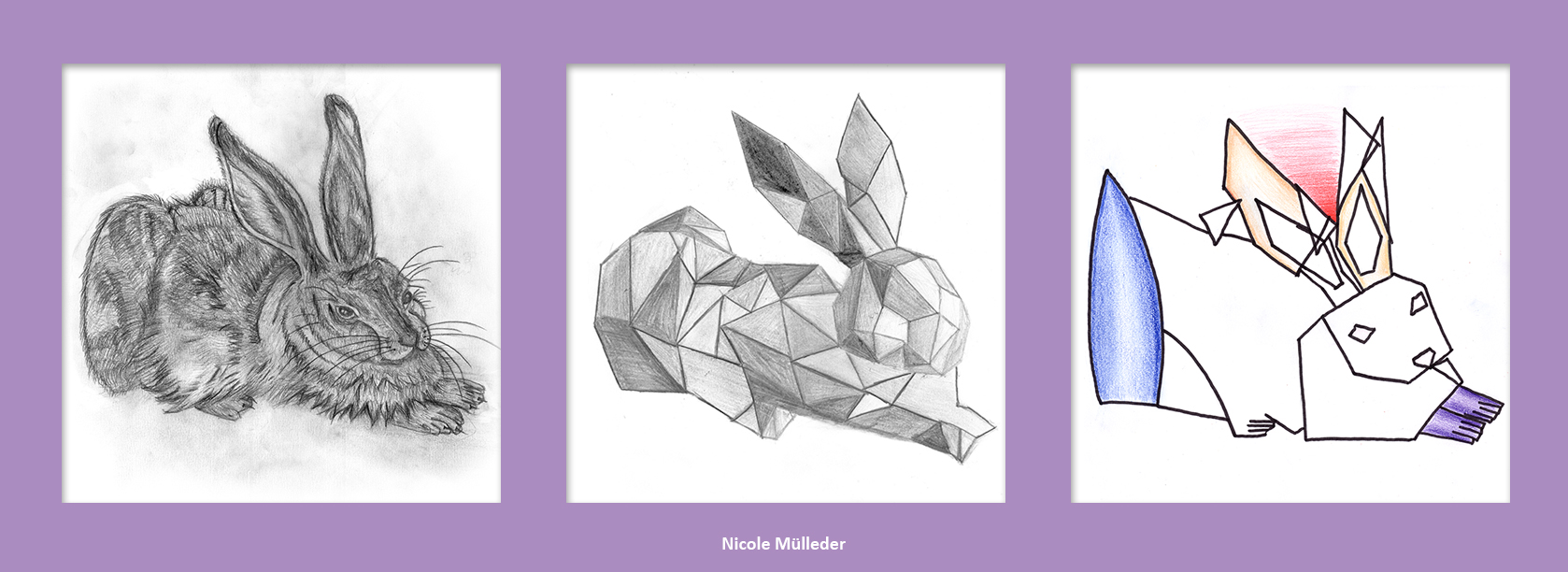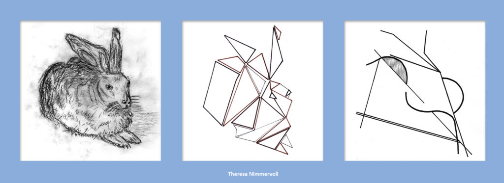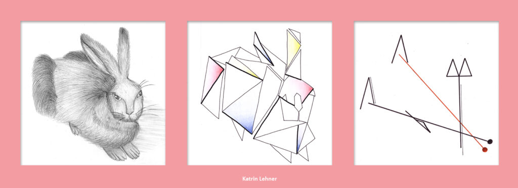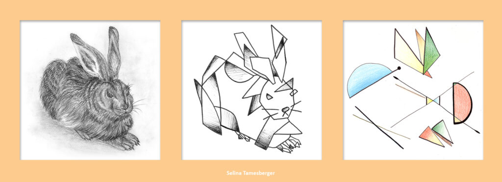 Da wir uns zu dieser Zeit kunstgeschichtlich gerade mit Abstraktion und der Epoche des Kubismus beschäftigten, kombinierten wir die beiden Aufgaben. Entstanden sind Abstraktionsreihen, bestehend aus jeweils drei Bildern, die den Hasen, ausgehend von einer möglichst realistischen Darstellung, immer weiter verfremden.