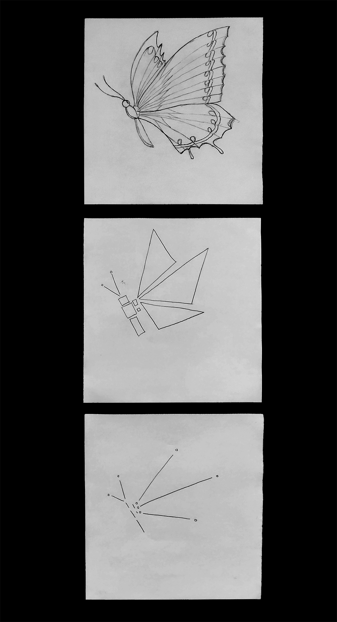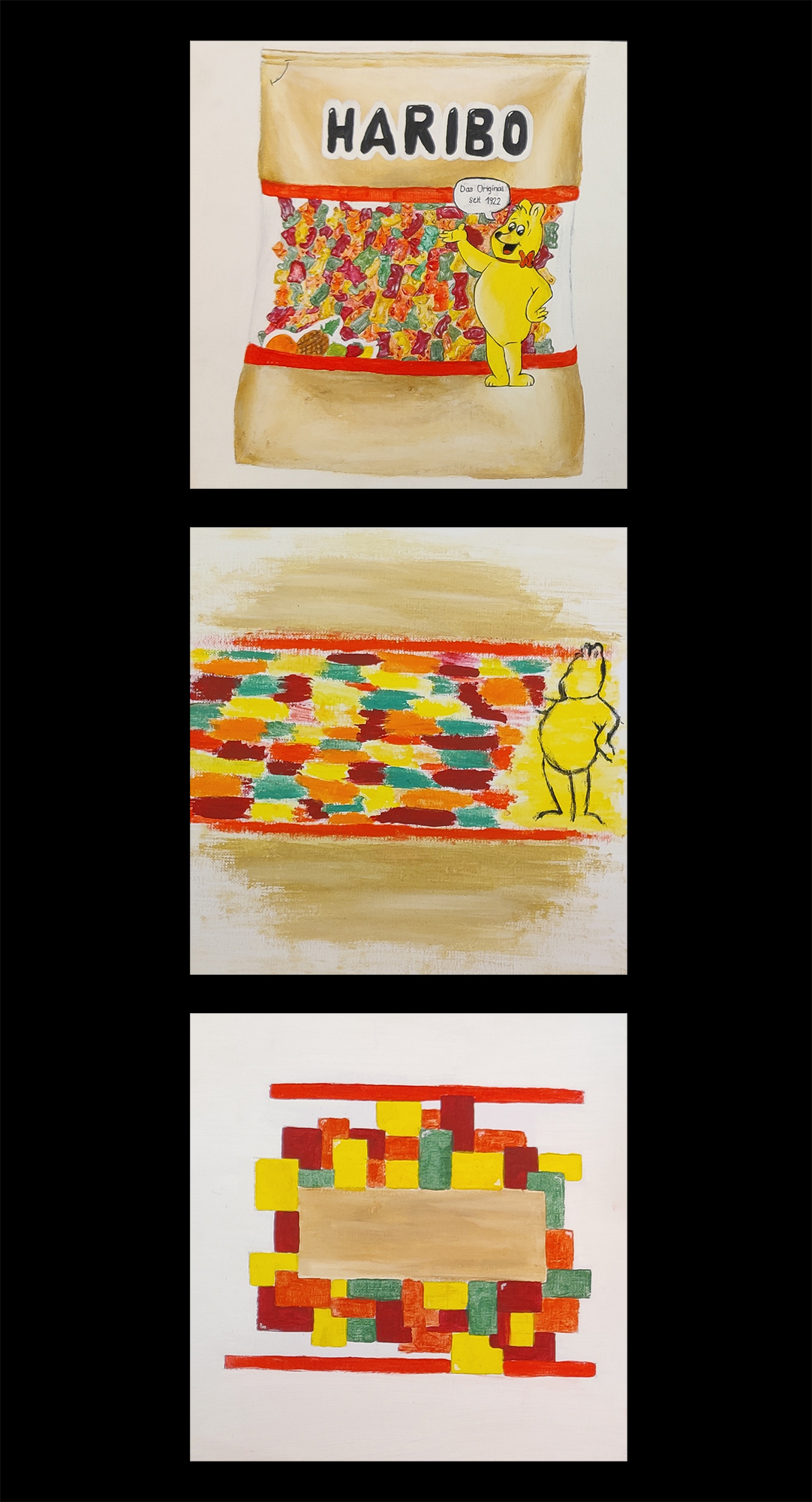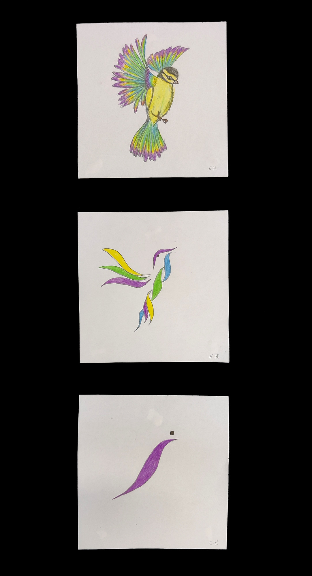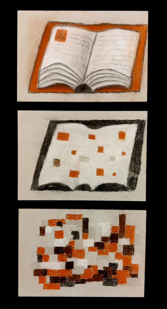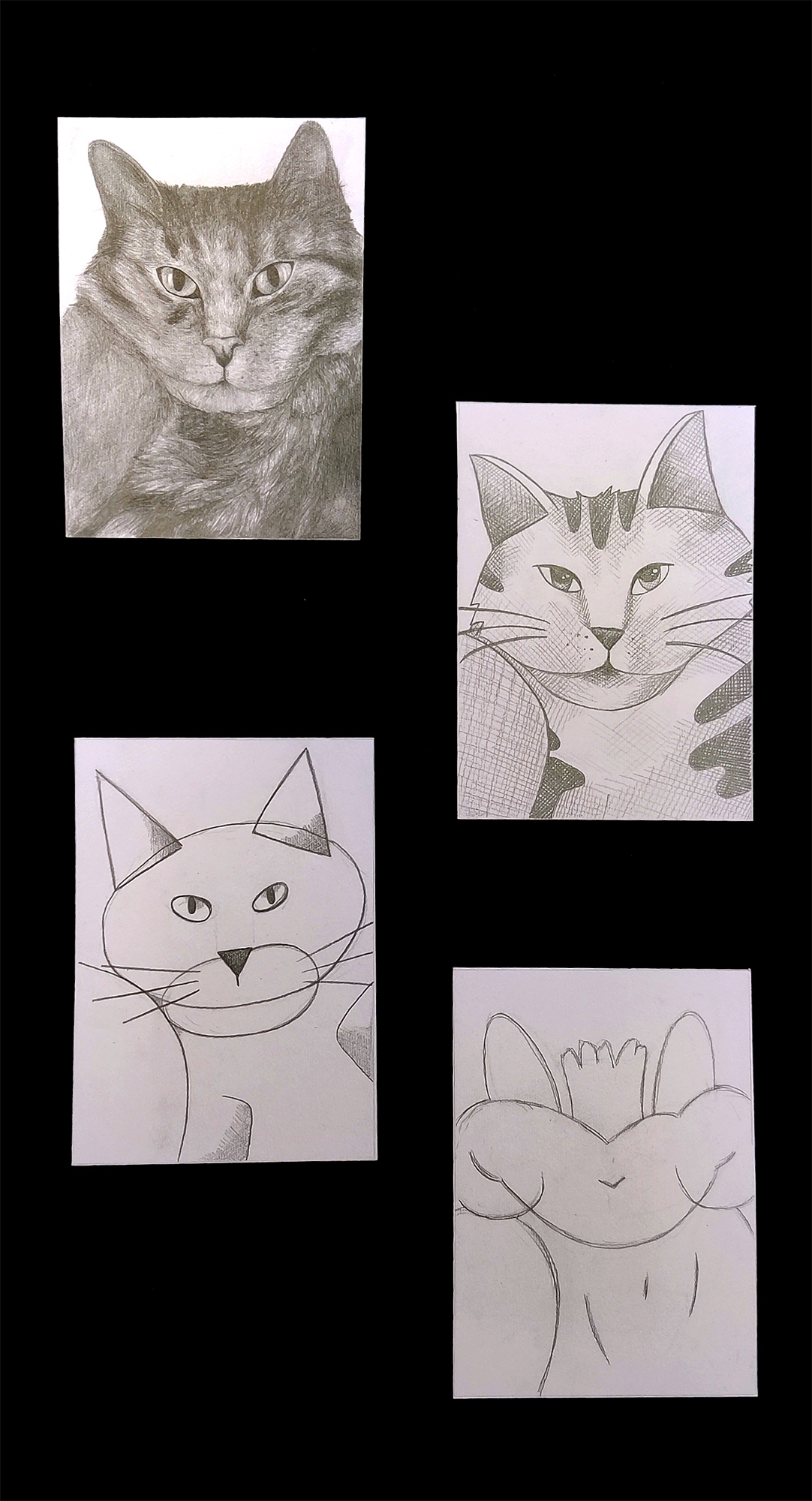Da wir uns zu dieser Zeit kunstgeschichtlich gerade mit Abstraktion und der Epoche des Kubismus beschäftigten, kombinierten wir die beiden Aufgaben. Entstanden sind Abstraktionsreihen, bestehend aus jeweils drei Bildern, die den Hasen, ausgehend von einer möglichst realistischen Darstellung, immer weiter verfremden.