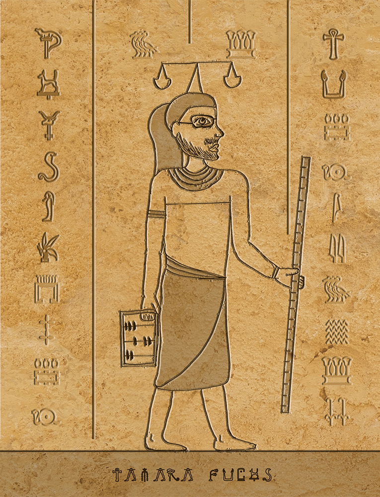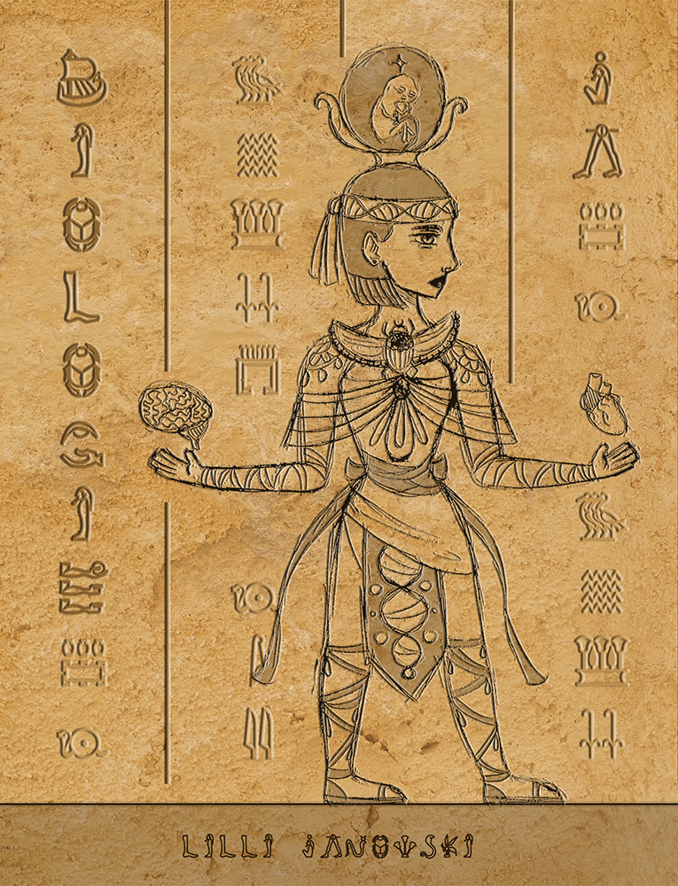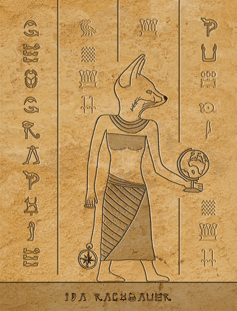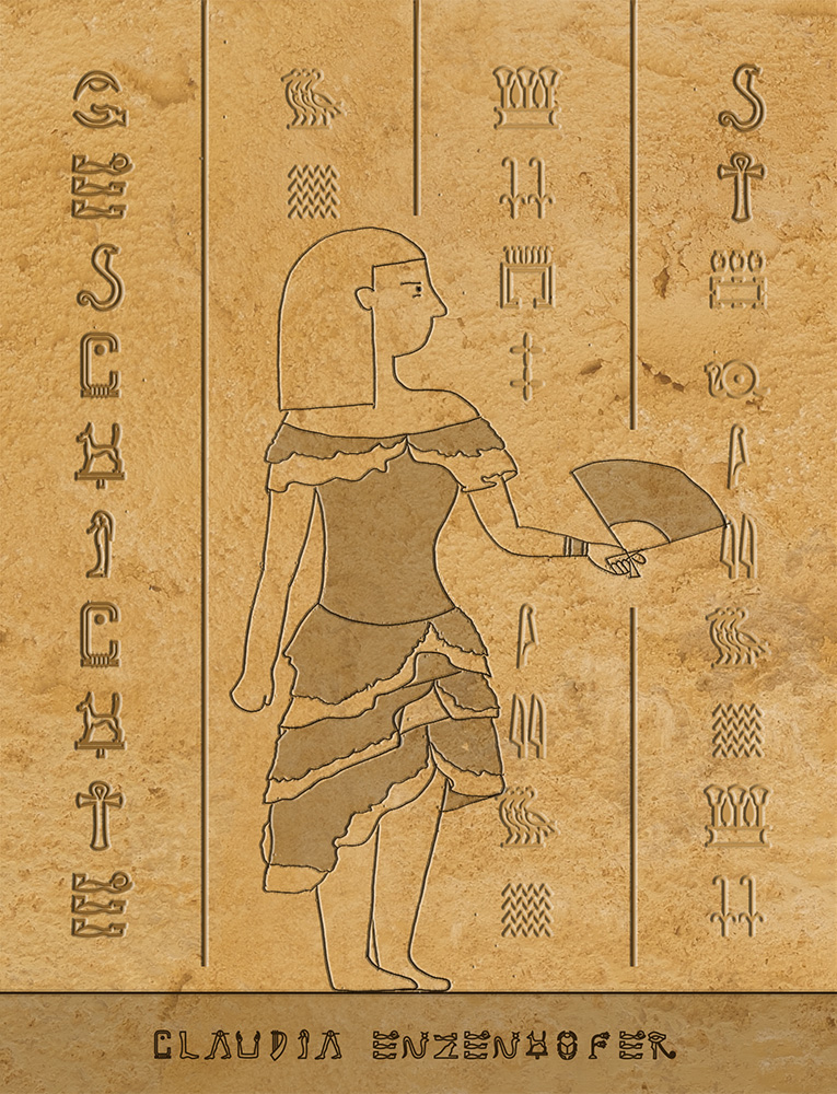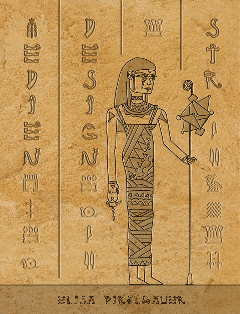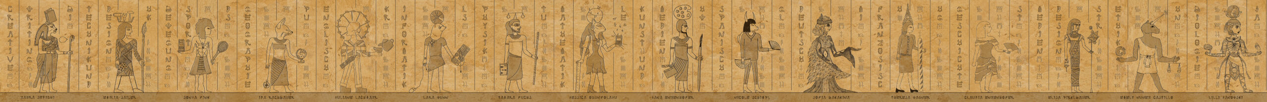 Angelehnt an diese formalen Vorgeben, wählte jede Schülerin der 5C eine Person aus unserem Lehrkörper und überlegt wie diese Lehrperson als ägyptische Gottheit ausgesehen hätte. Den fertigen Zeichnungen verpassten wir mittels Filtern die Anmutung eines Wandreliefs und fügten sie zu einem langen Schmuckband zusammen, das man in dieser Form auch in einem alten Tempel finden hätte können.