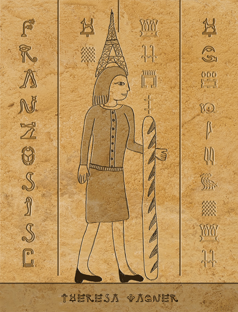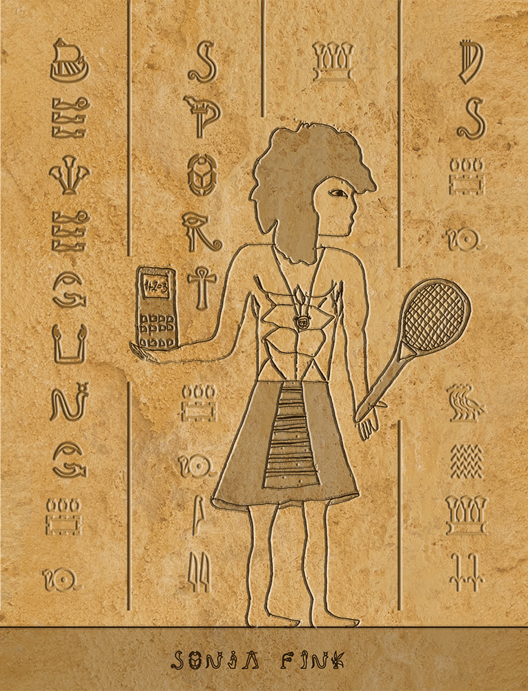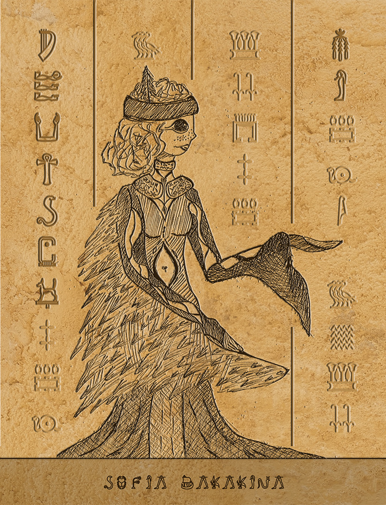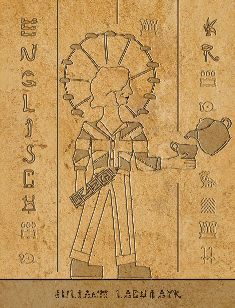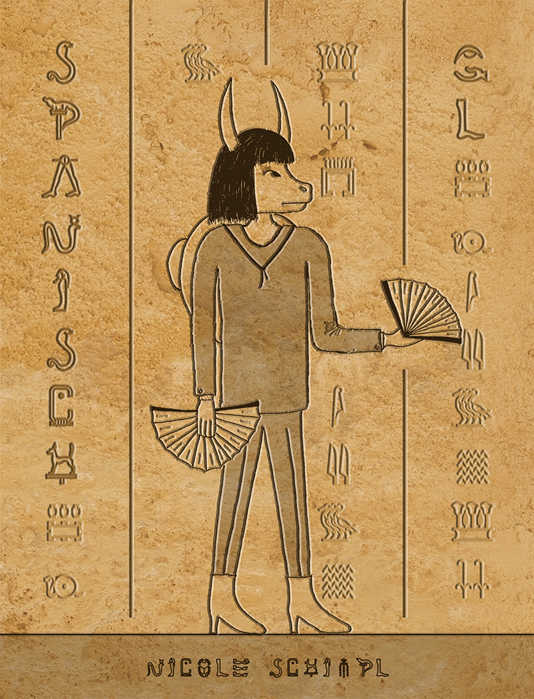 Angelehnt an diese formalen Vorgeben, wählte jede Schülerin der 5C eine Person aus unserem Lehrkörper und überlegt wie diese Lehrperson als ägyptische Gottheit ausgesehen hätte. Den fertigen Zeichnungen verpassten wir mittels Filtern die Anmutung eines Wandreliefs und fügten sie zu einem langen Schmuckband zusammen, das man in dieser Form auch in einem alten Tempel finden hätte können.