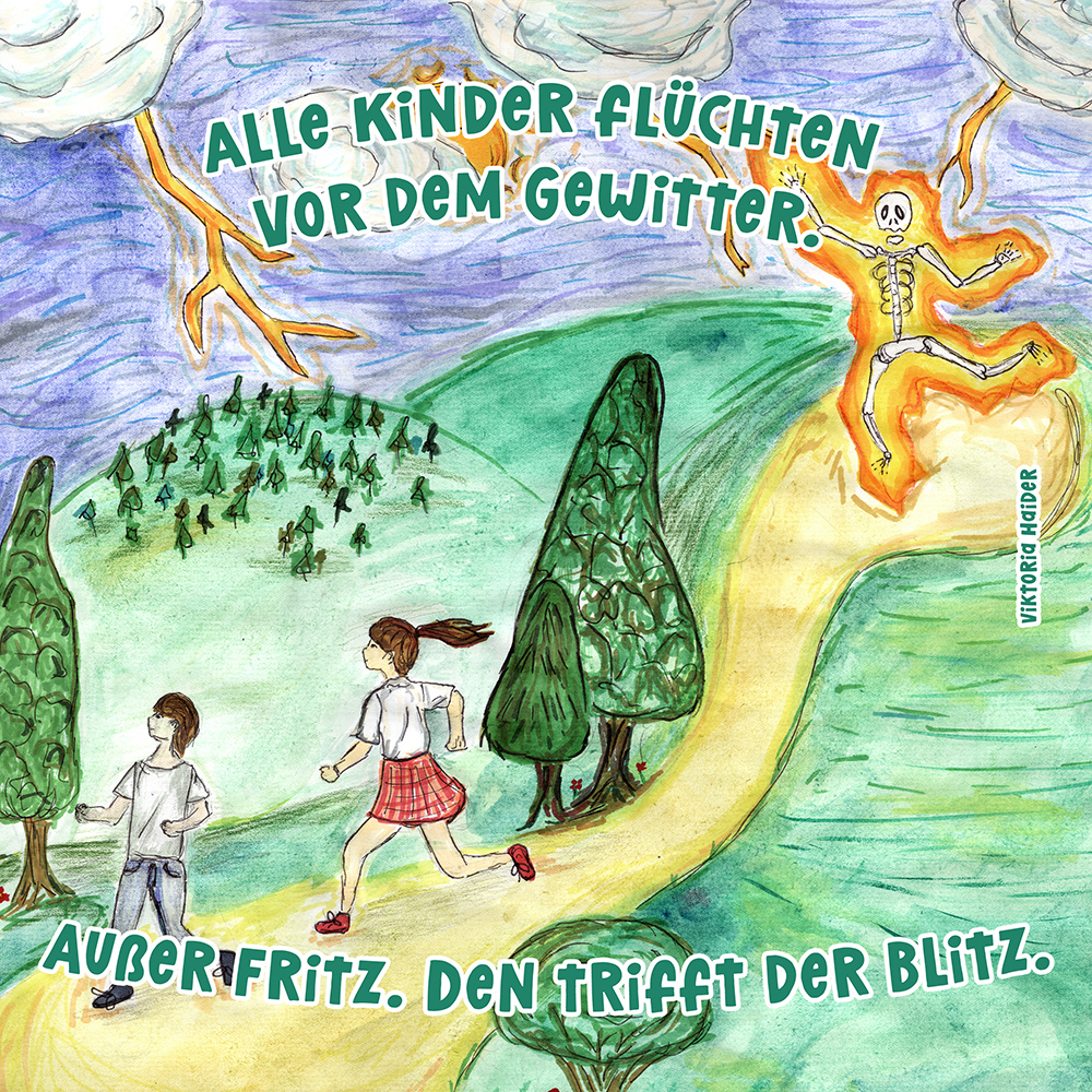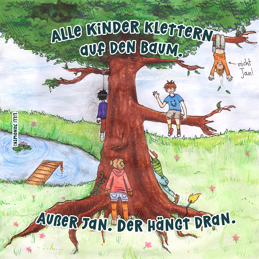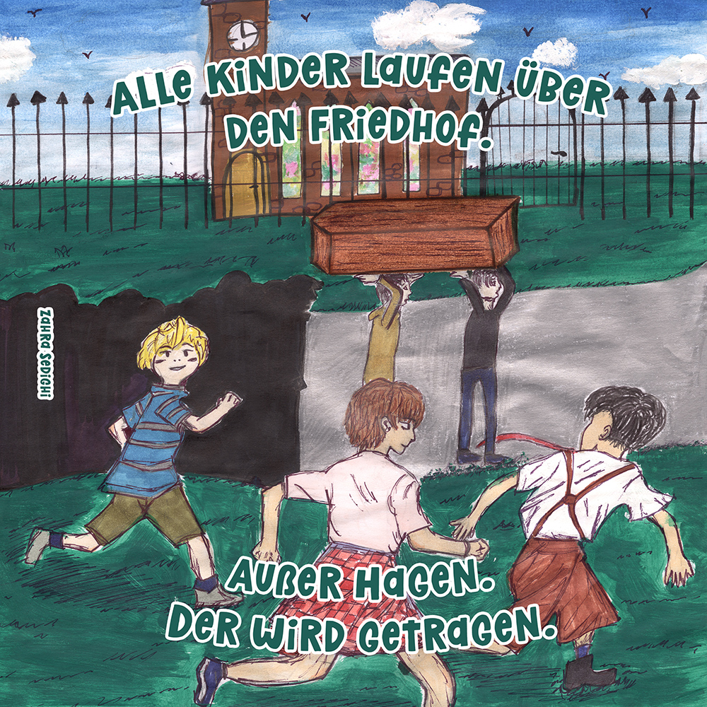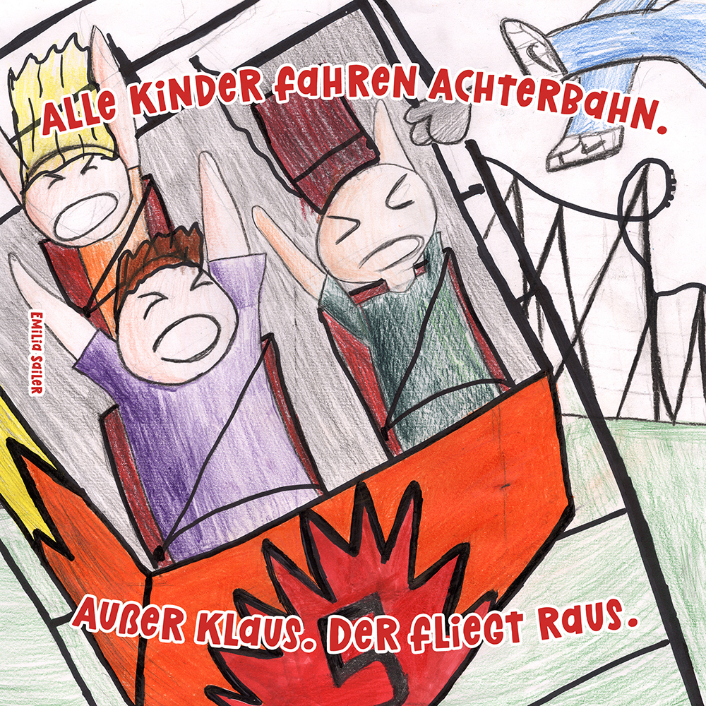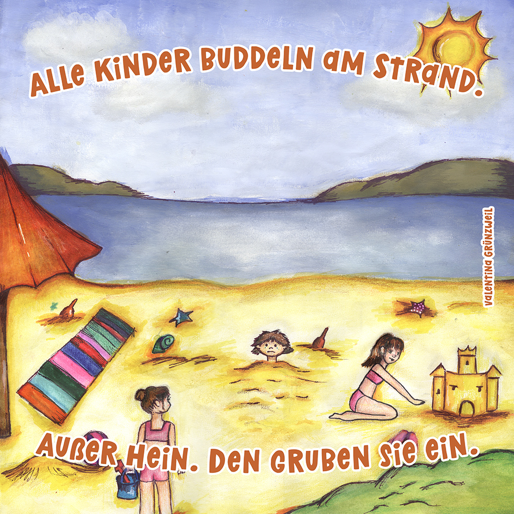 Allen Reimen gemein ist der einheitliche Beginn. Stets erleben “Alle Kinder” eine besondere Situation, bis auf ein Kind, das auf meist tragische Weise eine Sonderstellung einnimmt. Für die Illustrationen durften die Schülerinnen und Schüler auf beliebiges Werkzeug zurückgreifen. So entstanden neben einfachen Farbstift-Zeichnungen oder Filzstift. Bildern auch mittels Acrylfarben erstellte Gemälde. Ein bunter Mix, genauso abwechslungsreich wie die Geschichten.