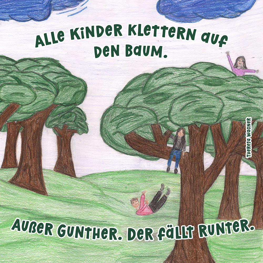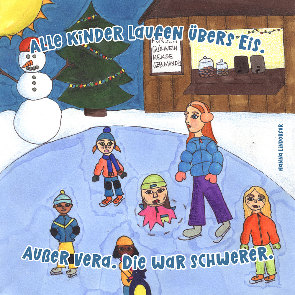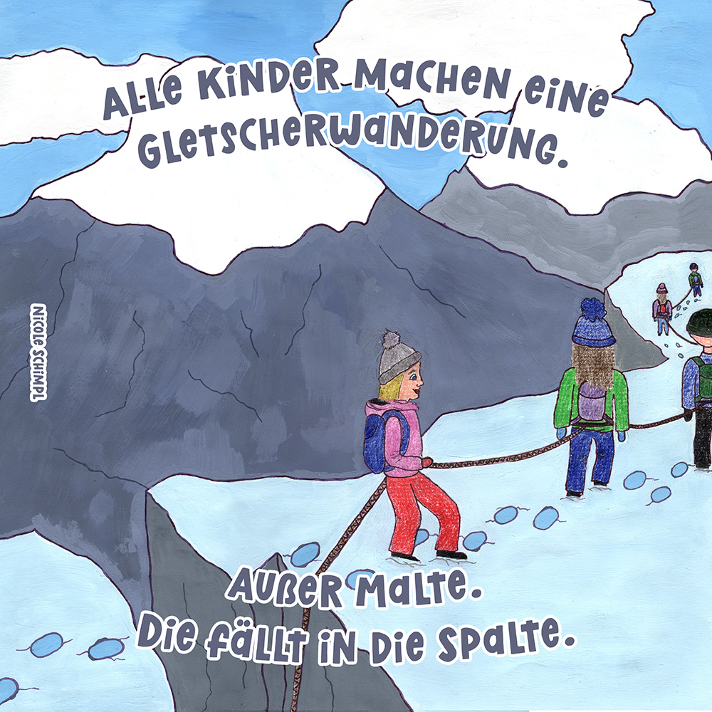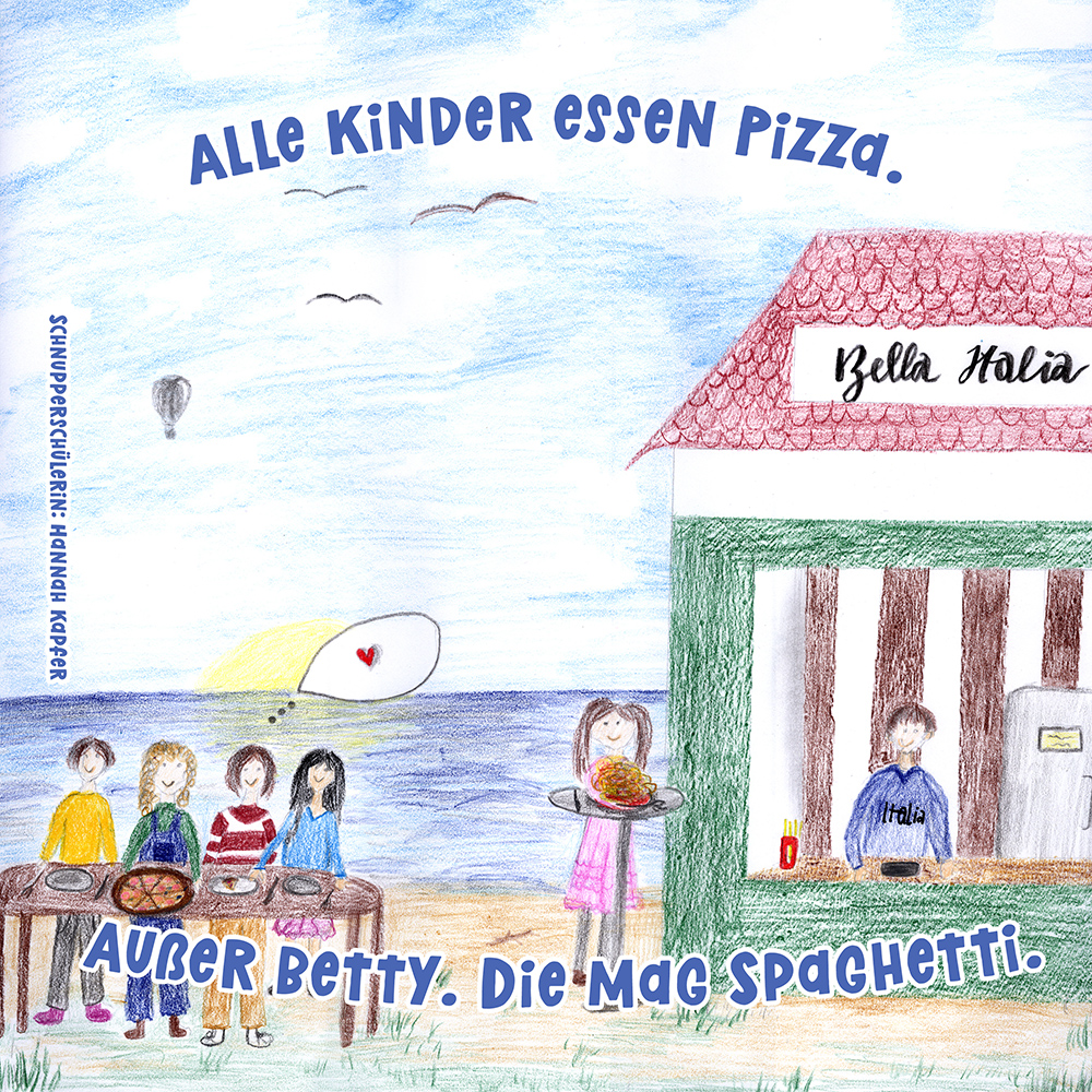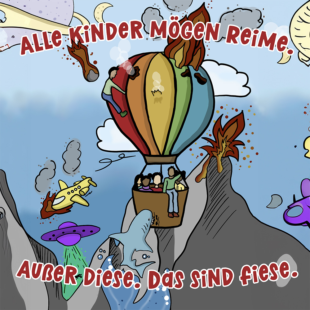 Allen Reimen gemein ist der einheitliche Beginn. Stets erleben “Alle Kinder” eine besondere Situation, bis auf ein Kind, das auf meist tragische Weise eine Sonderstellung einnimmt. Für die Illustrationen durften die Schülerinnen und Schüler auf beliebiges Werkzeug zurückgreifen. So entstanden neben einfachen Farbstift-Zeichnungen oder Filzstift. Bildern auch mittels Acrylfarben erstellte Gemälde. Ein bunter Mix, genauso abwechslungsreich wie die Geschichten.
