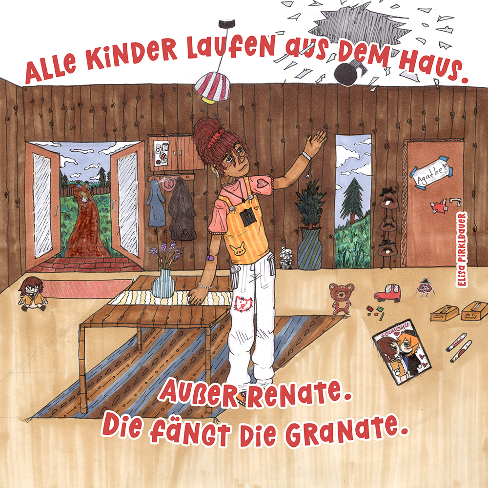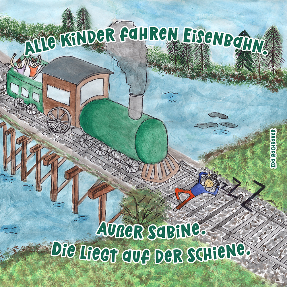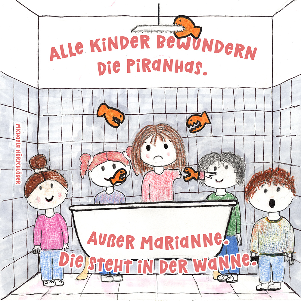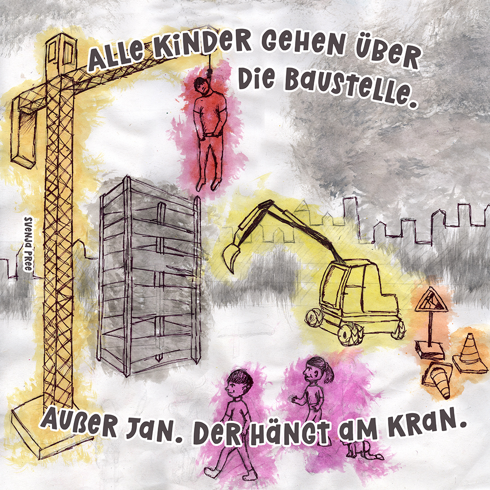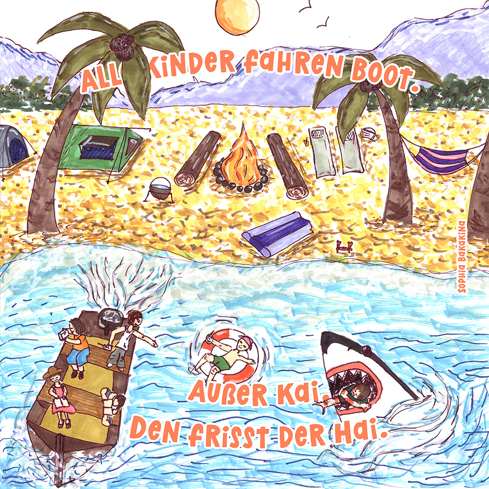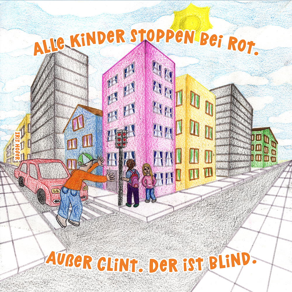 Allen Reimen gemein ist der einheitliche Beginn. Stets erleben “Alle Kinder” eine besondere Situation, bis auf ein Kind, das auf meist tragische Weise eine Sonderstellung einnimmt. Für die Illustrationen durften die Schülerinnen und Schüler auf beliebiges Werkzeug zurückgreifen. So entstanden neben einfachen Farbstift-Zeichnungen oder Filzstift. Bildern auch mittels Acrylfarben erstellte Gemälde. Ein bunter Mix, genauso abwechslungsreich wie die Geschichten.