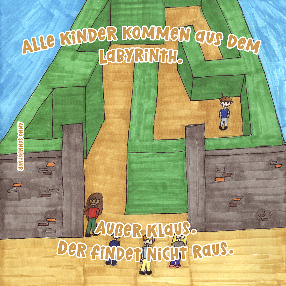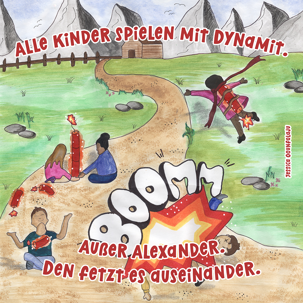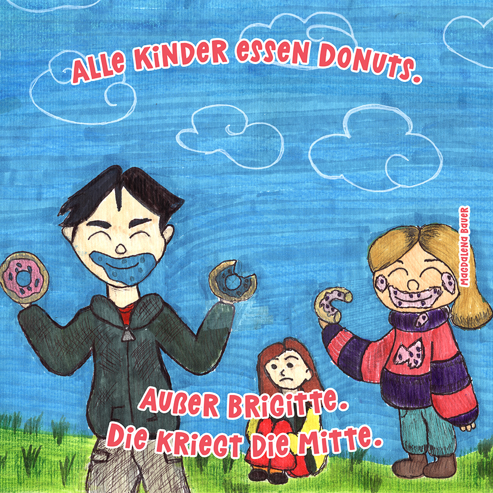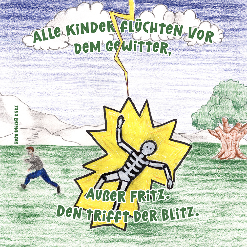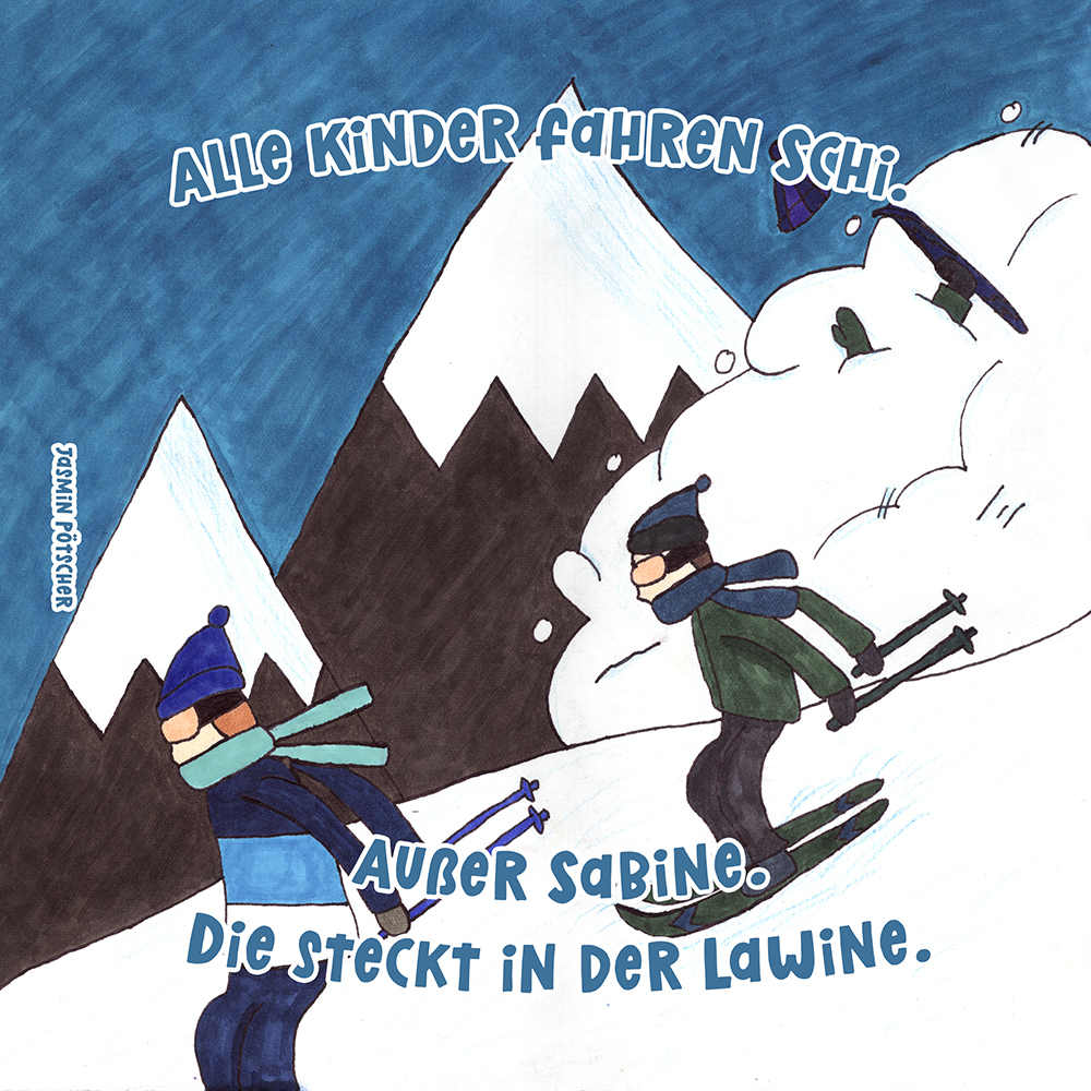 Allen Reimen gemein ist der einheitliche Beginn. Stets erleben “Alle Kinder” eine besondere Situation, bis auf ein Kind, das auf meist tragische Weise eine Sonderstellung einnimmt. Für die Illustrationen durften die Schülerinnen und Schüler auf beliebiges Werkzeug zurückgreifen. So entstanden neben einfachen Farbstift-Zeichnungen oder Filzstift. Bildern auch mittels Acrylfarben erstellte Gemälde. Ein bunter Mix, genauso abwechslungsreich wie die Geschichten.