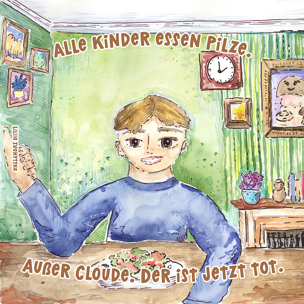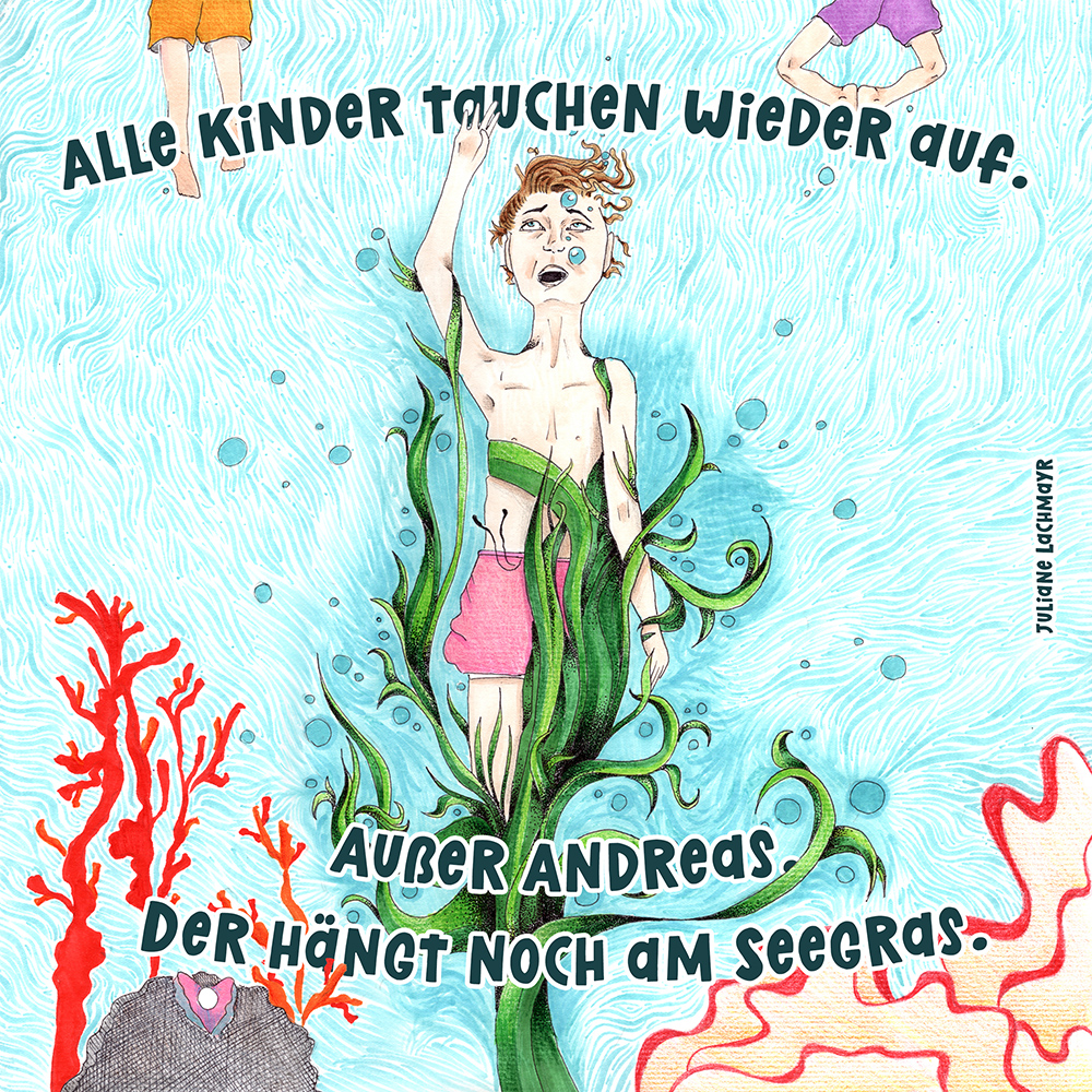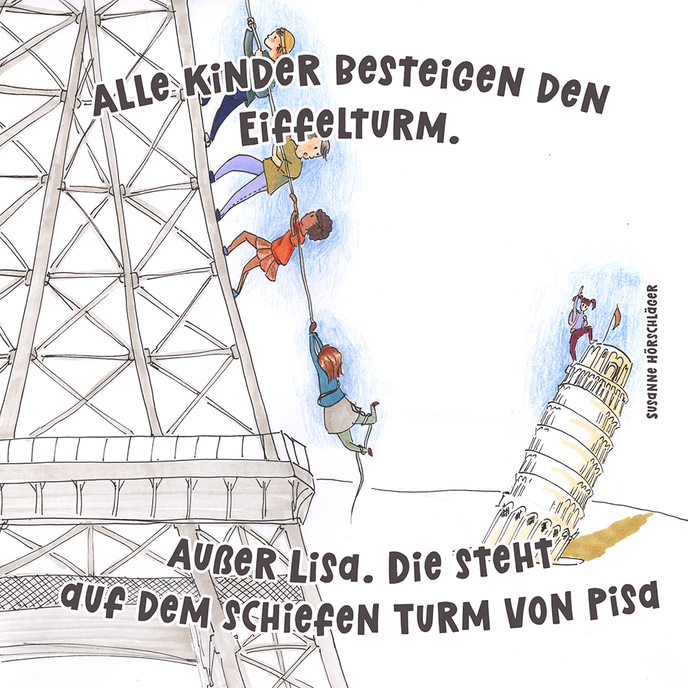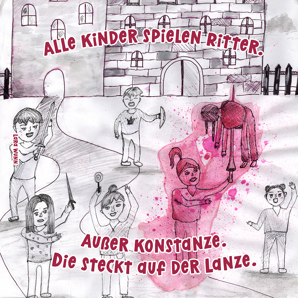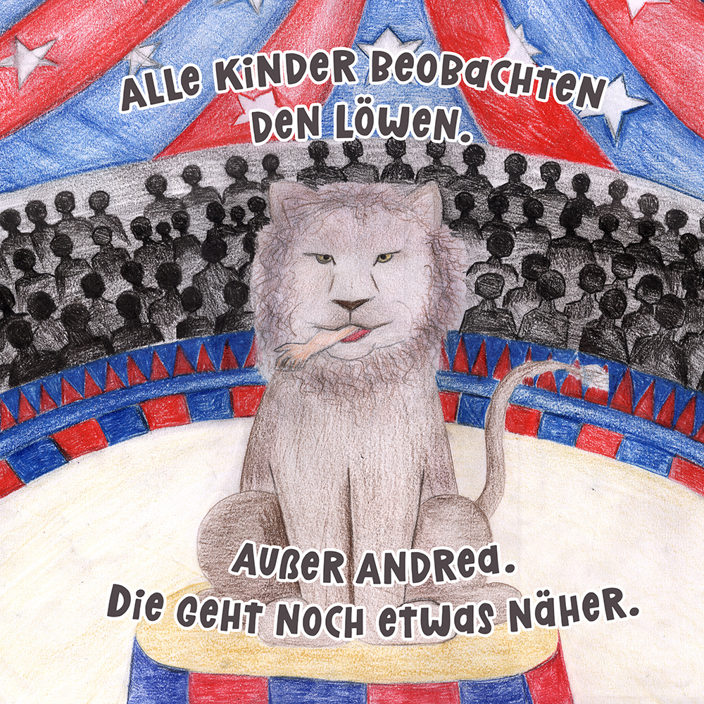 Allen Reimen gemein ist der einheitliche Beginn. Stets erleben “Alle Kinder” eine besondere Situation, bis auf ein Kind, das auf meist tragische Weise eine Sonderstellung einnimmt. Für die Illustrationen durften die Schülerinnen und Schüler auf beliebiges Werkzeug zurückgreifen. So entstanden neben einfachen Farbstift-Zeichnungen oder Filzstift. Bildern auch mittels Acrylfarben erstellte Gemälde. Ein bunter Mix, genauso abwechslungsreich wie die Geschichten.