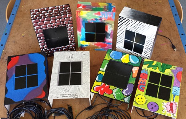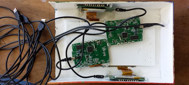Danach mussten die Bilder nur noch mittels USB-Kabel auf den internen Speicher der Platinen geladen werden. Etwa zehn Bilder fanden bei stark komprimierter Speicherweise darauf Platz. Alternativ wäre auch ein Slot für eine SD-Karte zur Verfügung gestanden. Die Bildschirme arbeiten alle mit einem Akku und können auch mit Netzanschluss betrieben werden. In letzterem Fall laufen dann eben vier USB-Kabel in den Rahmen.
