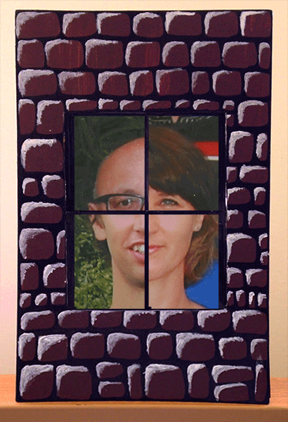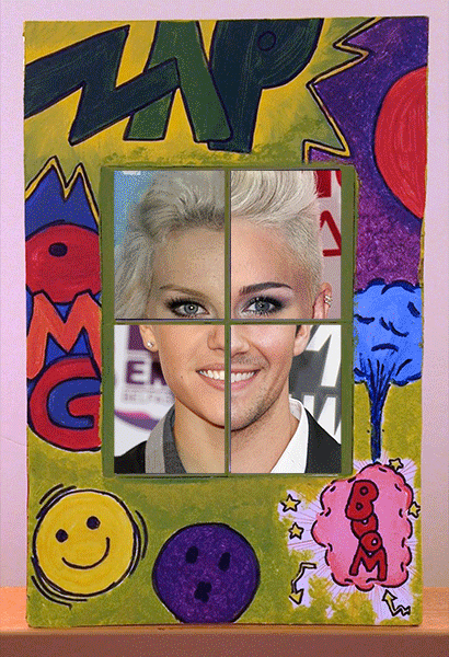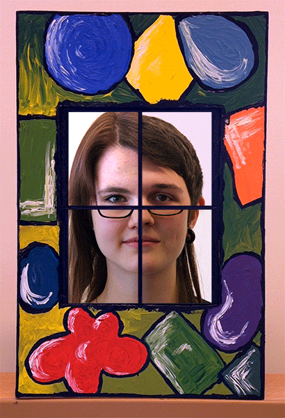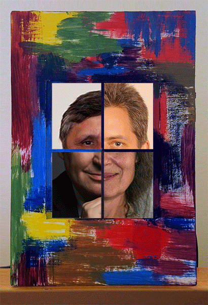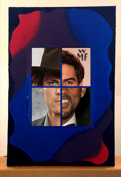 Die fertigen Rahmen wurden mittels Acrylfarben oder Aufkleben unterschiedlicher Materialien gestaltet, bevor es dann darum ging die Gesichter aufzubereiten. Jedes Team bearbeitete eine bestimmte Gruppe von Menschen und sammelte zunächst die nötigen Fotos. Danach wurden diese in Photoshop genau aufeinander abgestimmt, sodass Augen, Mund und Nase jeweils exakt an der gleichen Stelle zu liegen kamen. Jeder Rahmen sollte mit einer anderen Gruppe von Personen gefüttert werden. So kamen zum Beispiel Schauspieler, Musiker, Politiker, Schüler, aber auch Lehrer unserer Schule zum Zug.
