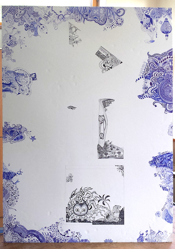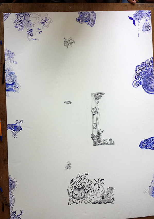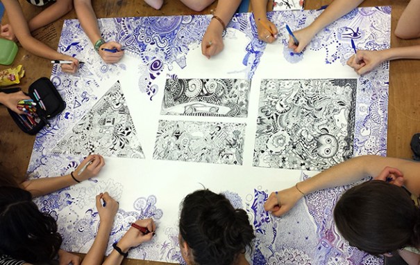 Nach unserer riesigen Graffitiwall im Vorjahr, haben wir uns wieder an ein großes Gemeinschaftsprojekt gewagt. Was als Zwischenarbeit für SchülerInnen begann, die schneller mit ihrer Arbeit fertig wurden, entwickelte sich bald zu einem wahren Mammutprojekt. Wir hatten den Red Bull Doodle Contest entdeckt und waren von vielen der eingereichten Arbeiten sehr angetan. Das wollten wir auch probieren, jedoch nicht auf einem einschränkenden Blatt Papier. Wir wollten uns ausbreiten können und griffen zu einer Hartschaumplatte mit 100x150cm.