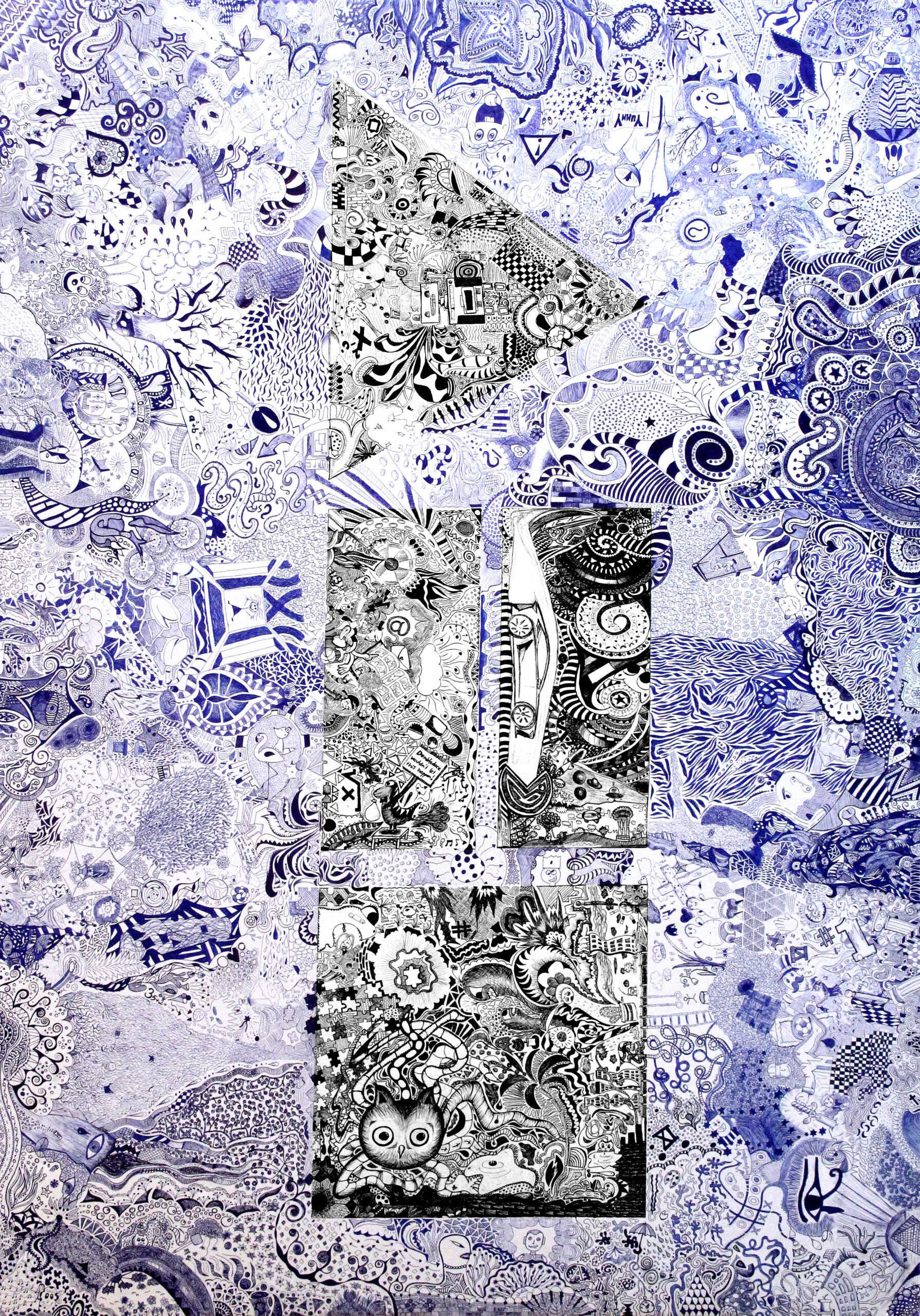 Ein Doodle ist per Definition ein „Gekritzel“ das entsteht während die Gedanken anderweitig beschäftigt sind. Die Hand arbeitet mehr oder minder selbstständig. Es galt während des Zeichens so wenig wie möglich zu hinterfragen was und warum man jetzt gerade dieses Motiv aufgreift. Eine kleine Vorgabe haben wir uns dennoch gegeben. Durch den Einsatz von blauen und schwarzen Kugelschreibern sollten die drei Play-Pause-Stop-Symbole unseres BORG-Play Logos in der Arbeit erkennbar sein.
