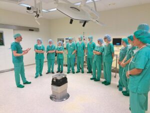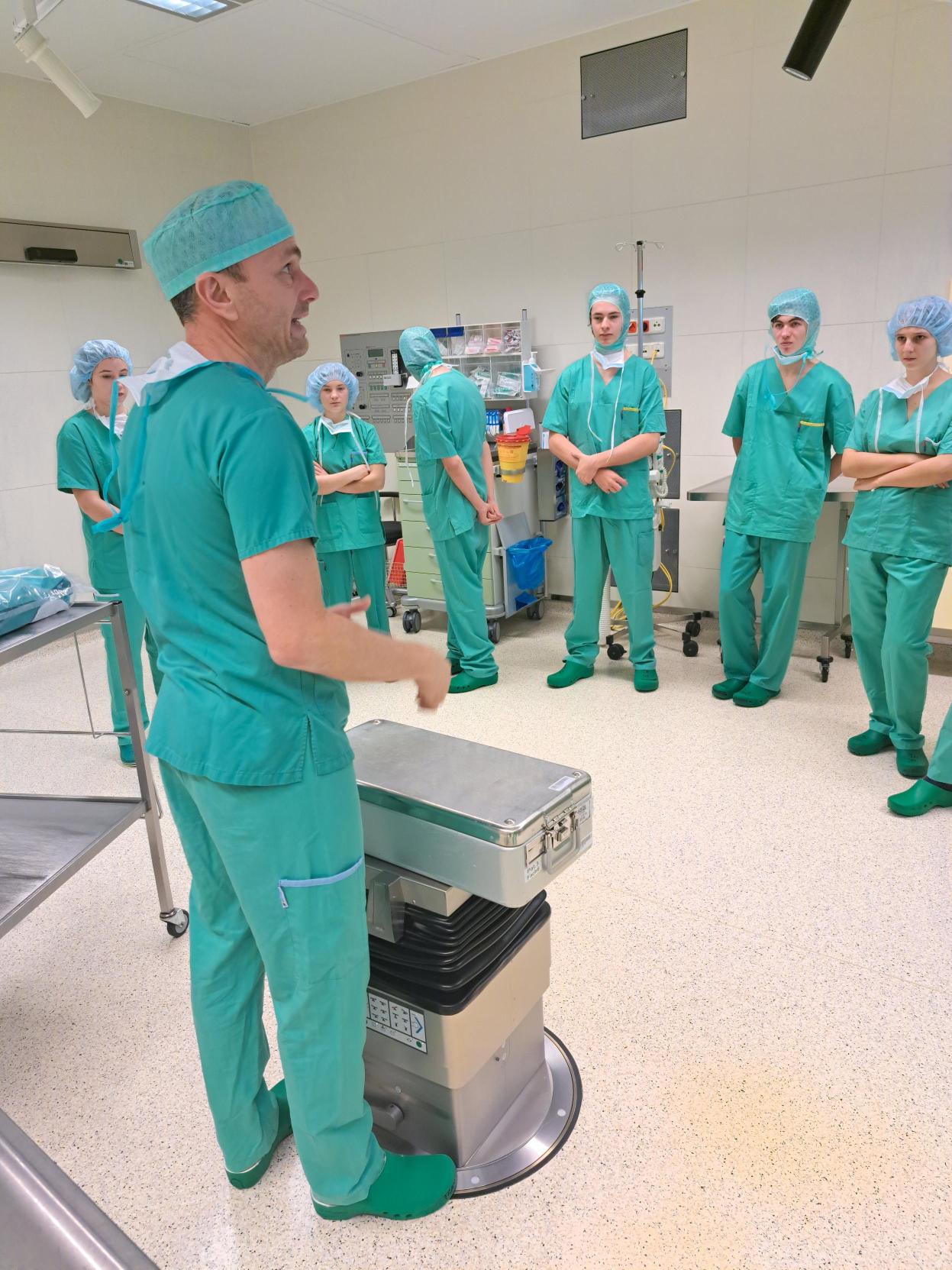 Empfangen wurden wir von Herrn Franz Ganser, der die Leitung des OP-Bereichs innehat. Nach einer spannenden Einführung in den sterilen OP-Bereich und einem Überblick über die dort durchgeführten Eingriffe durften wir hinter einer Glasscheibe live bei Operationen zusehen.