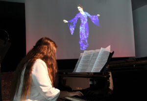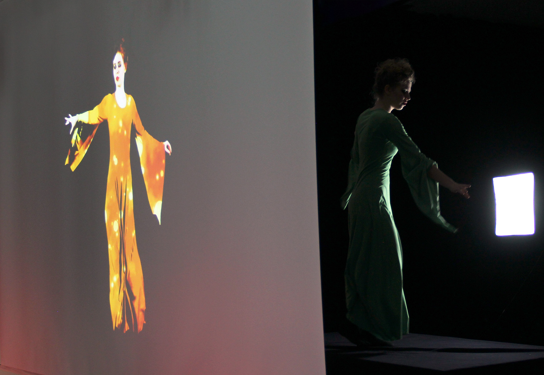 Ein vollkommen grünes Kleid wird digital mit unterschiedlichen Stock-Videos bespielt und erzeugt auf diese Weise faszinierende Anmutungen. Ein Improvisationstanz zu Live-Klaviermusik.