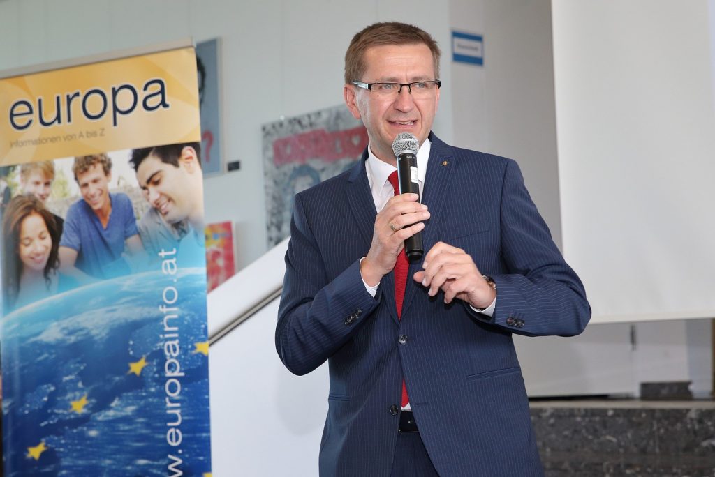 Zum Thema “EU – quo vadis?” wurde im Bundesschulzentrum eine Informationsveranstaltung zur EU – Wahl abgehalten. Wir freuten uns sehr über die Anwesenheit von EU-Landesrat Markus Achleitner, der auch ein Referat zum Thema “OÖ ist Europa – Wir sind Europa“ hielt.  Durch das Programm und die anschließende Diskussion führte David Knogler von der unparteilichen Jugendorganisation JEF OÖ. Unsere schon aus der Artig Reihe bewährten Moderatoren stellten sehr treffsicher und pointiert die Europäische Union vor. Für die musikalische Umrahmung sorgte das Schulorchester des BORG unter der Leitung von Stefan Kapeller.