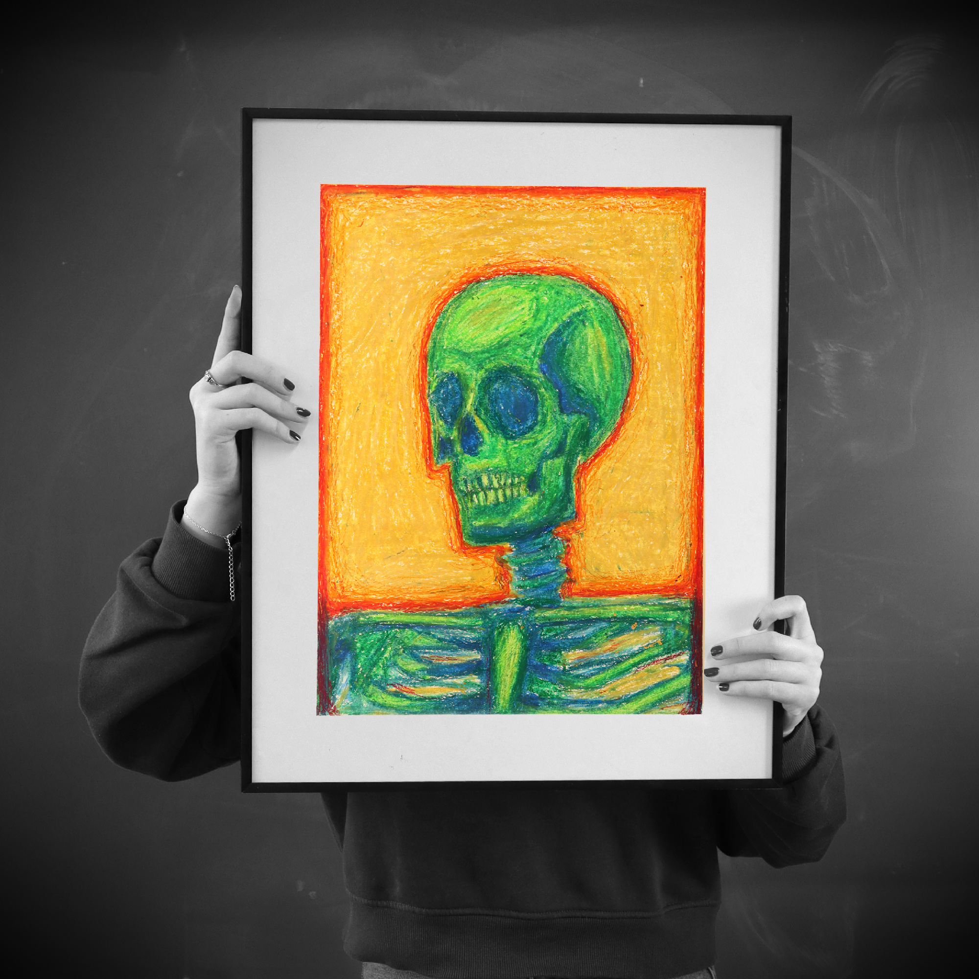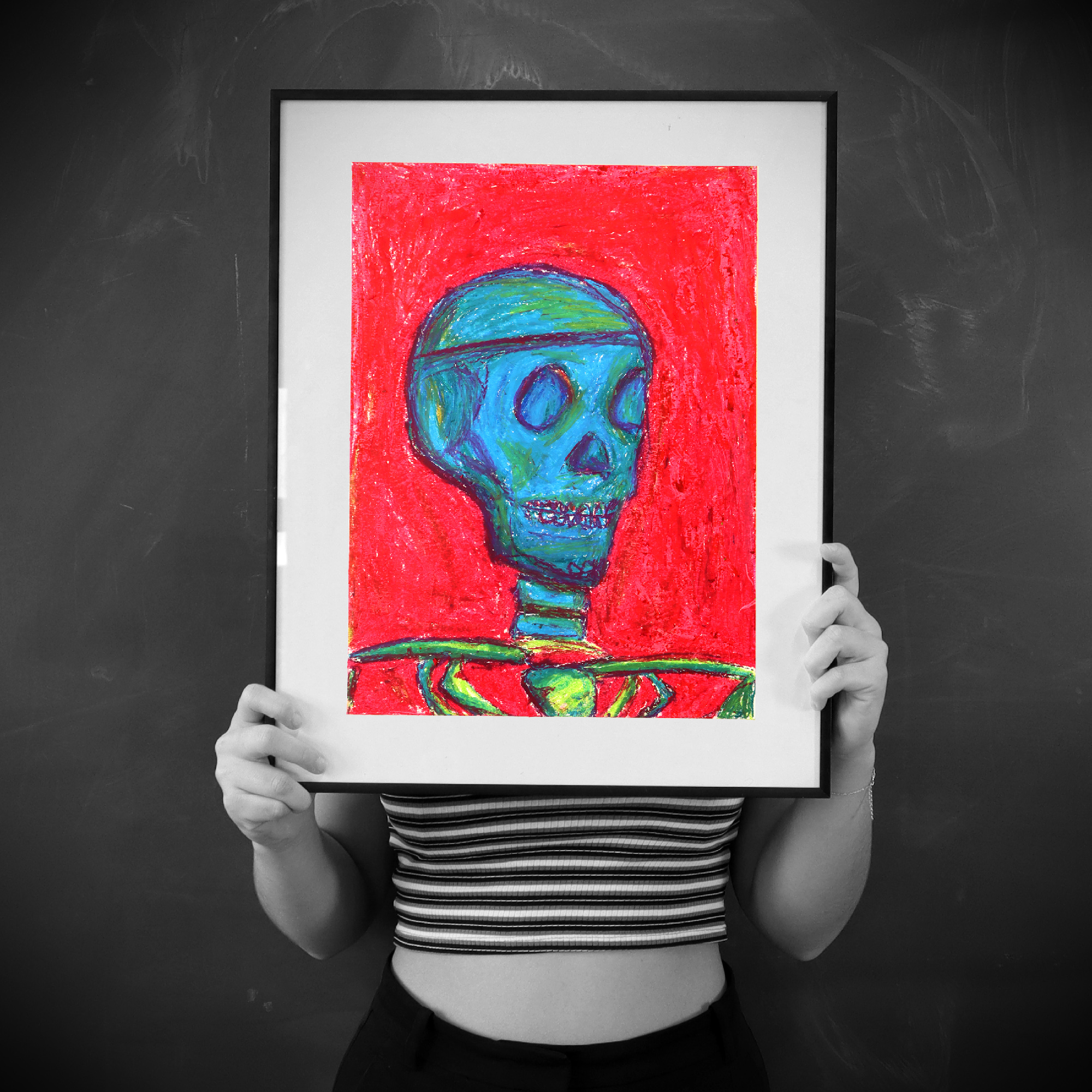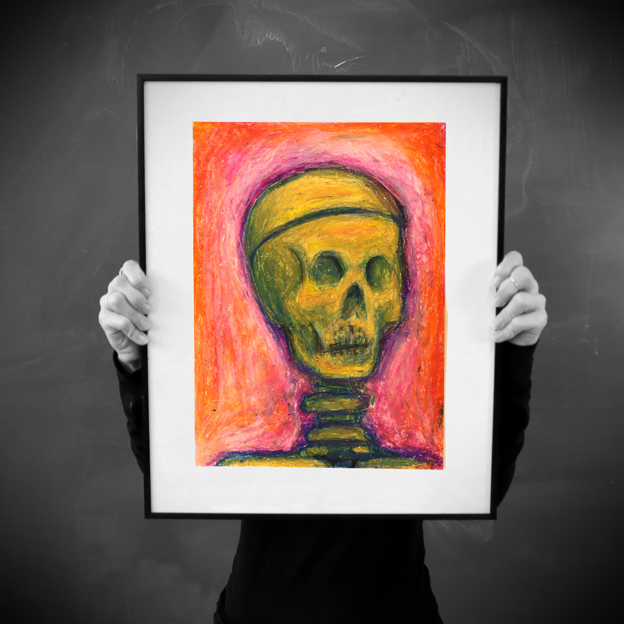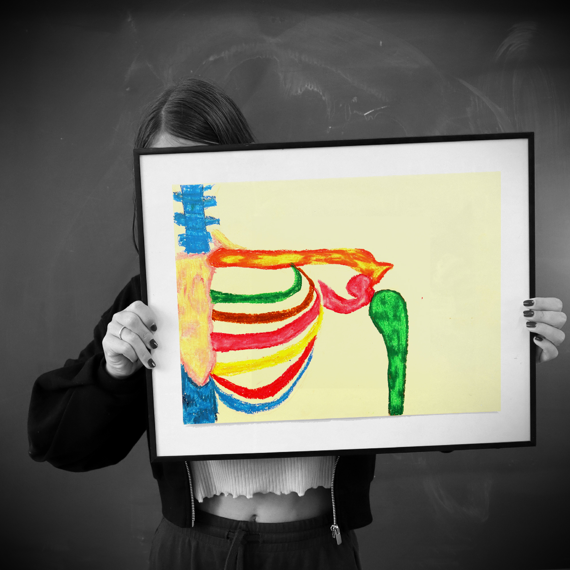 Dieses Projekt entstand eigentlich mehr aus Zufall. Nachdem wir im Zuge von Anatomieübungen auch Studien an einem Skelett angefertigt hatten, probierten wir – quasi als Kontrapunkt zu den exakten Beobachtungen und feinen Umsetzungen auf dem Papier – mit großen Bewegungen, schwungvolle Spuren in satten, lebendigen Farben zu Papier zu bringen, die weniger den Anspruch haben, die Realität abzubilden, als einfach eine expressive Interpretation des Themas darzustellen. Hierfür nutzten wir mit Ölkreiden absichtlich ein wenig exaktes Werkzeug, das uns half die Linie loszulassen und stärker in Flächen zu denken.