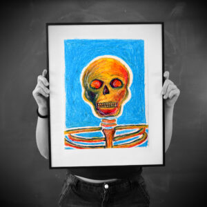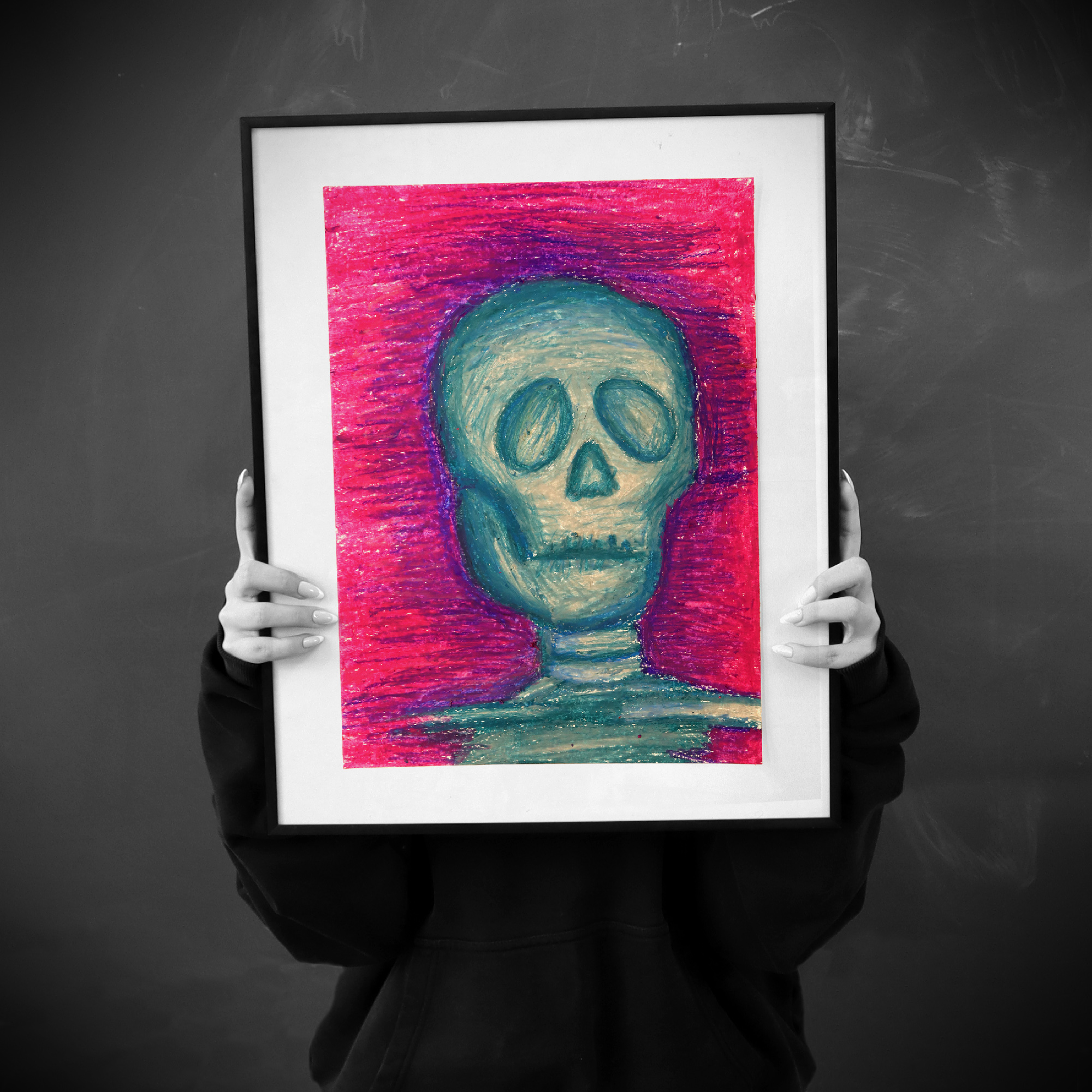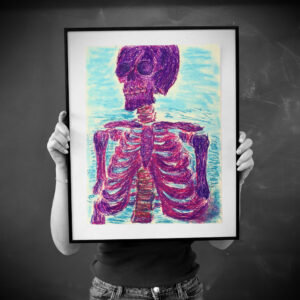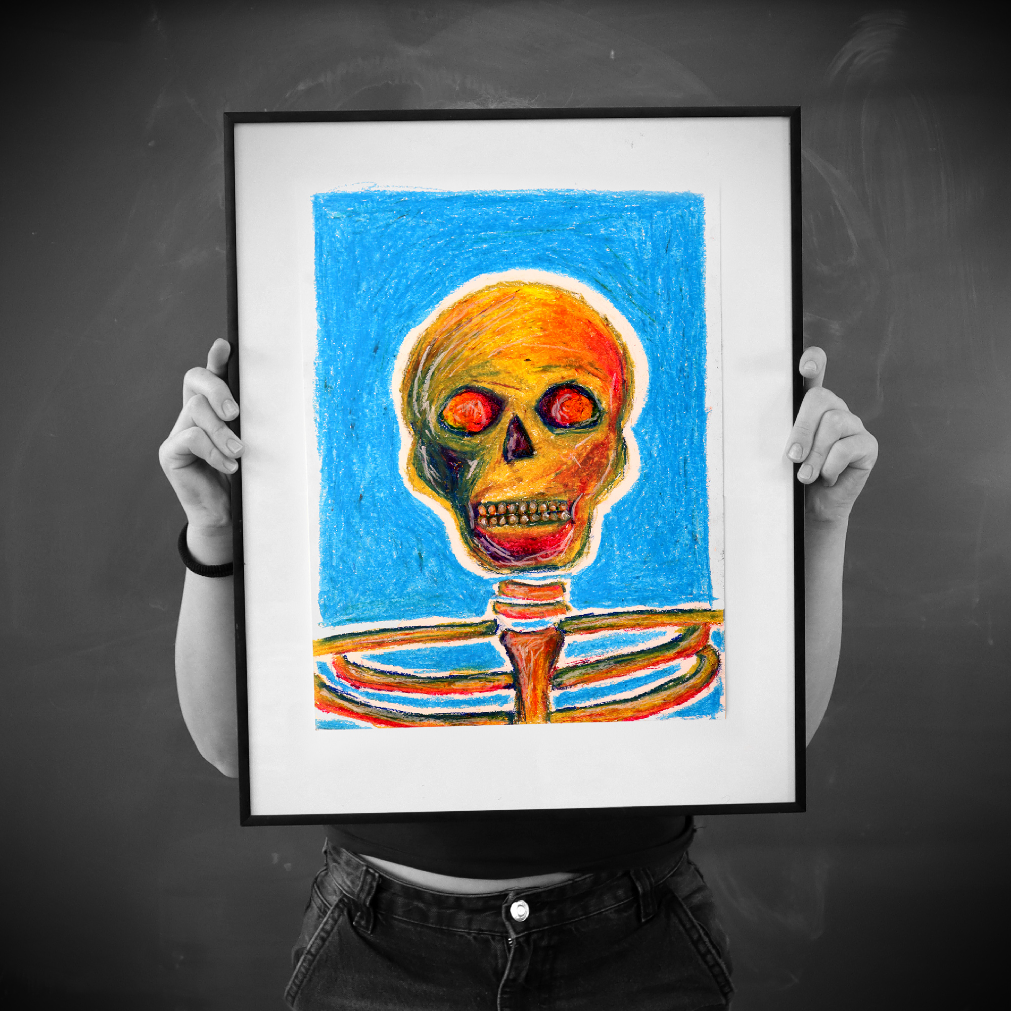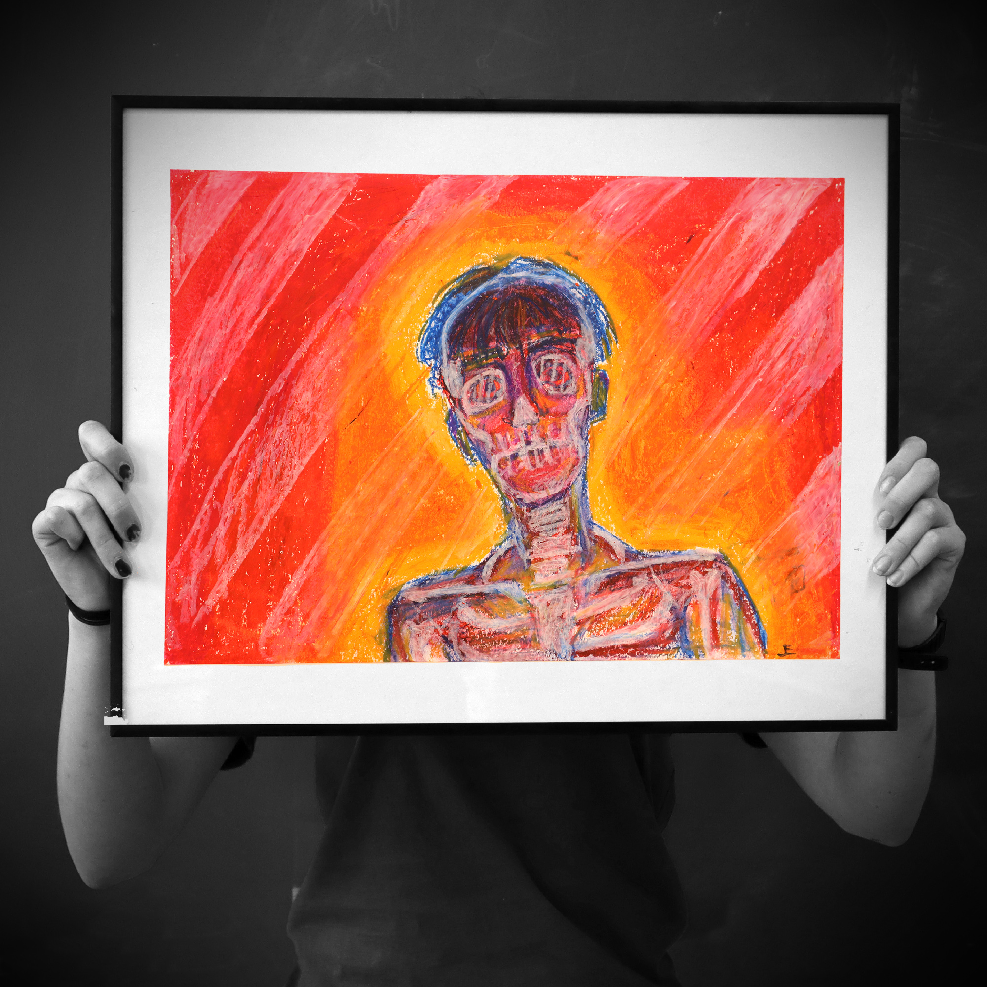 Dieses Projekt entstand eigentlich mehr aus Zufall. Nachdem wir im Zuge von Anatomieübungen auch Studien an einem Skelett angefertigt hatten, probierten wir – quasi als Kontrapunkt zu den exakten Beobachtungen und feinen Umsetzungen auf dem Papier – mit großen Bewegungen, schwungvolle Spuren in satten, lebendigen Farben zu Papier zu bringen, die weniger den Anspruch haben, die Realität abzubilden, als einfach eine expressive Interpretation des Themas darzustellen. Hierfür nutzten wir mit Ölkreiden absichtlich ein wenig exaktes Werkzeug, das uns half die Linie loszulassen und stärker in Flächen zu denken.