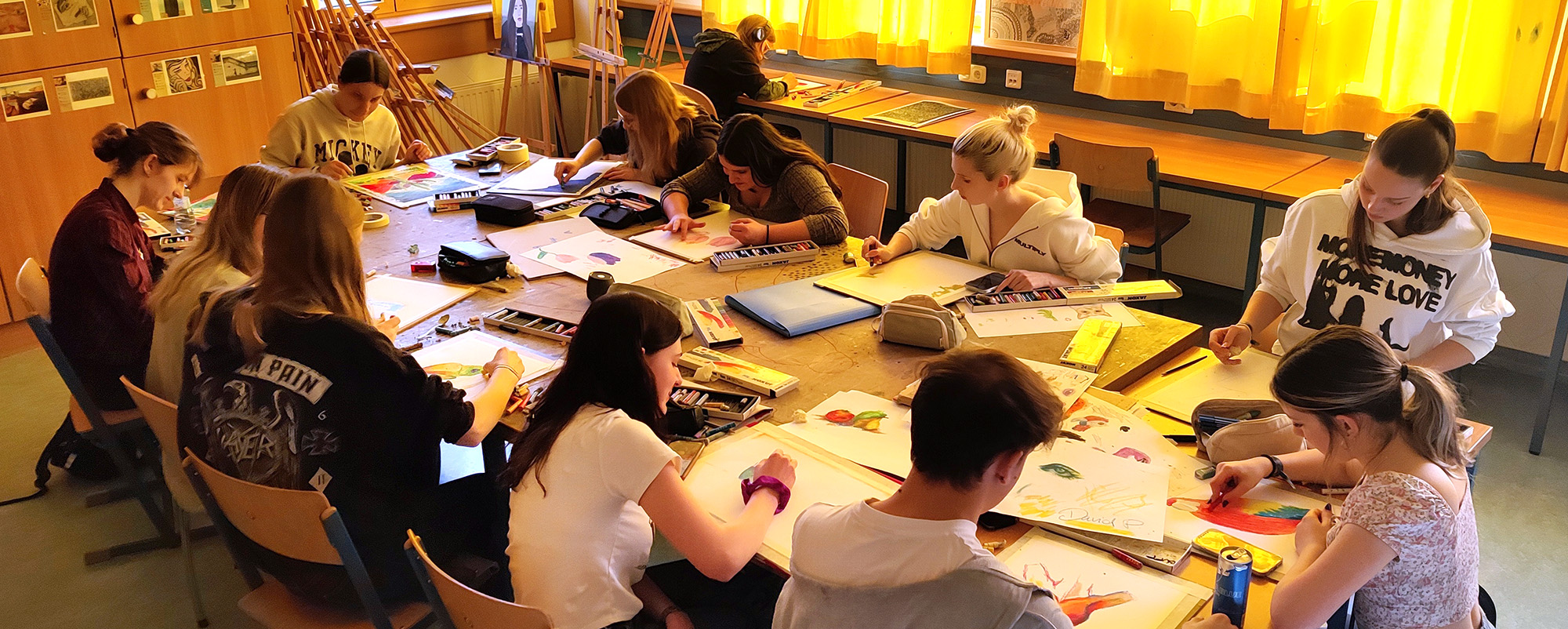 Die jungen Künstlerinnen und Künstler experimentierten mit verschiedenen Techniken und ließen ihrer Kreativität freien Lauf ohne zuvor länger zu planen oder Vorzeichnungen anzufertigen. Die Ergebnisse sind nicht nur farbenfroh und lebendig, sondern zeigen auch die Vielfalt und das Talent unserer Schulgemeinschaft.