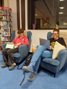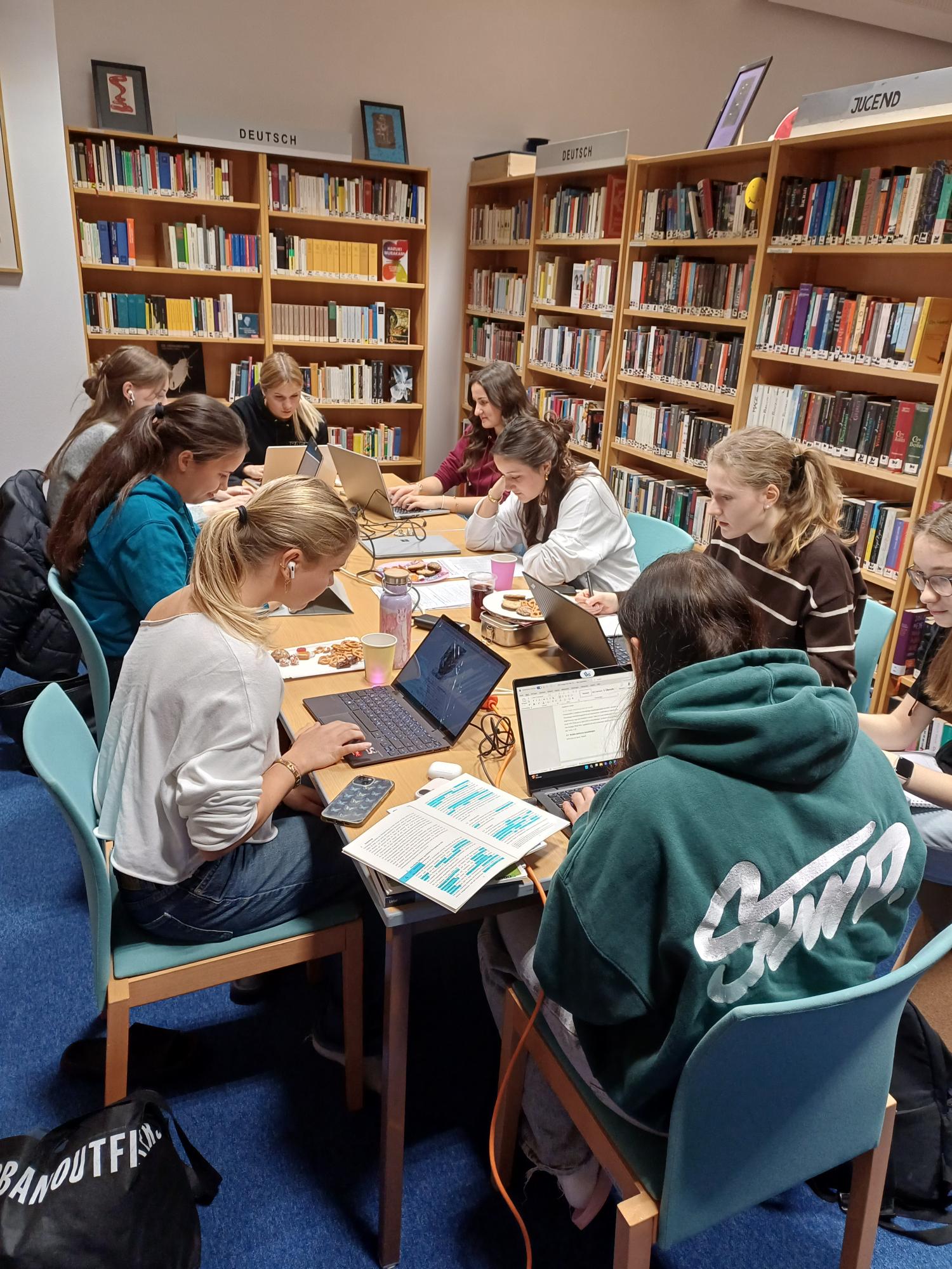 In entspannter Atmosphäre, versorgt mit leckerem Punsch und allerlei Leckereien, haben sich die Jugendlichen in der Bibliothek unserer Schule getroffen und fleißig gearbeitet. Ein Team von Lehrerinnen hat sie dabei unterstützt und Fragen zur Literaturrecherche, zum Zitieren oder auch Formatieren beantwortet und sie in allen Belangen rund um die Abschlussarbeit beraten. Auch eine kurze Yoga-Session zur Auflockerung durfte nicht fehlen. Die Köpfe rauchten und es wurde fleißig in die Laptop-Tasten gehauen. Aber: „Gemeinsam statt einsam“ – der Leitsatz hat funktioniert und spätabends haben alle Teilnehmenden schon etwas ausgepowert, aber sichtlich zufrieden, das Schulgebäude verlassen.