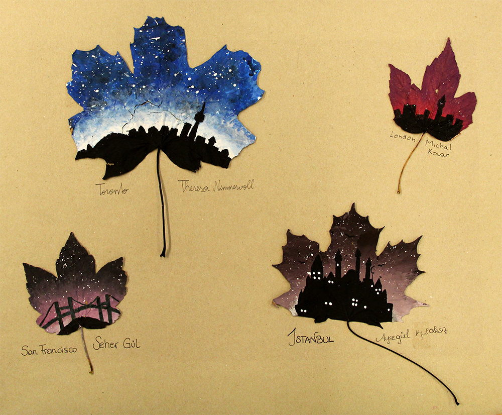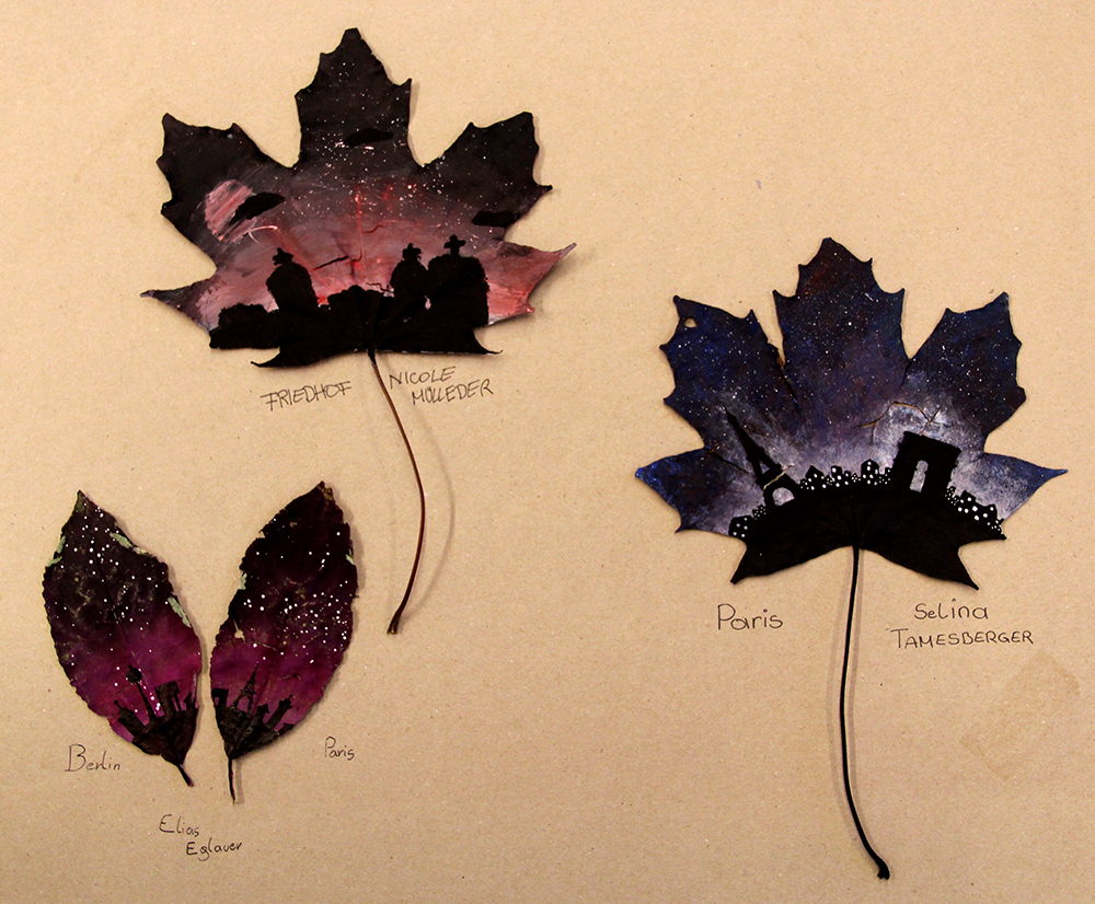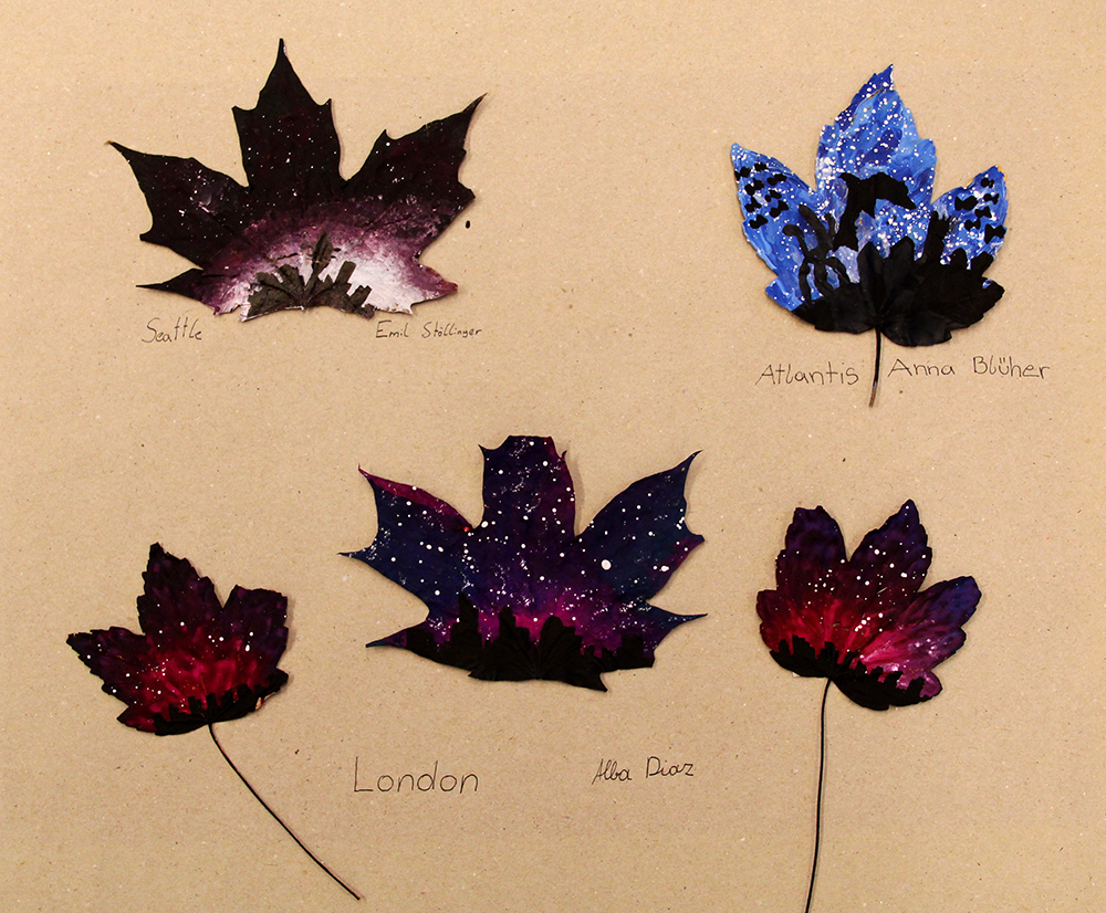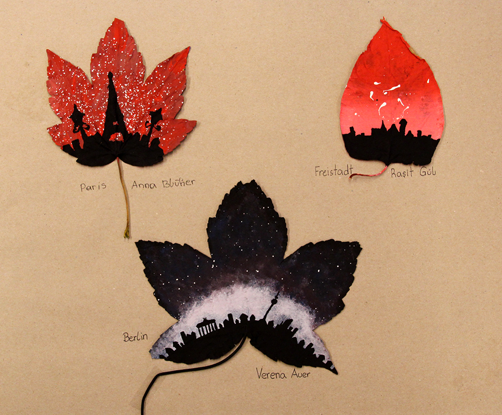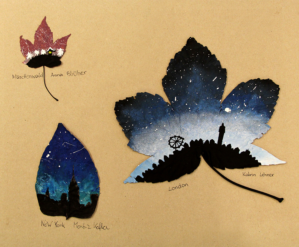 Da der Herbst mit Riesenschritten Einzug hielt, waren wir auf der Suche nach einer Möglichkeit uns dies mit einem malerischen Projekt zu Nutze zu machen. Da sich die 5A gerade intensiv mit dem Thema der Silhouette auseinander gesetzt hatte, erweiterten wir dieses Thema nun auf Umrisse von Städten. Diese sollten, in möglichst wiedererkennbarer Weise auf gefallene Blätter gemalt werden.