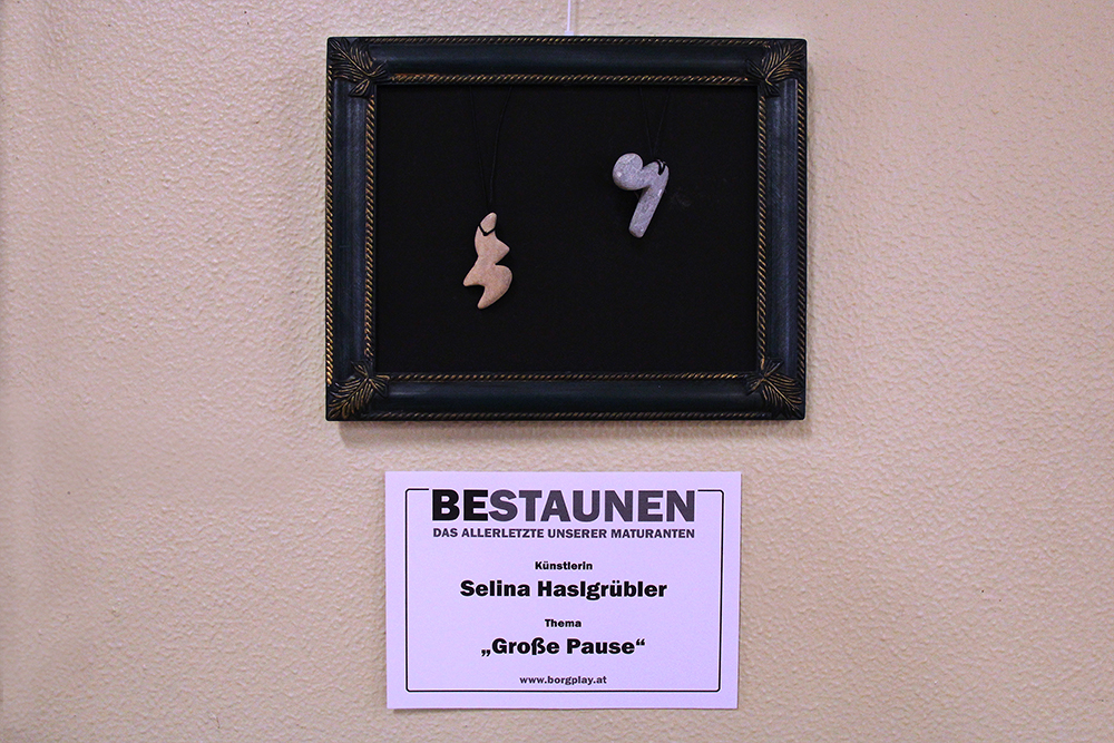 Halskettenanhänger in Form musikalischer Pausensymbole aus Speckstein gefertigt.