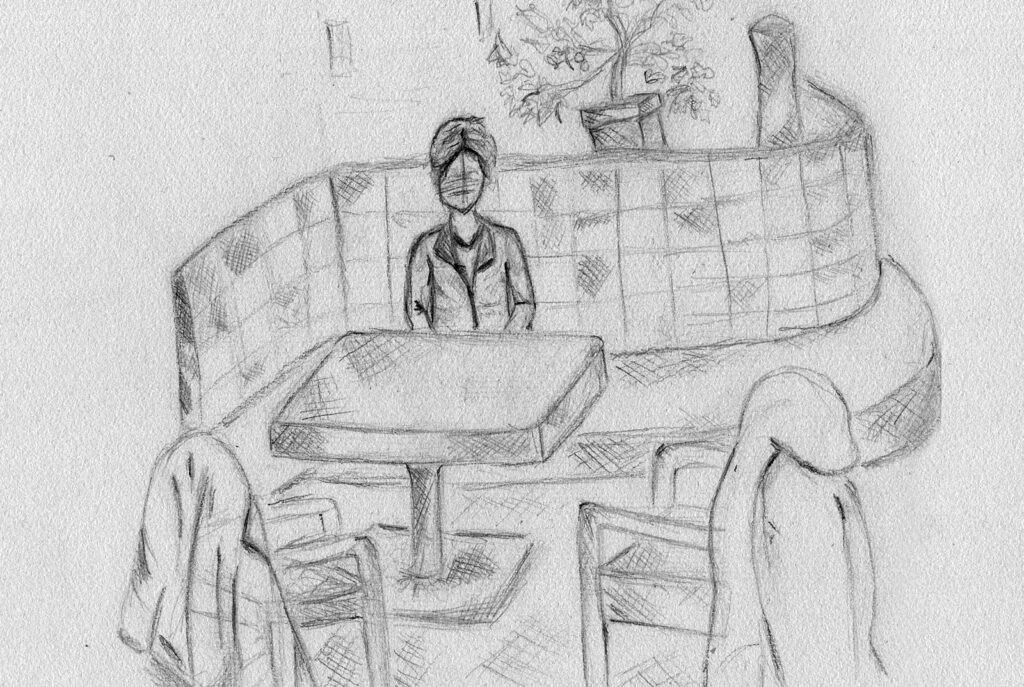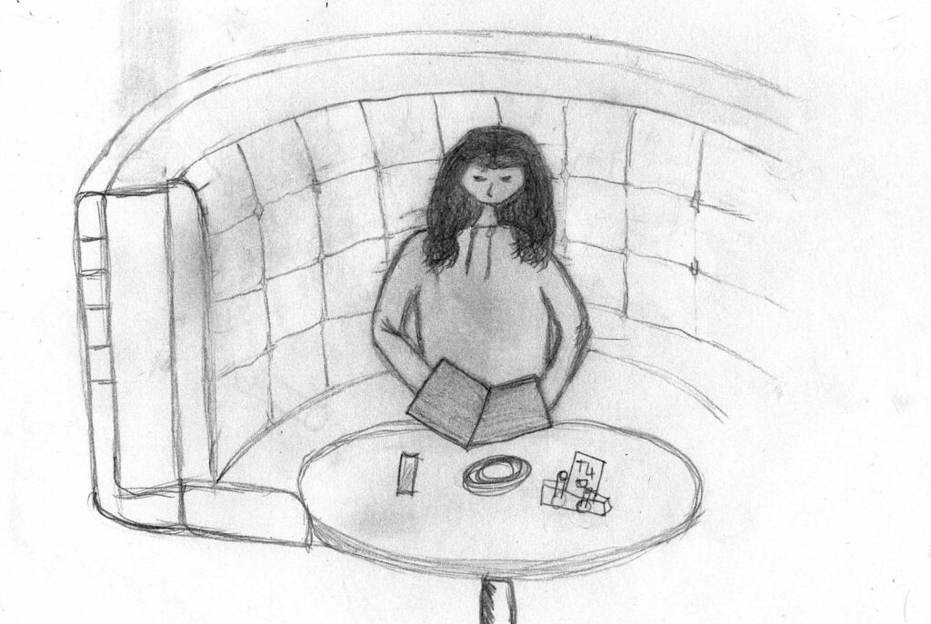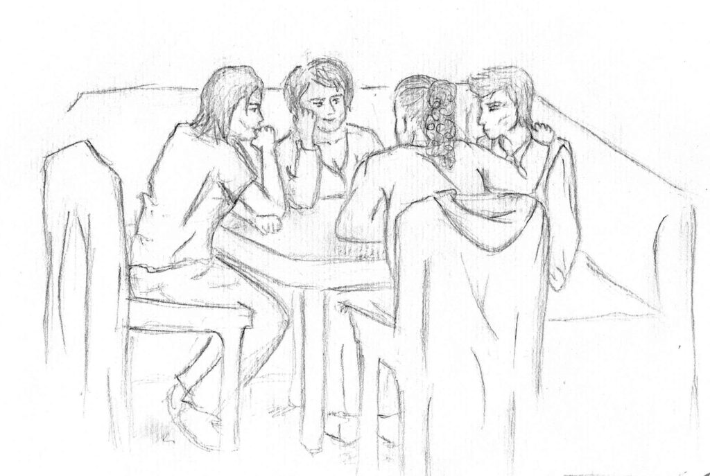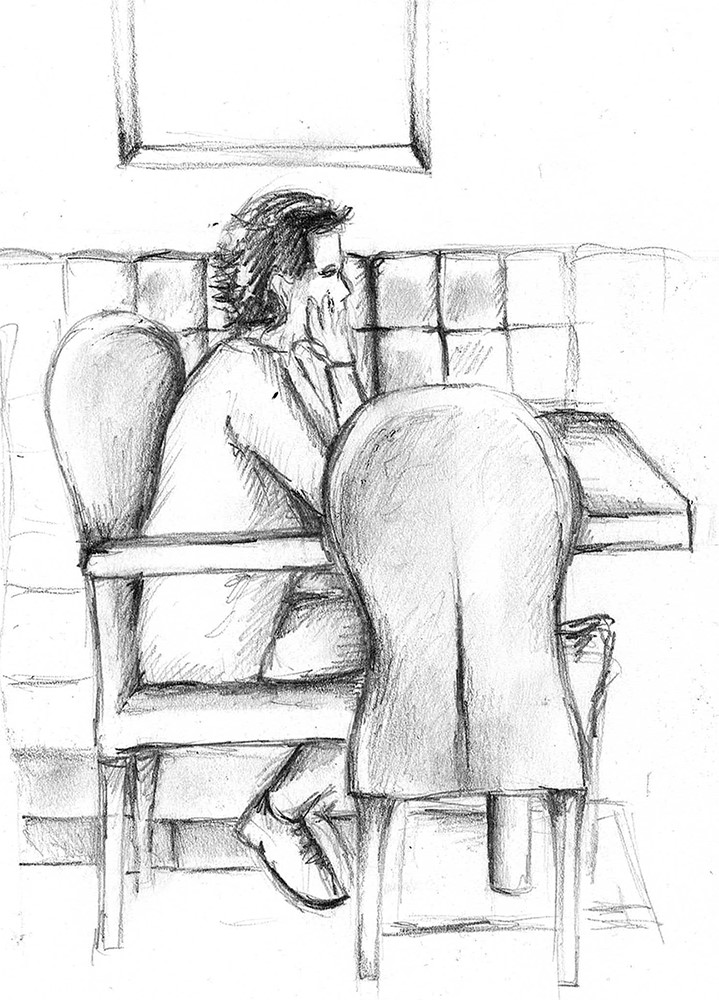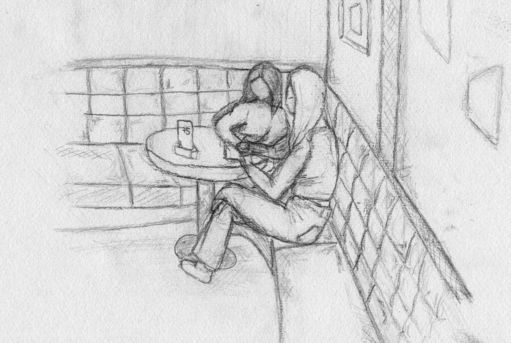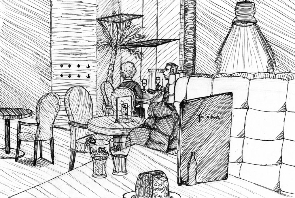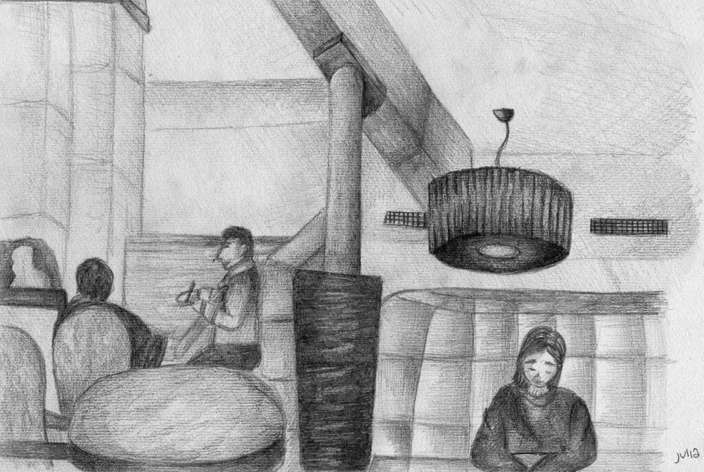 Nachdem wir uns intensiv mit der Darstellung von Raum und der menschlichen Figur auseinander gesetzt hatten, wagten wir uns ins Cafehaus um Milieustudien anzufertigen. Die Herausforderung bestand darin, die räumliche Situation und gleichzeitig die anwesenden Personen darzustellen. Alles unter einem gewissen Zeitdruck, da sich nicht voraussehen ließ wie lange die Gäste am Tisch bleiben würden.