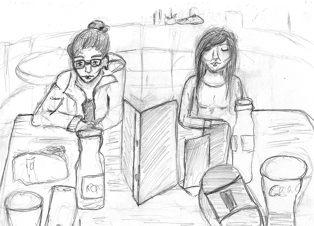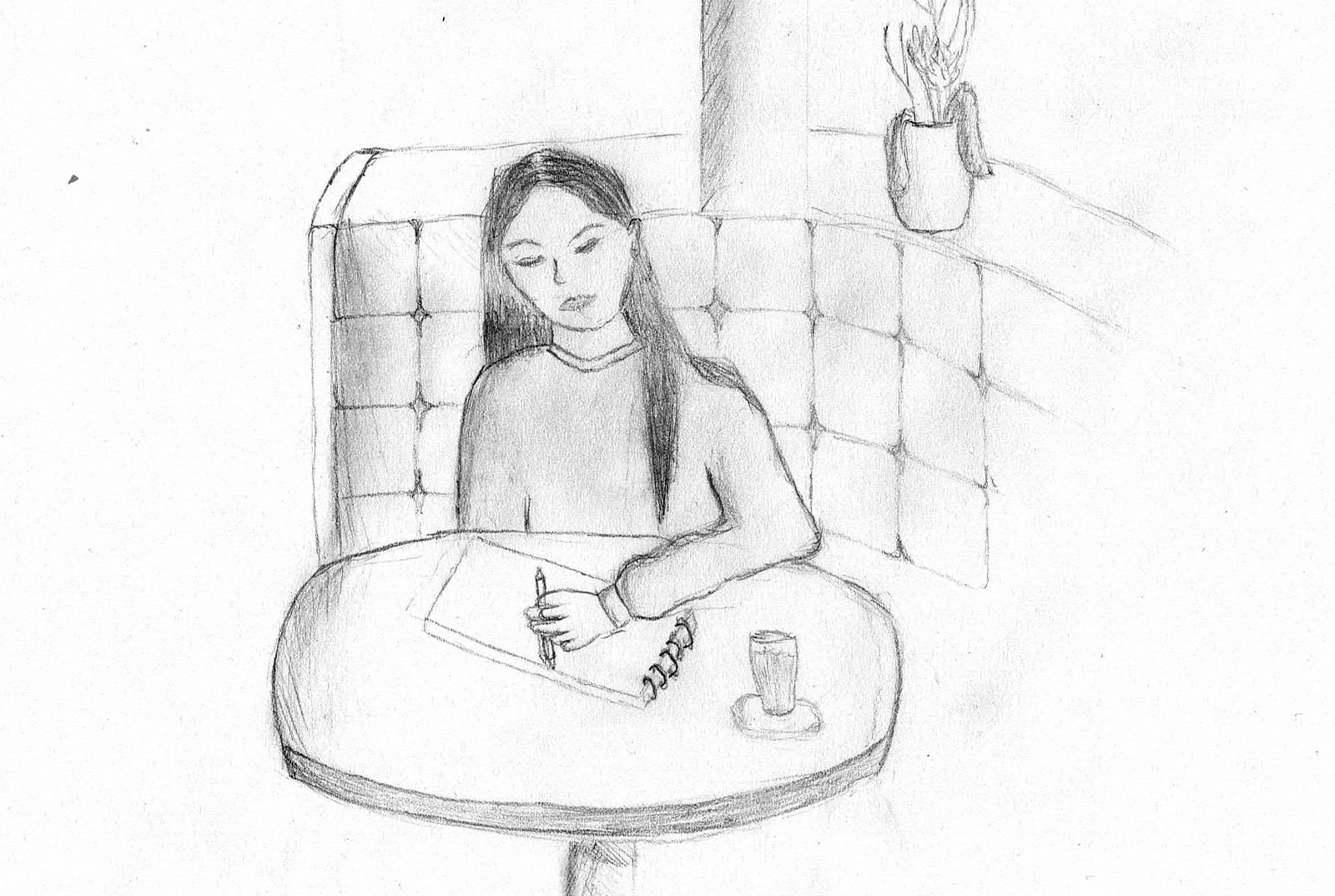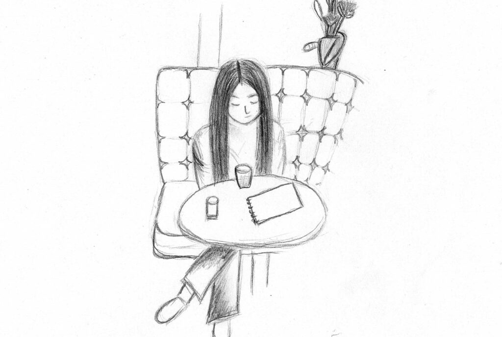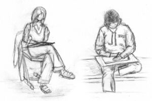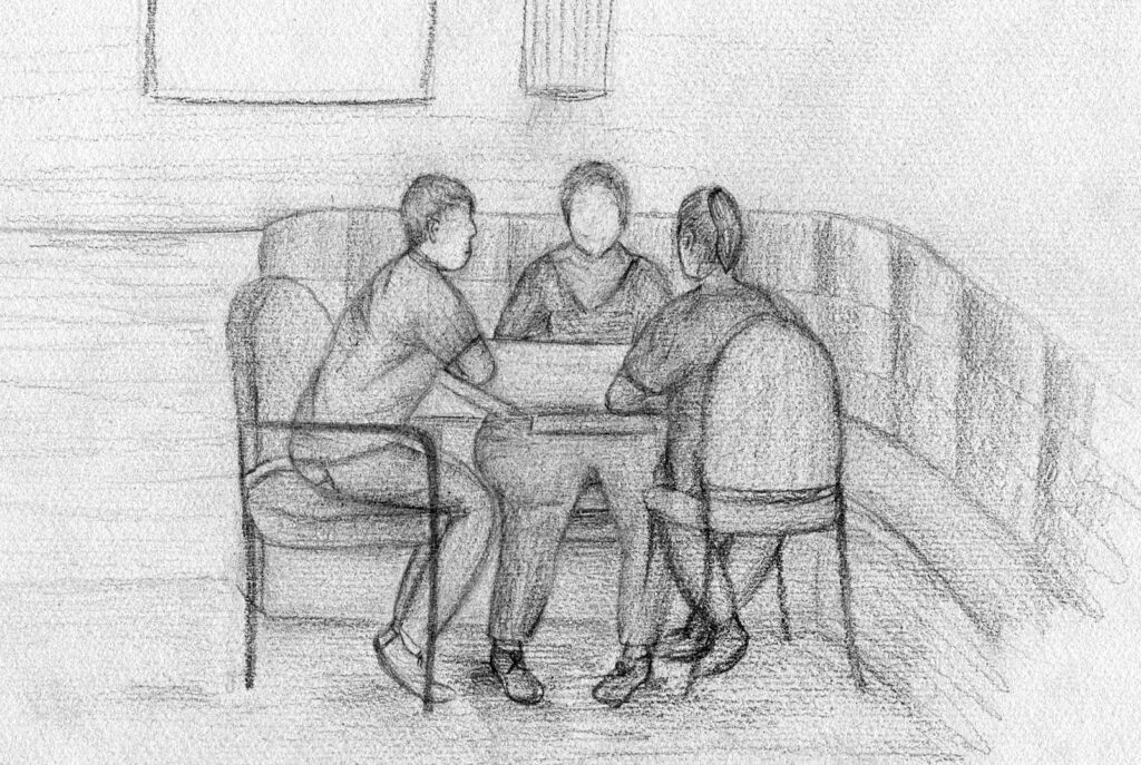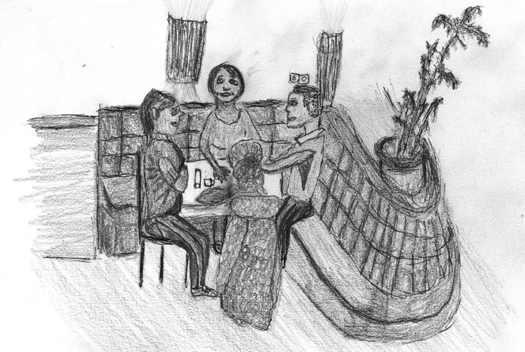 Nachdem wir uns intensiv mit der Darstellung von Raum und der menschlichen Figur auseinander gesetzt hatten, wagten wir uns ins Cafehaus um Milieustudien anzufertigen. Die Herausforderung bestand darin, die räumliche Situation und gleichzeitig die anwesenden Personen darzustellen. Alles unter einem gewissen Zeitdruck, da sich nicht voraussehen ließ wie lange die Gäste am Tisch bleiben würden.