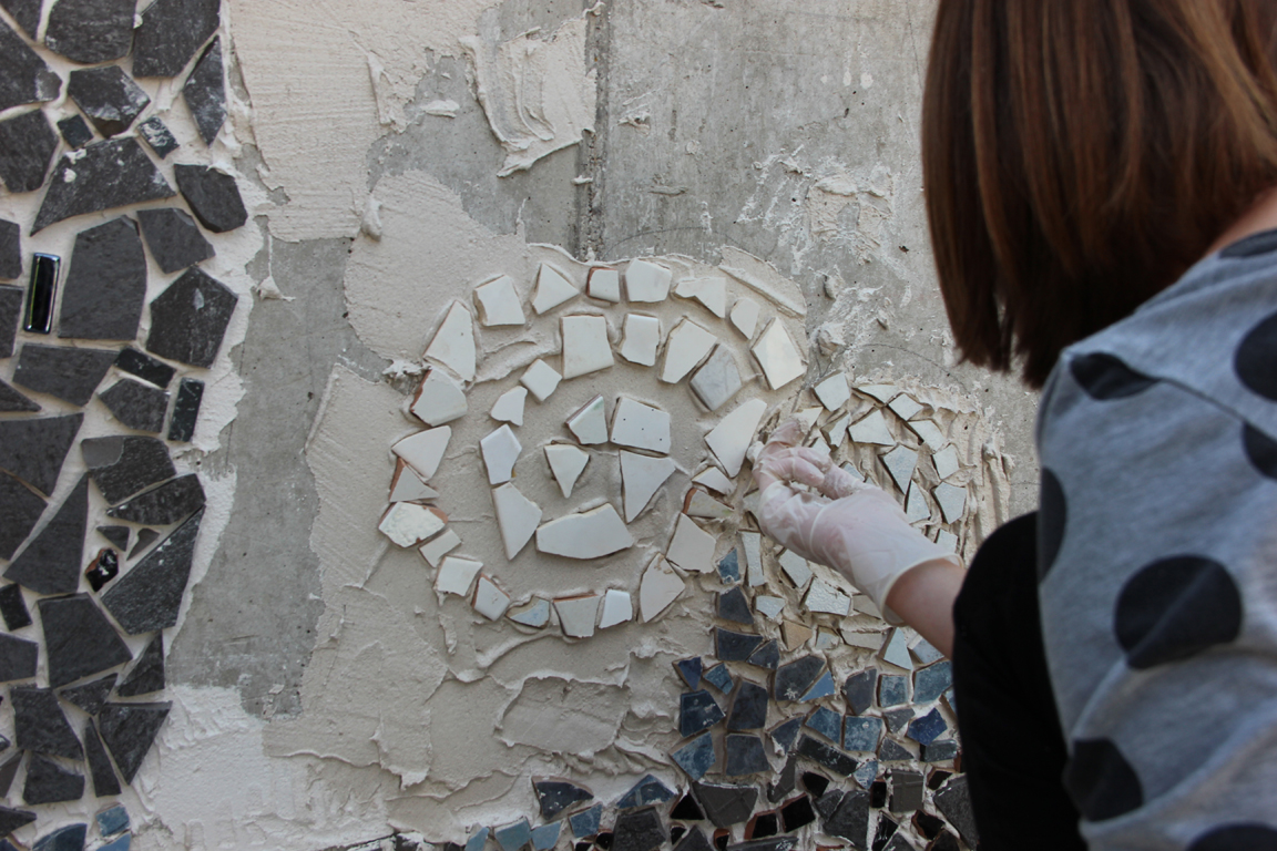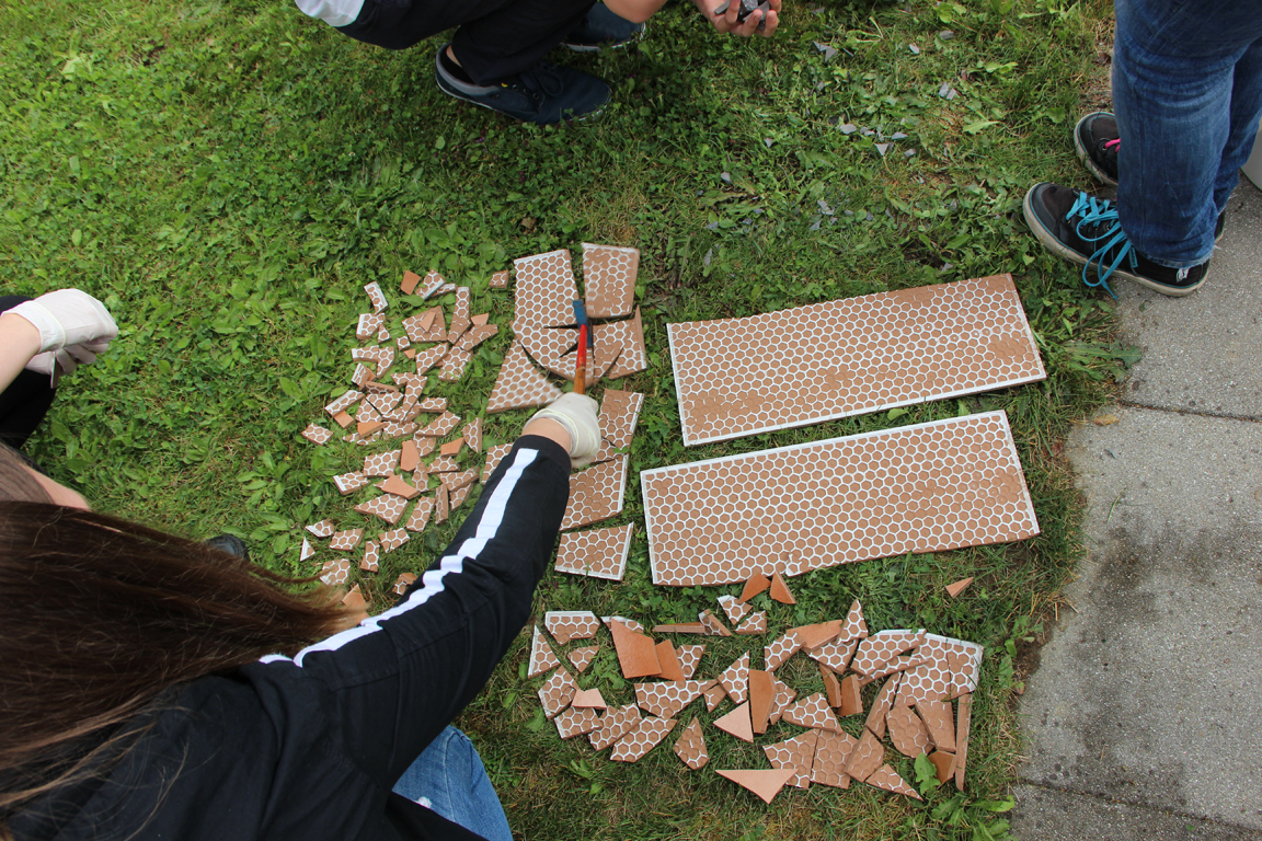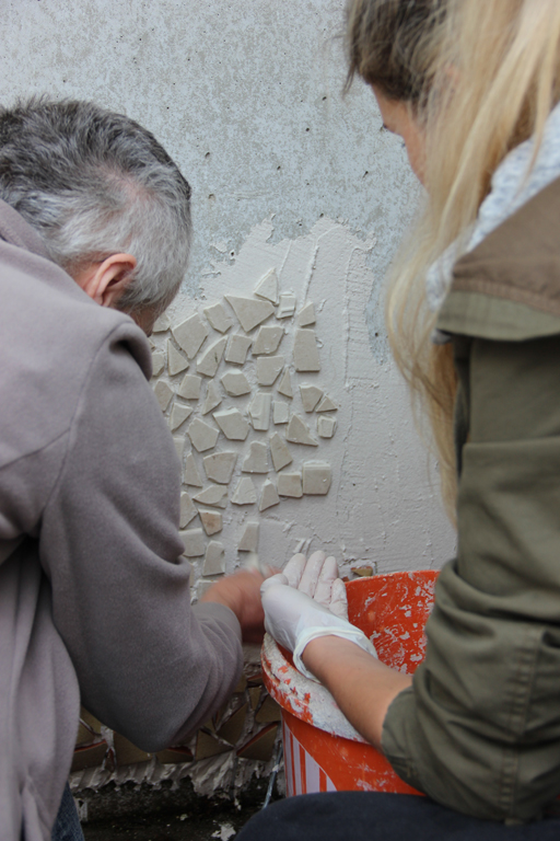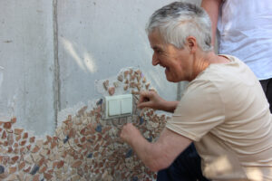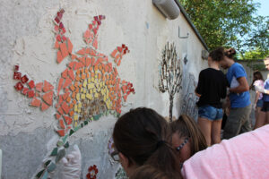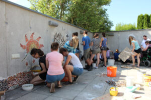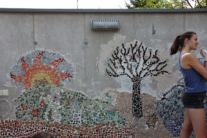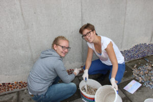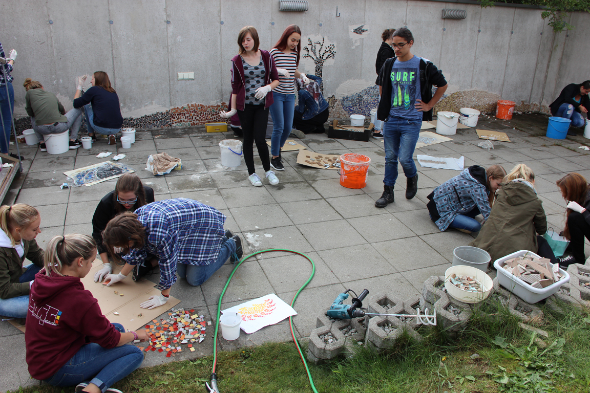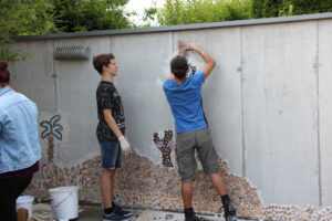 Auf Einladung des Wohnhauses des Diakoniewerks Bad Leonfelden, konnten die Schülerinnen und Schüler der 5A gemeinsam mit einigen Bewohnern und Bewohnerinnen eine Betonwand gestalten. Da wir in der 6.Klasse nach Barcelona reisen und diese Stadt voll von Mosaik-Kunstwerken von Antoni Gaudi ist, hatten wir die Idee, ein Mosaik zu entwerfen, um diesen Bereich attraktiver zu formen.