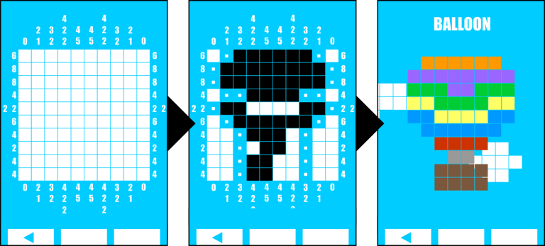 Die Schülerinnen und Schüler gestalteten hierfür eine Fläche von 10×10 Feldern. Die so entstandenen Pixelbilder wurden dann mit Zahlen verschlüsselt. Jede Zahl gibt an wie viele Felder einer Zeile oder Spalte an Stück gefüllt werden müssen. Verfügt eine Zeile über mehrere Ziffern, bedeutet das, dass zwischen den Blöcken zumindest ein Feld frei bleiben muss. Die Herausforderung liegt nun darin, durch geschicktes Kombinieren der horizontalen und vertikalen Informationen zu ermitteln, welche Felder gefüllt werden müssen und welche nicht um so das versteckte Bild freizulegen.