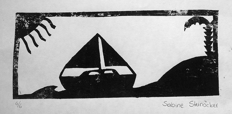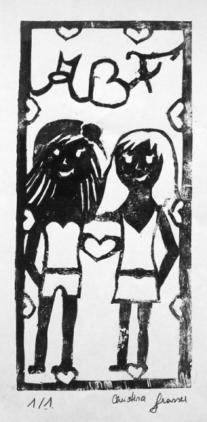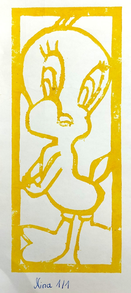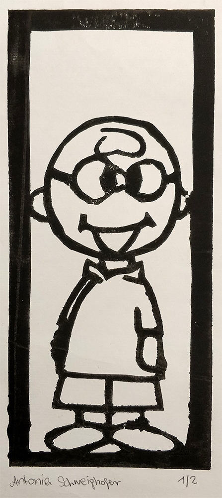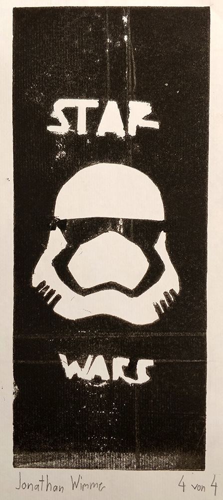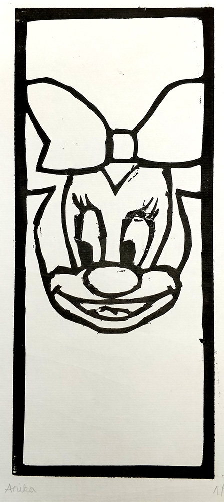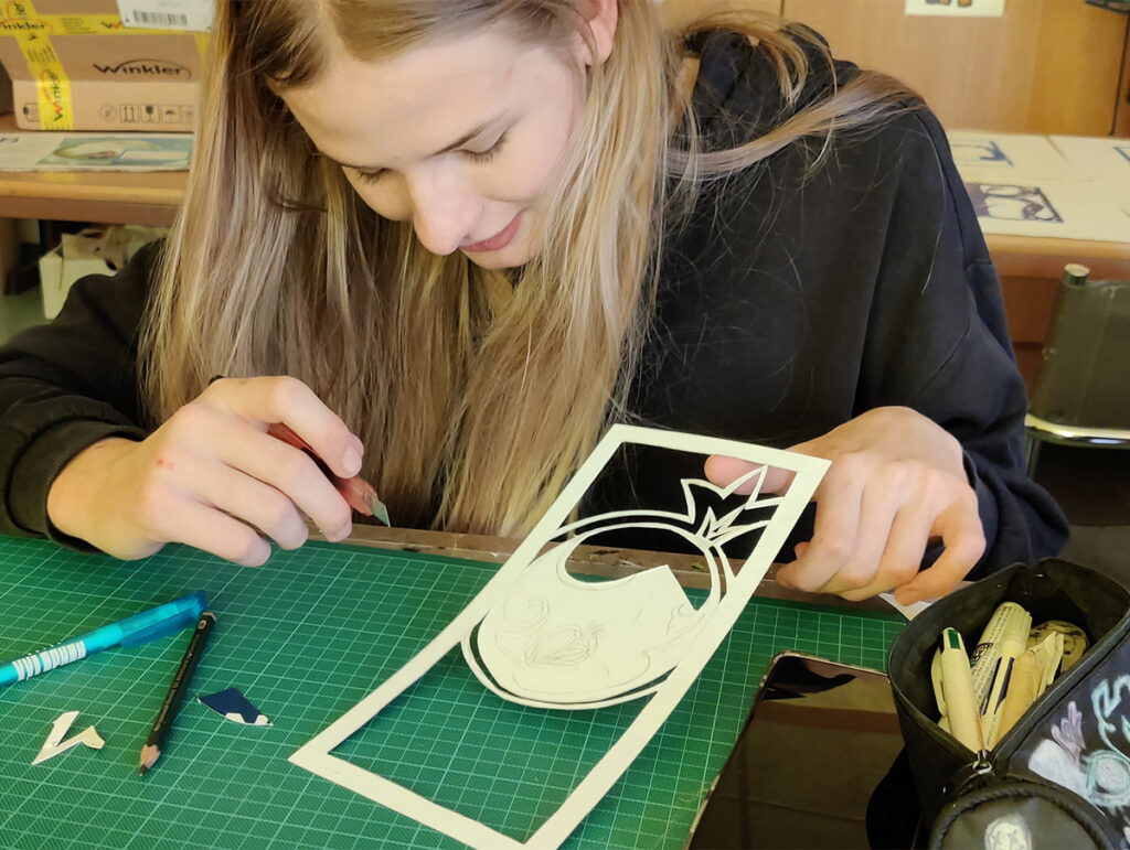 Bei der Beschäftigung mit den Vervielfältigungsmöglichkeiten von Kunstwerken betrachteten wir eingehend verschiedene Drucktechniken. Zunächst realisierten wir einen Papierschablonendruck. Hierfür wurde aus einem schmalen Streifen Papier ein Druckstock geschnitten.