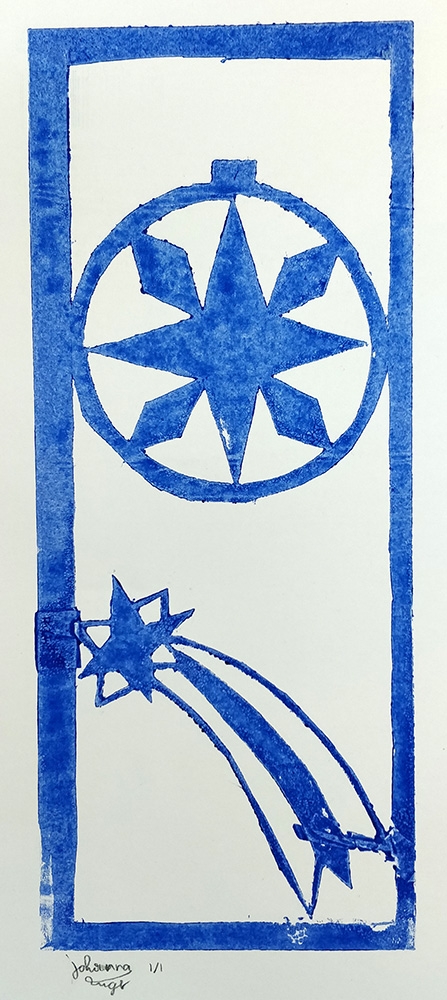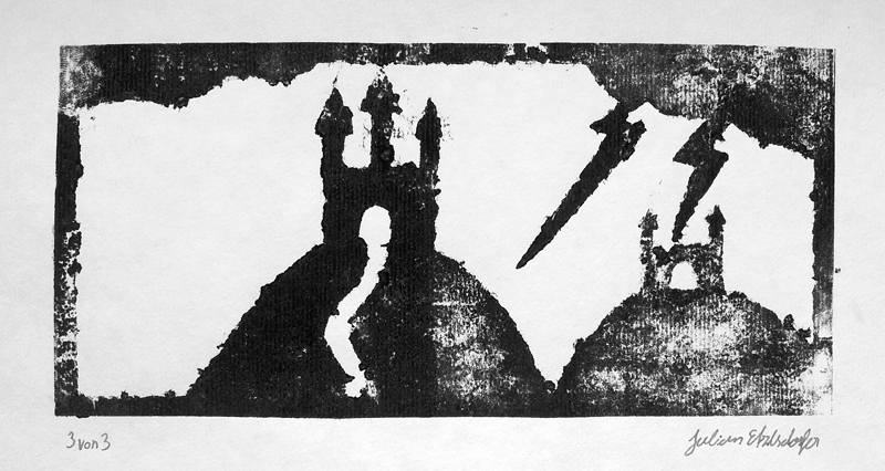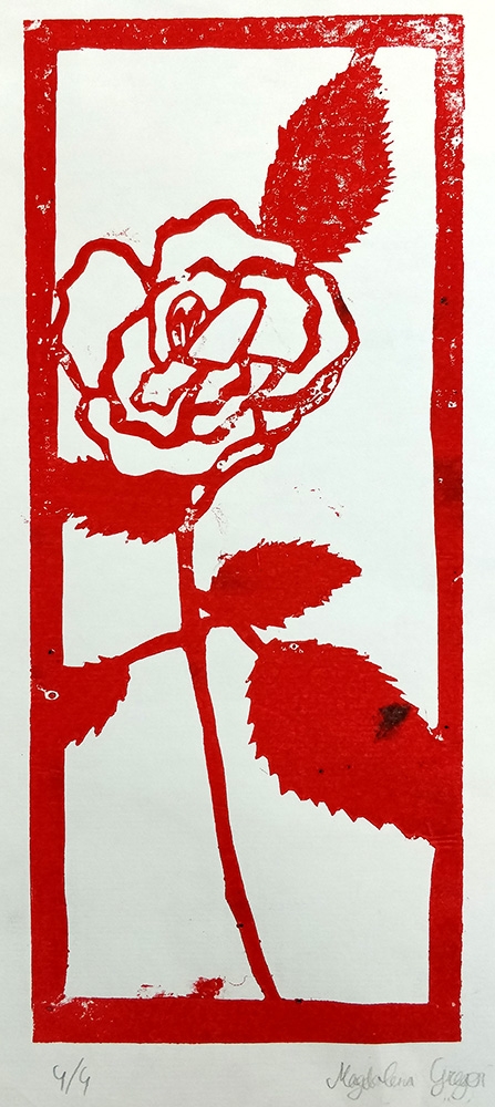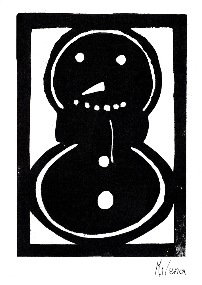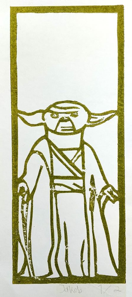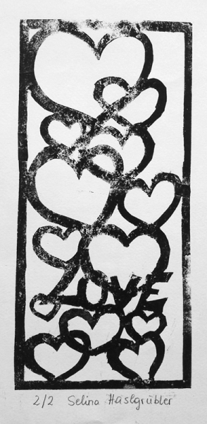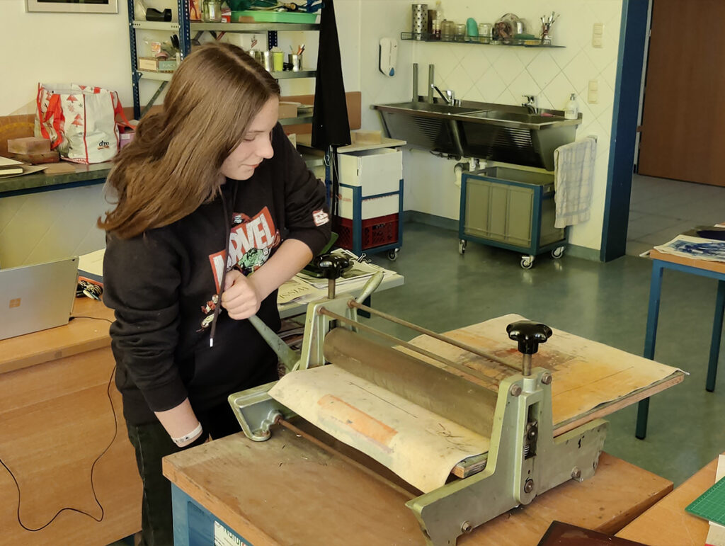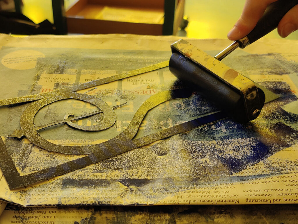 Danach kam der eingestrichenen Druckstock auf ein Blatt Papier und wurde durch die Walze gedreht. Nach mehrmaligem durchwalzen konnte die Papierschablone vorsichtig wieder abgezogen und der fertige Druck bewundert werden.