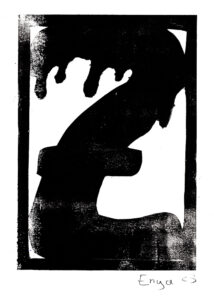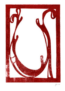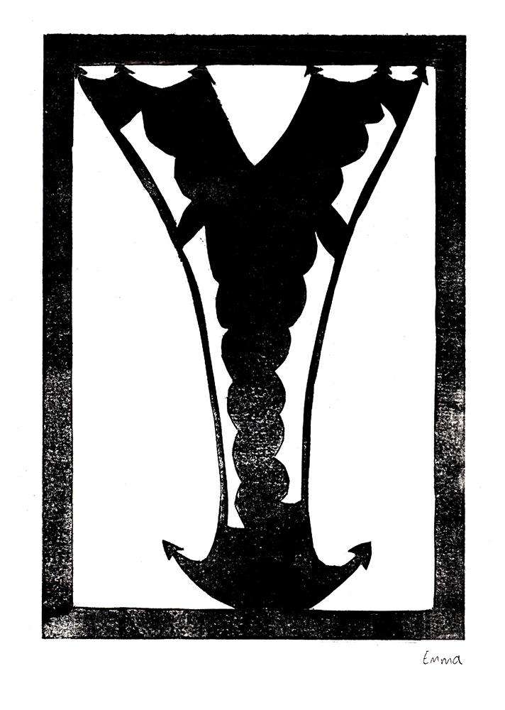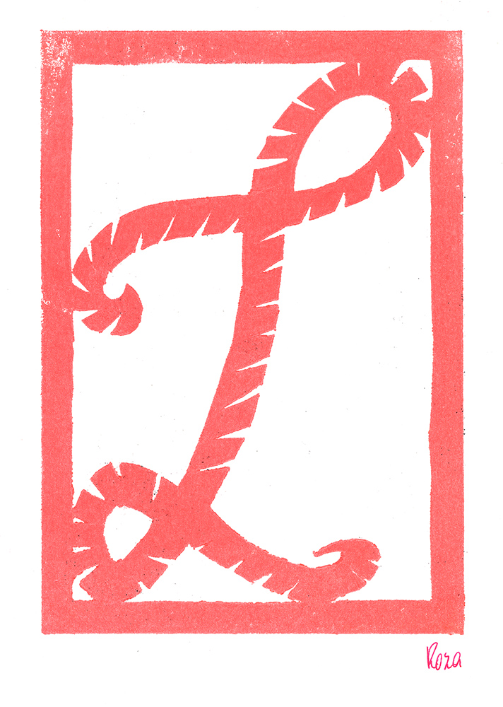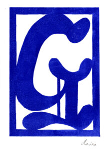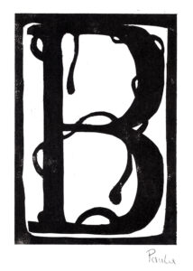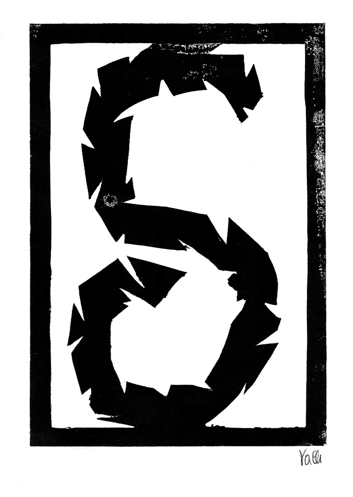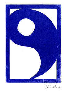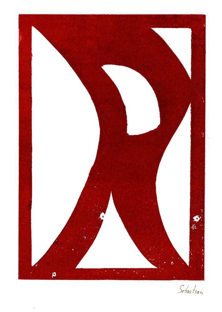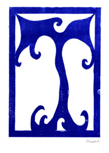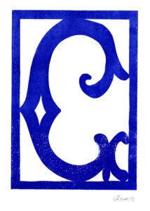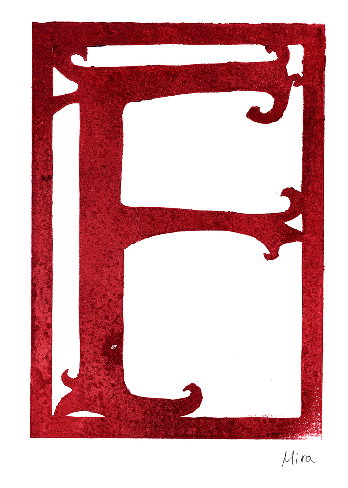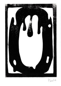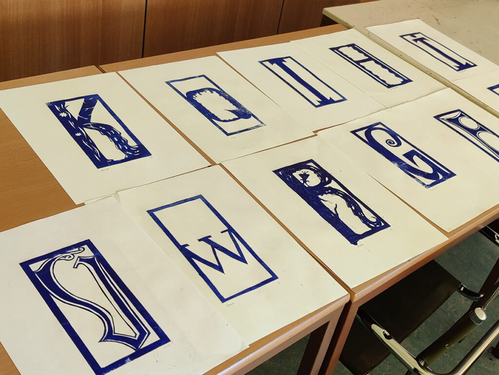 Den Papierschablonendruck haben wir auch eingesetzt um unser eigenes Alphabet zu erstellen. Jeder Schüler und jede Schülerin hat zwei Zeichen übernommen und diese nach dem Vorbild der Initialen in Romanischen Buchmalereien aus einem Papierstreifen ausgeschnitten um diesen dann durch die Druckerpresse zu walzen.
