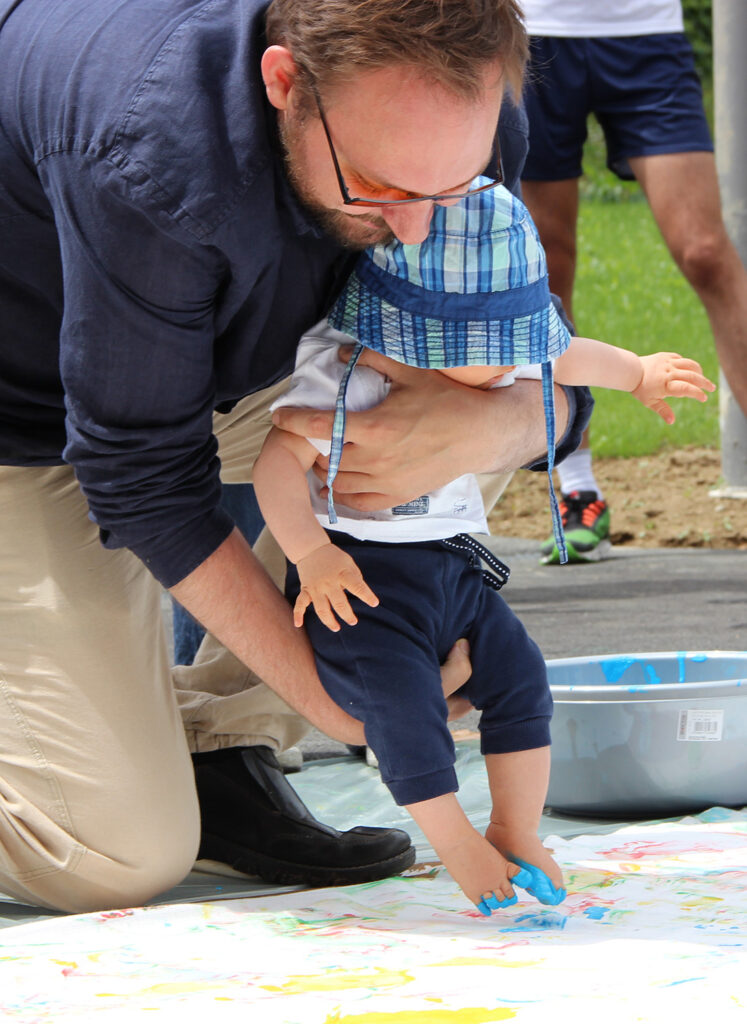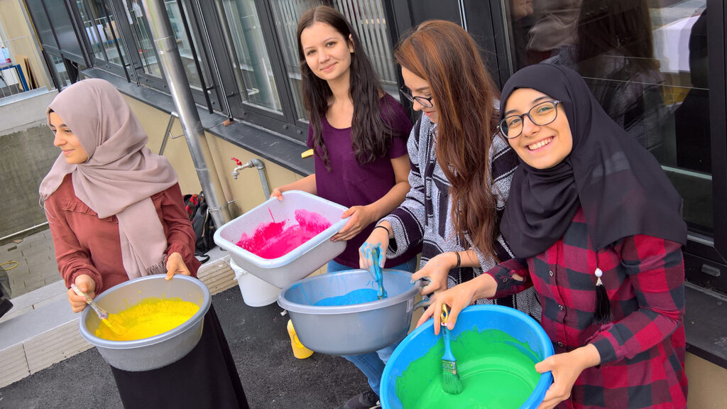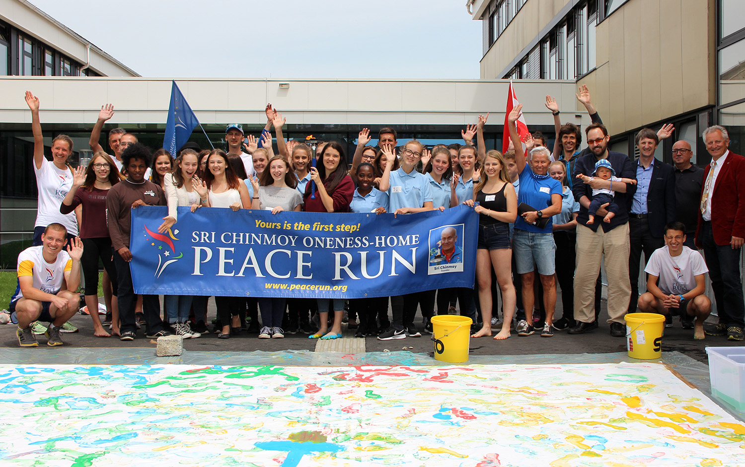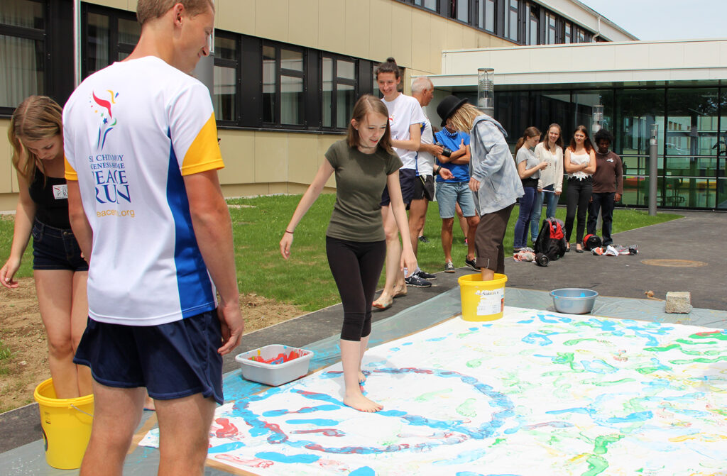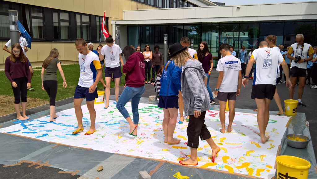 Wir hießen die Gruppe von Läuferinnen und Läufern auf vielen verschiedneen Ländern herzlich willkommen und feierten ihren Besuch mit Chorgesang, einer Tanzperformance und einem großen gemeinsamen Kunstprojekt. Gemeinsam “erliefen” wir ein Farbenfrohes Bild für den Frieden, eher sich die Läufer mit der Fackel wieder auf den Weg in Richtung Tschechien machten.