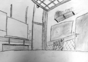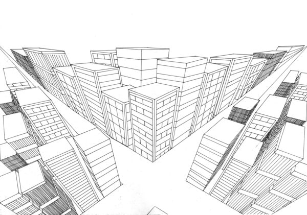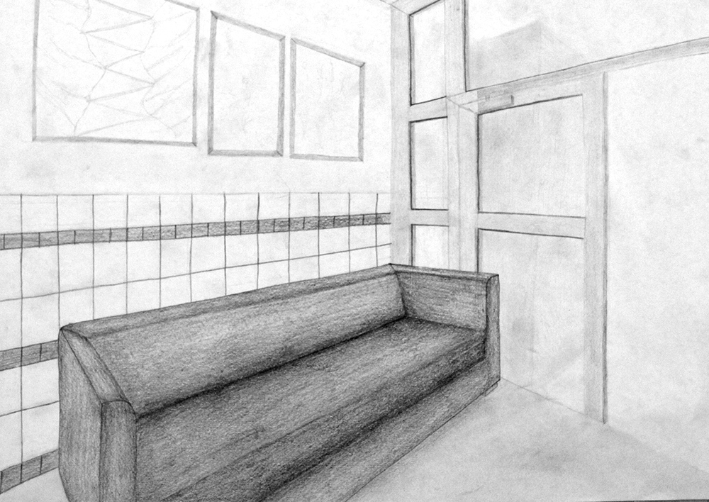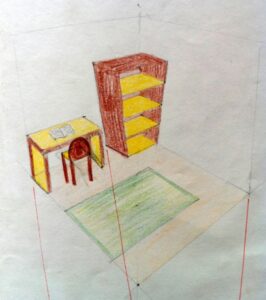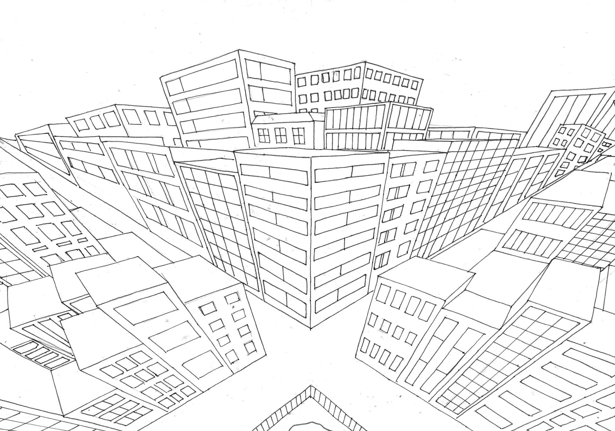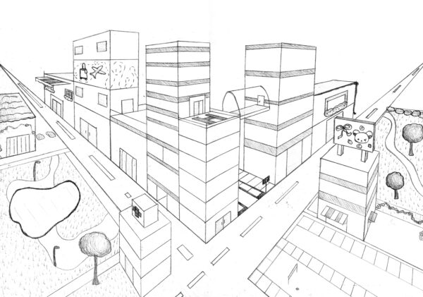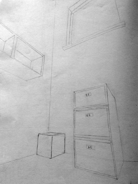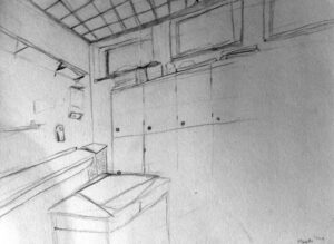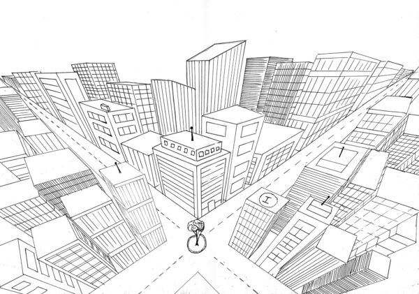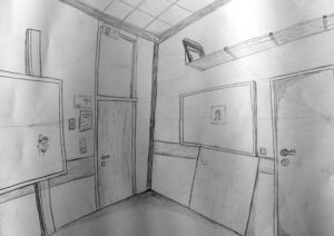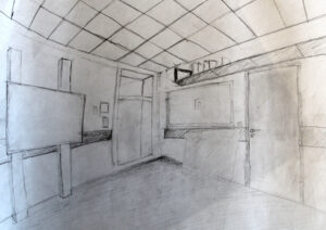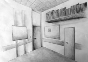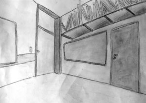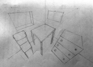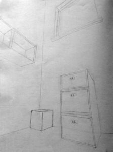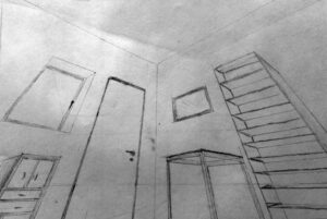Bei dieser Übung sollte vor allem die Beobachtungsgabe und die Fähigkeit dreidimensionale Eindrücke auf ein zweidimensionales Medium zu übertragen geschult werden. Hierfür begannen wir zunächst mit Übungen zu Perspektive und arbeiteten mit einem, dann zwei und schließlich drei Fluchtpunkten.