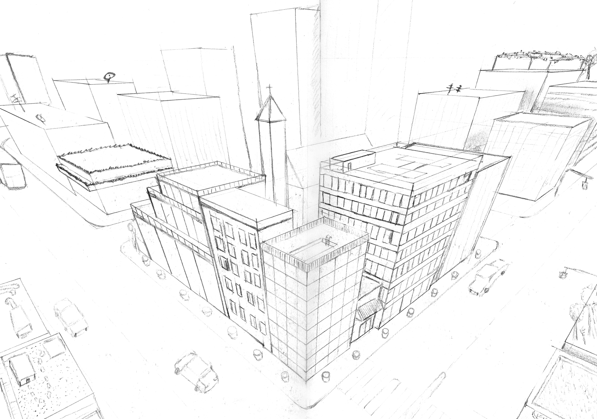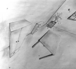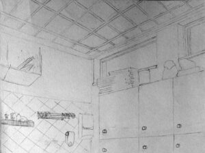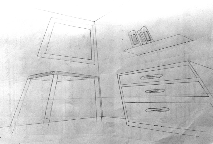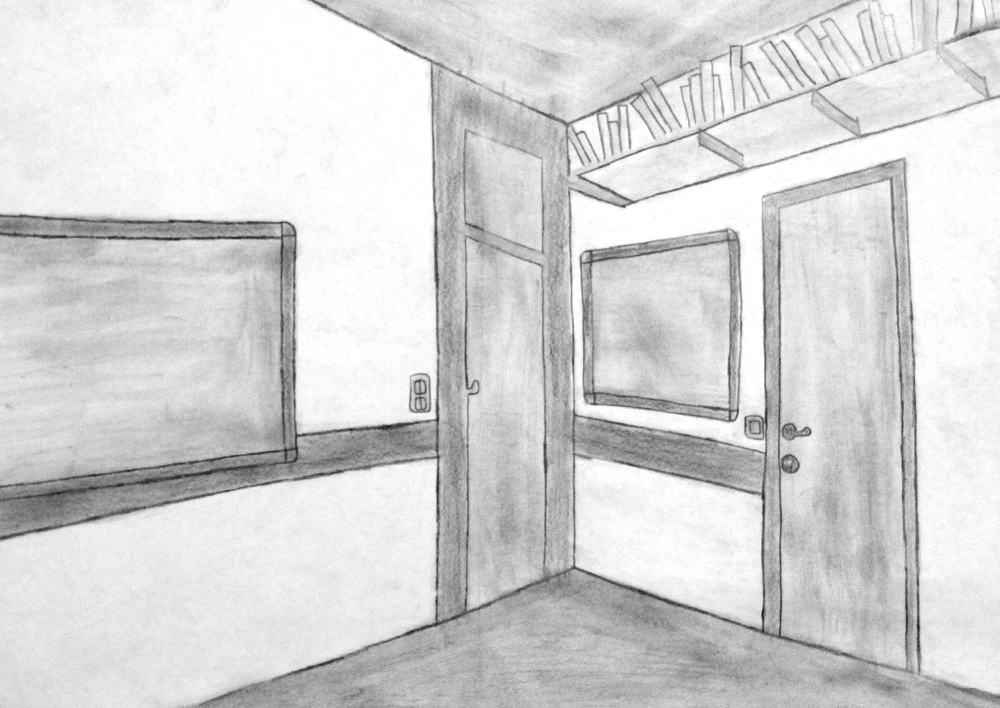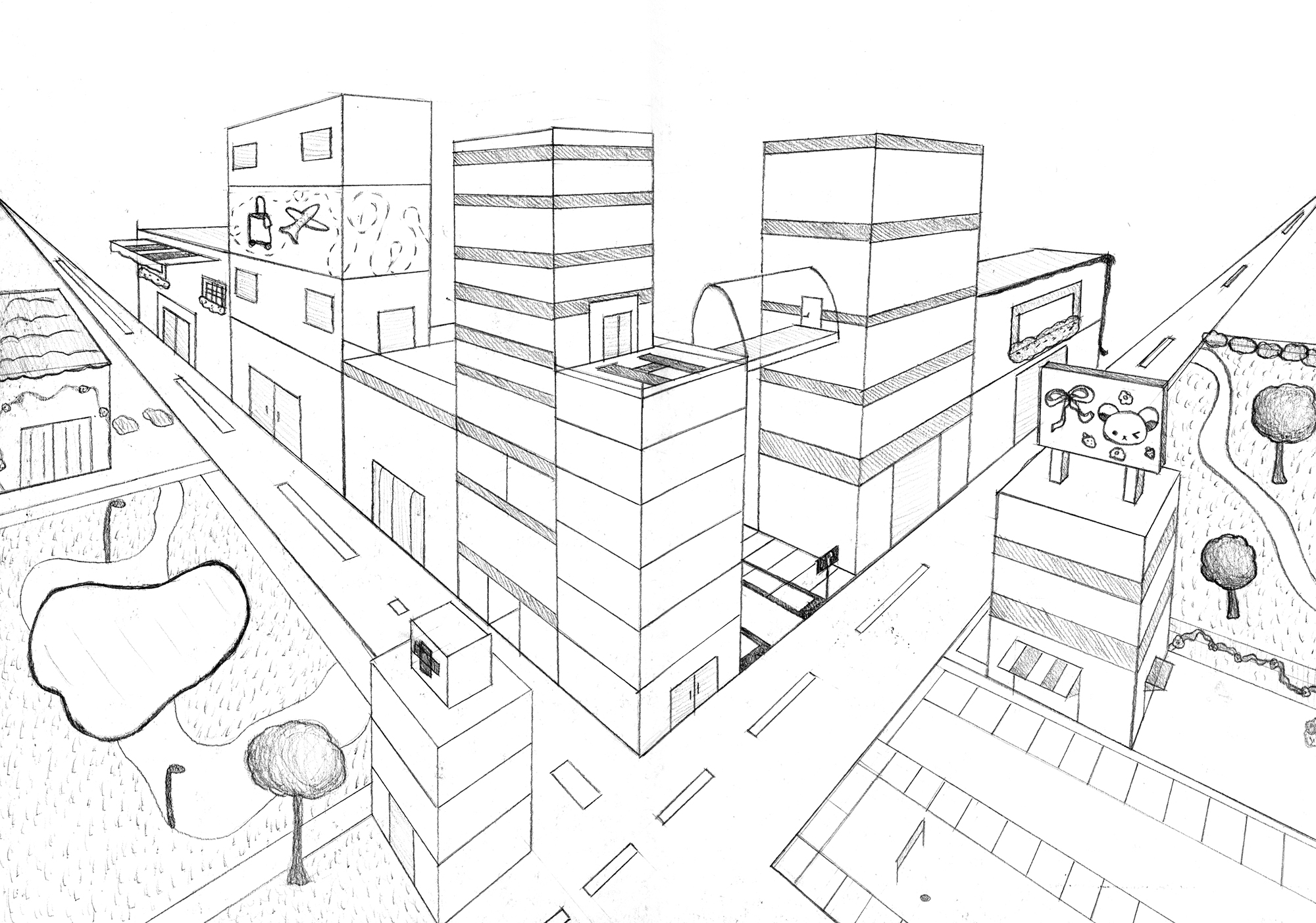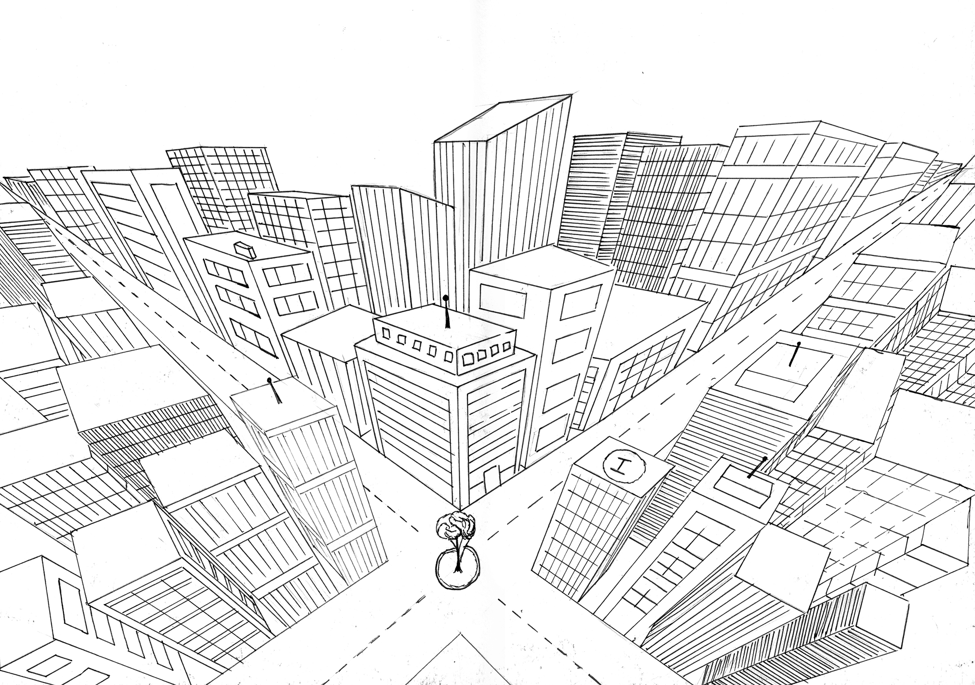 Bei dieser Übung sollte vor allem die Beobachtungsgabe und die Fähigkeit dreidimensionale Eindrücke auf ein zweidimensionales Medium zu übertragen geschult werden. Hierfür begannen wir zunächst mit Übungen zu Perspektive und arbeiteten mit einem, dann zwei und schließlich drei Fluchtpunkten.