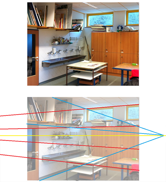 Nach theoretischen Übungszimmern versuchten die Schülerinnen und Schüler reale Raumsituationen umzusetzen. Dabei nahmen sie unterschiedliche Positionen ein und erfuhren wie Motive oberhalb der Horizontlinie in Froschperspektive erscheinen während Gegenstände darunter aus der Vogelperspektive zu sehen sind.