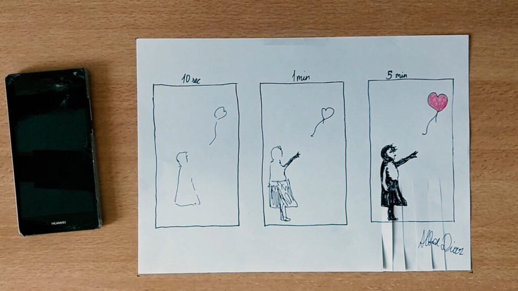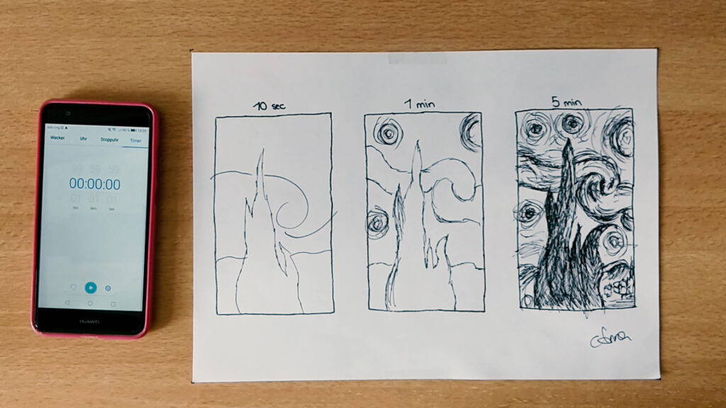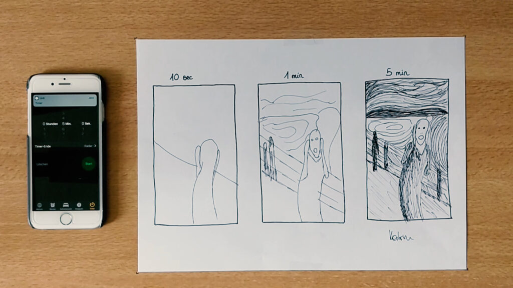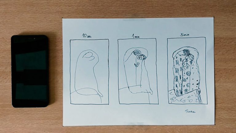 Gut Ding braucht Weile. Aber ist es möglich die wichtigsten Informationen auch in ganz knapp bemessener Zeit zu transportieren? Dieses Experiment wagten die Schülerinnen der 8A, als sie versuchten bekannte Werke der Kunstgeschichte in 10 Sekunden oder einer Minute zu skizzieren. Im Fokus stand dabei sowohl die Reduktion der vielen Informationen auf das nötige Minimum, als auch die technische Fertigkeit, diese so schnell wie möglich auf Papier zu bringen. Die Ergebnisse hielten wir in diesem Timelapse-Video fest: