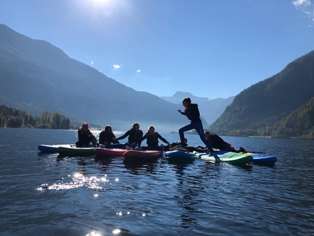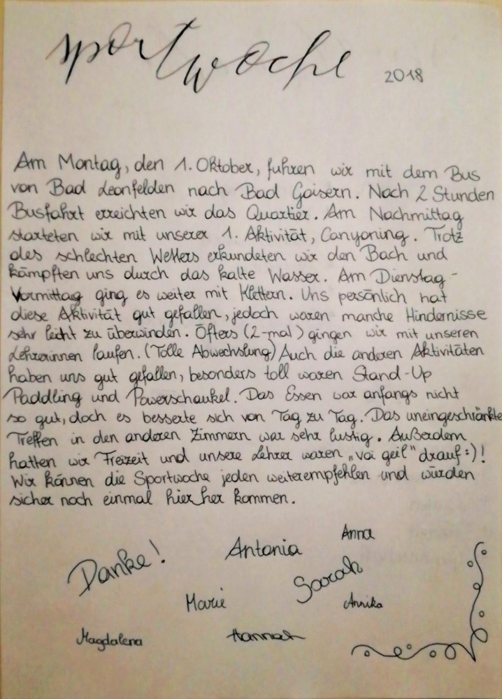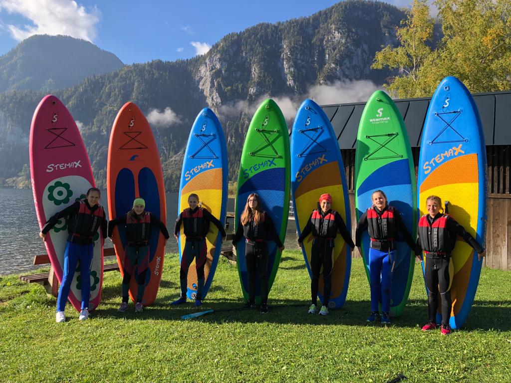 Bereits zum dritten Mal fand die Sport- und Kennenlernwoche der 5. Klassen unserer Schule von 1. – 5. Oktober 2018 in Bad Goisern statt. Das schlechte Wetter zu Wochenbeginn wurde durch viel Motivation von Seiten unserer Schülerinnen und Schüler wettgemacht. Die professionellen Guides der Organisation OUTBACK führten unsere Jugendlichen in die unterschiedlichsten Outdooraktivitäten ein, wie z. B.: Abseilen, Canyoning, Stand Up Paddling und Powerschaukel. Das erforderliche Durchhaltevermögen wurde durch die gute Verpflegung und die Gastfreundlichkeit des Luise Wehrenfennig-Hauses unterstützt. Die abschließende Gebirgswanderung bei strahlendem Sonnenschein rundete eine gelungene Sportwoche perfekt ab.