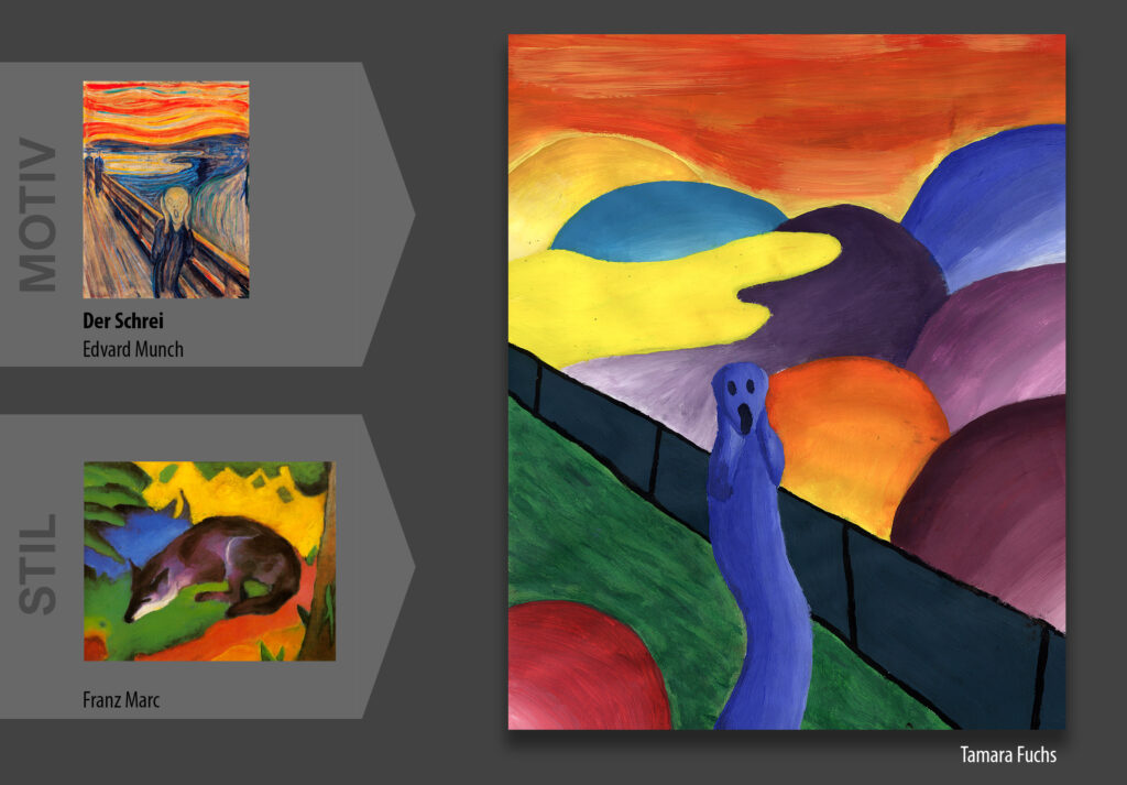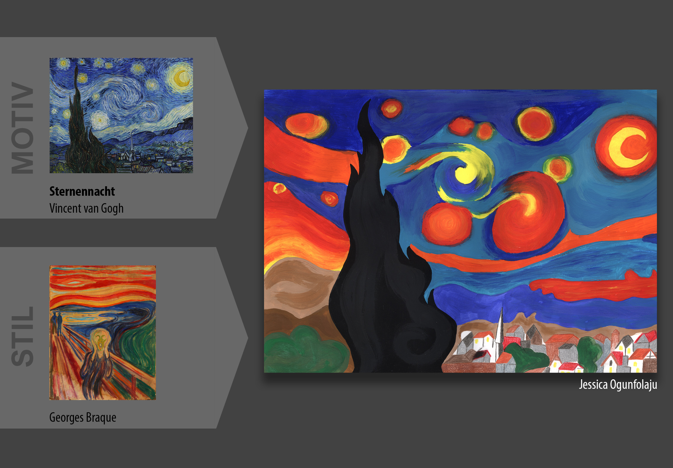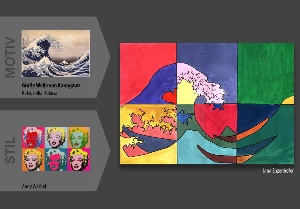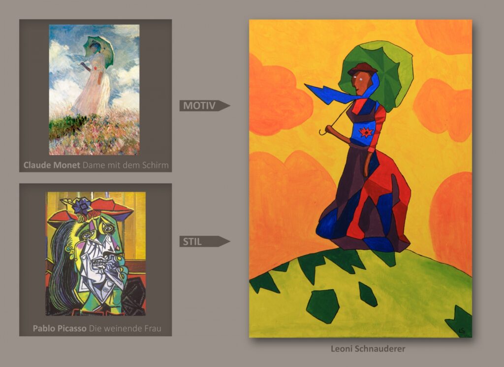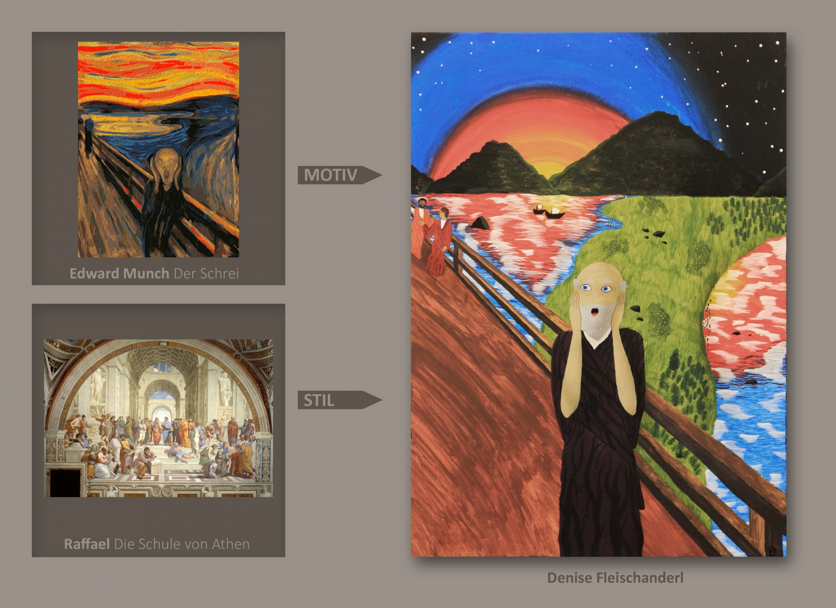 Mit Fragen dieser Art haben sich die Schülerinnen und Schüler der 7A auseinander gesetzt. Die Aufgabe bestand darin, ein bekanntes Werk aus der Kunstgeschichte zu wählen und das gleiche Motiv im Stil eines Künstlers einer anderen Stilepoche umzusetzen. Ein spannendes Experiment mit oft überraschendem Ausgang.