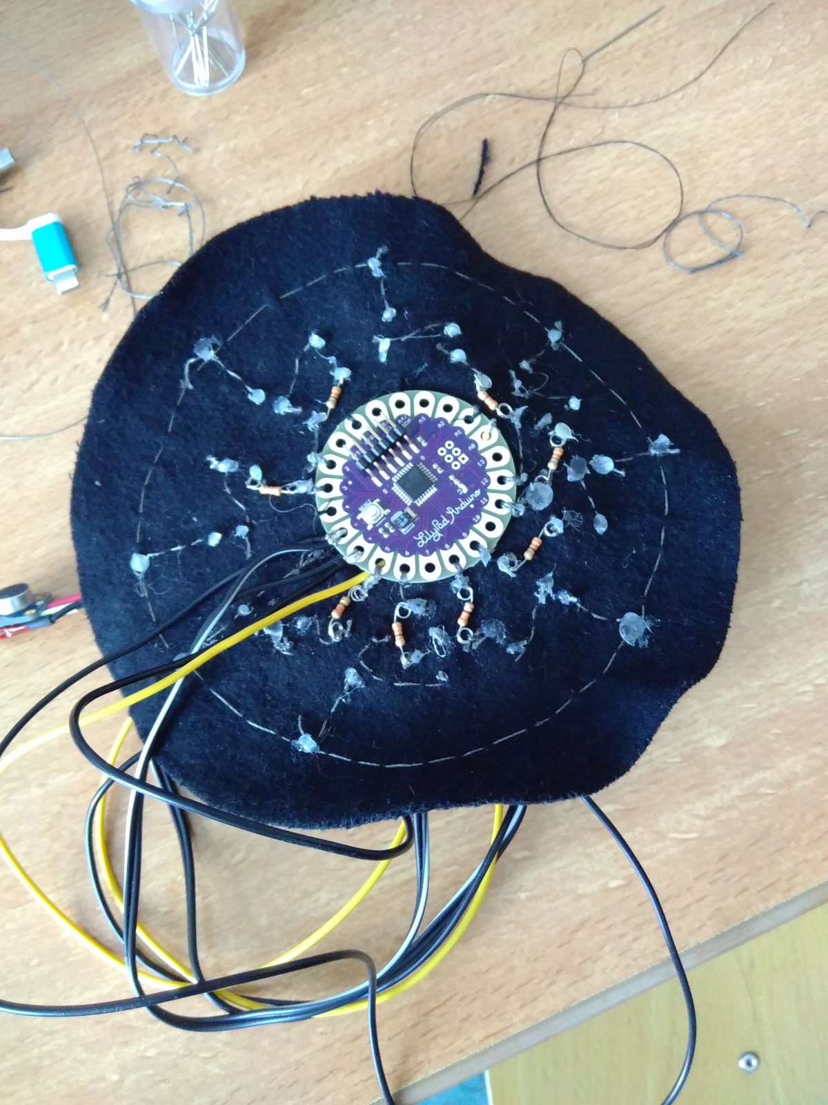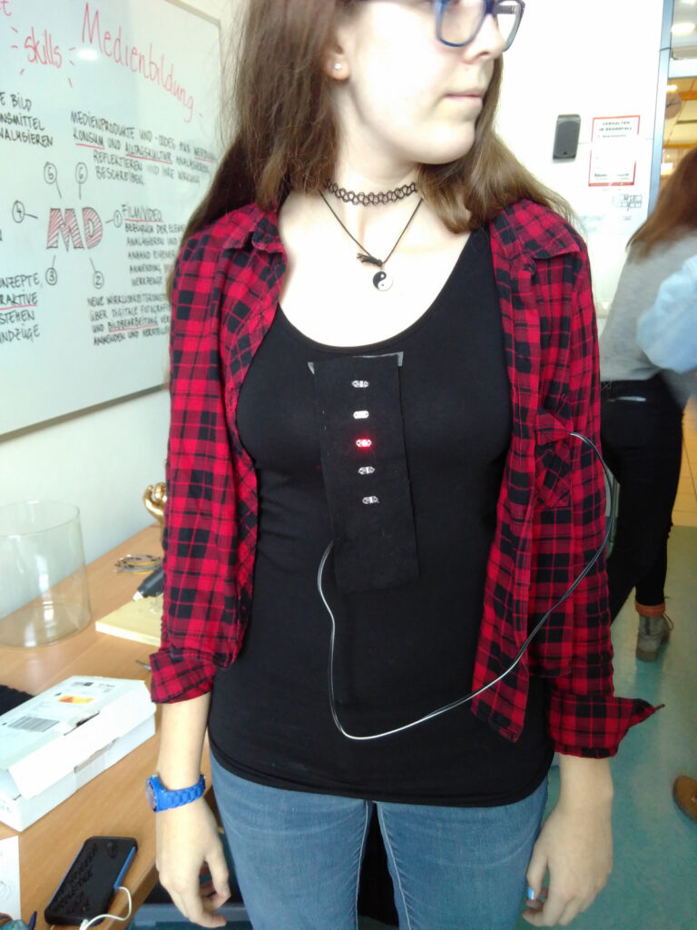 Mit Arduino, LillyPad, Mikrofon und vielen LEDs haben die Schülerinnen der 7C interaktive tragbare Textilien kreiert, die visuell auf die Musik reagieren. Vom Nähen mit leitfähigen Fäden und Löten der Pins bis zum Recherchieren des Codes und dem Programmieren der Einplatinenrechner waren viele Schritte und Fehlversuche notwendig, bis es dann für den “unARTig“-Abend schlussendlich verwendet werden konnte.