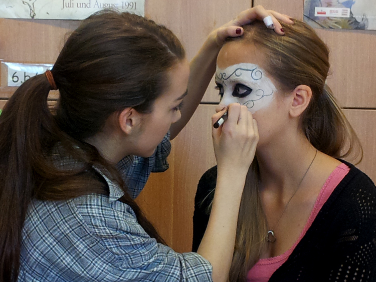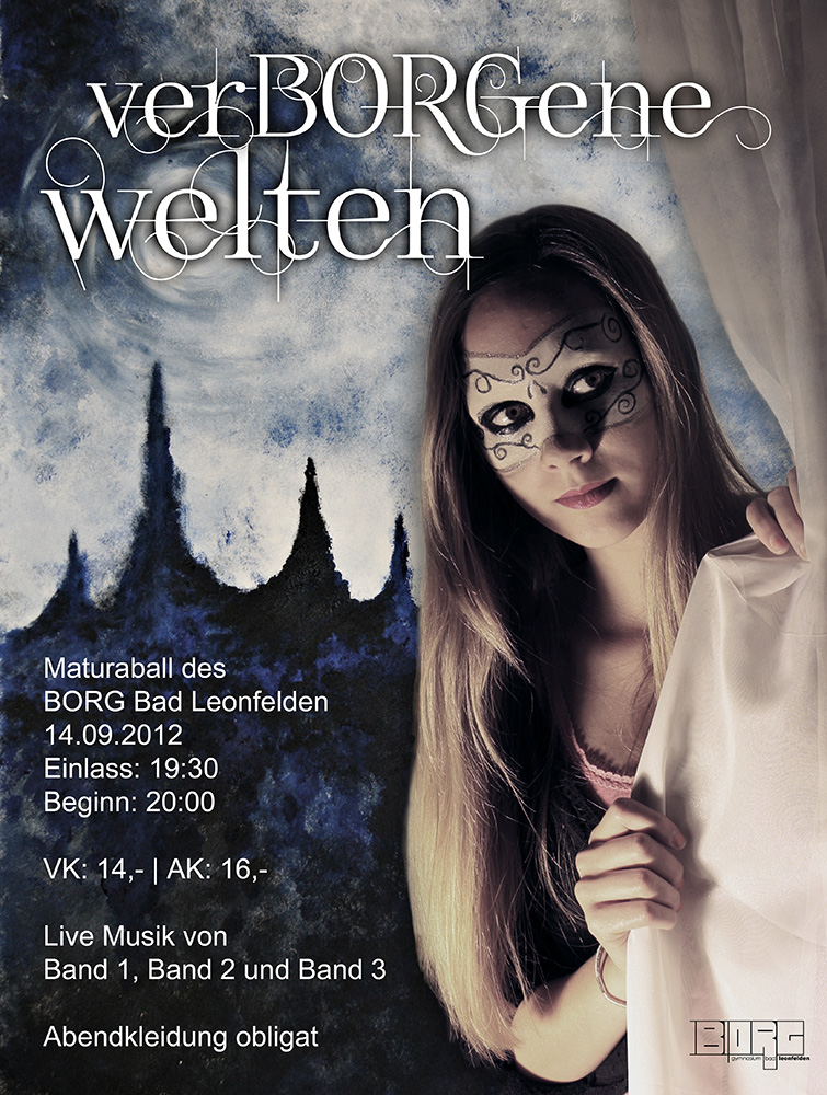 „Verborgene Welten“ lautet das heurige Motto des Maturaballs. Genauso mystisch wie es der Titel vermuten lässt sollte auch das Design des Plakats und der Eintrittskarten werden. Die Idee der Schülerinnen: Eine fantasievoll geschminkte junge Dame die verstohlen hinter einem Vorhang hervorschaut und den Blick auf eine mysteriöse Landschaft freigibt.