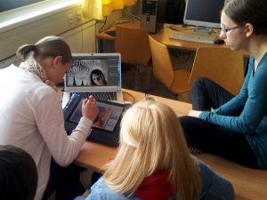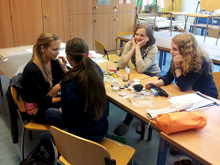 Die Landschaft, die sich hinter der mysteriösen Dame erstreckt wird durch eine Malerei dargestellt. Auch hier hatten die Schülerinnen wieder mehrere Varianten angefertigt und auch hier fiel die Wahl nicht leicht. Da dieses Plakat nicht offiziell im Unterricht erstellt wurde arbeiteten alle Beteiligten äußerst selbstbestimmt und ohne permanente, konkrete Anweisungen. Auf das Ergebnis können alle sehr stolz sein!