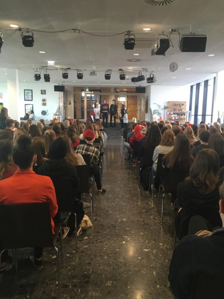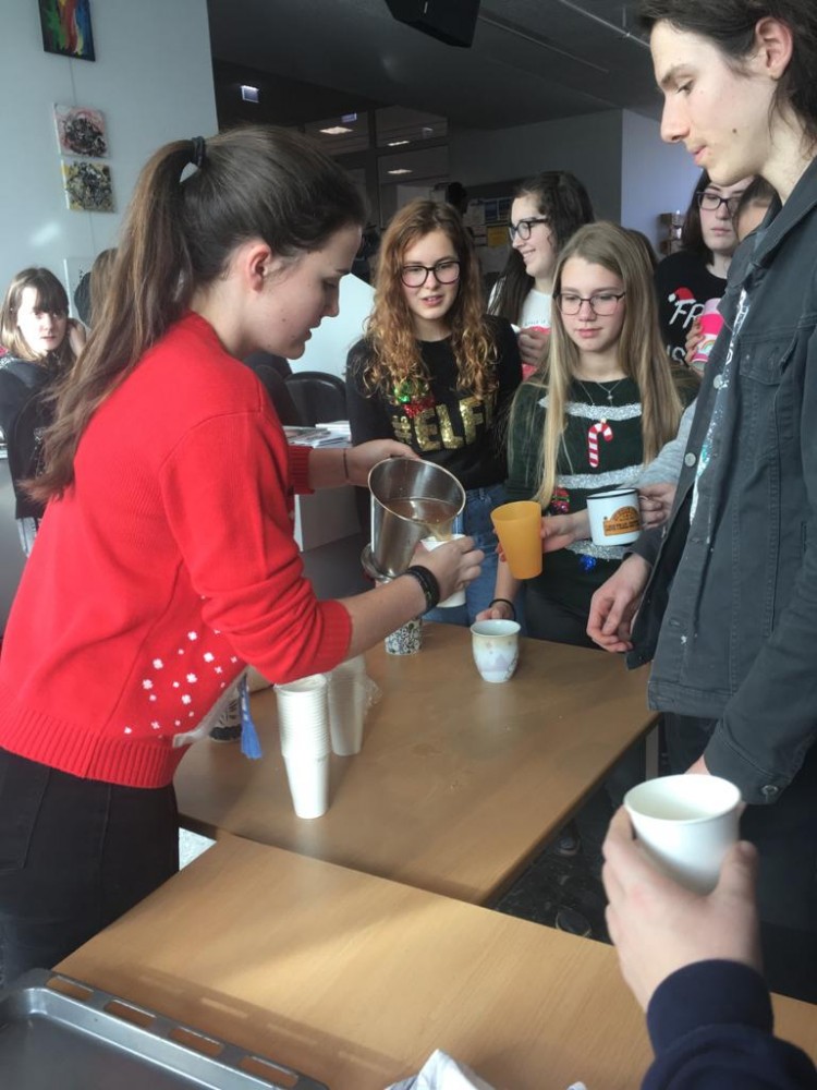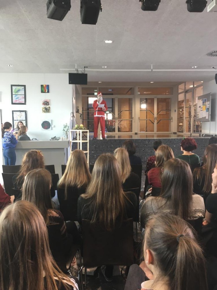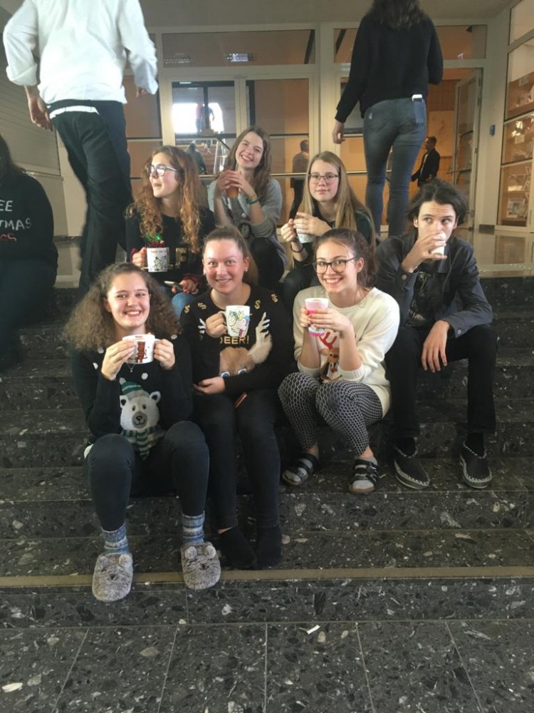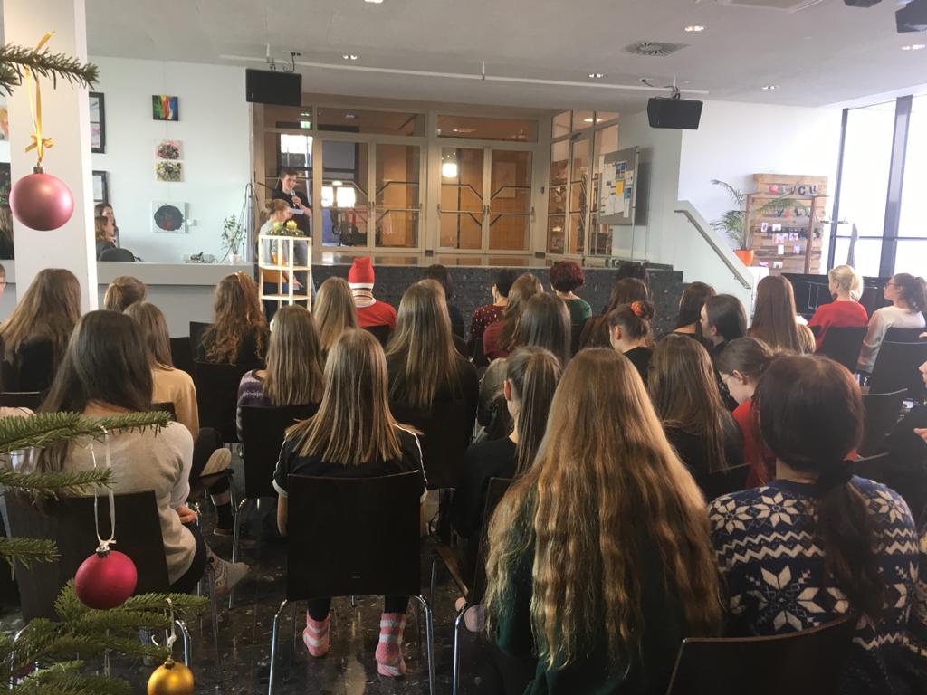 Unsere diesjährige Weihnachtsfeier fand gemeinsam mit allen Schülerinnen und Schülern, sowie mit allen Lehrerinnen und Lehrern in der Aula statt. Um alle Anwesenden in Weihnachtsstimmung zu bringen, wurden Weihnachtslieder gesungen und Geschichten vorgetragen. Danach versammelten sich die SchülerInnen, um gemeinsam zu dem Lied „Rudolph The Red Nosed Reindeer“ zu tanzen. Zum Abschluss gab es für alle alkoholfreien Punsch und mitgebrachte Kekse. So konnte man den letzten Schultag vor den Ferien perfekt ausklingen lassen.