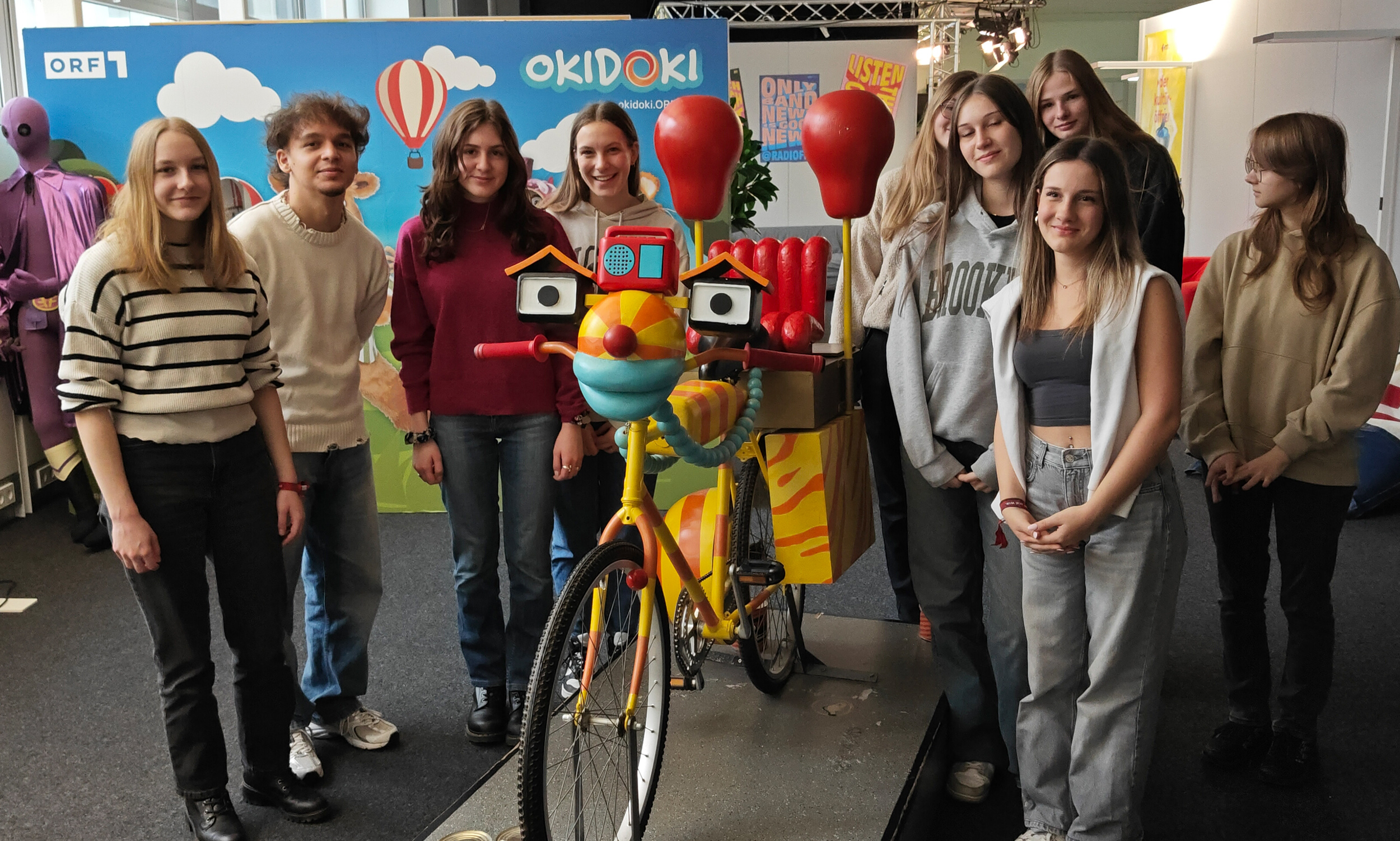 Anlässlich der Nominierung unseres Videoprojekts „Dance Monkey“ beim Best Austrian Animation Festival verbrachten unsere Medien-Künstler:innen der 7C zwei aufregende Tage in der Bundeshauptstadt. Gleich zu Beginn stand dabei ein Besuch des ORF-Zentrums am Küniglberg inklusive Backstage-Führung auf dem Programm. Es war spannend, hinter die Kulissen und in den Fundus zu blicken sowie vieles selbst auszuprobieren.