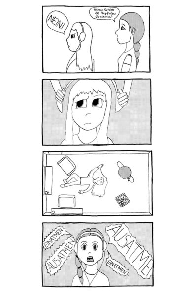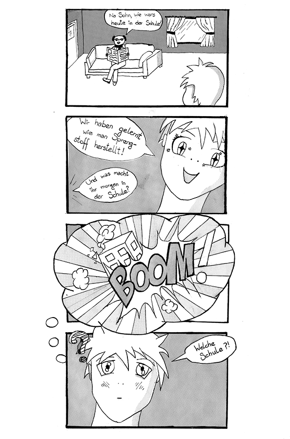 Für die Zeichnungen verwendeten wir ganz klassisch Tusche und Spitzfedern. Um der typischen Optik von Mangas stärker Rechnung zu tragen, haben die Schülerinnen und Schüler hierbei auch mit echten Rasterfolien gearbeitet. Dabei wird eine dünne Folie, die mit einem unterschiedlich dichten Punktraster bedruckt ist, auf einzelne Flächen der Zeichnung geklebt. Der Überstand wird dann mit einem Messer vorsichtig abgetrennt und entfernt. zurück bleibt eine grau gefüllte Fläche. Unterschiedliche Folien ermöglichen so auch eine einfachere Realisierung von Hell-Dunkel-Kontrasten.